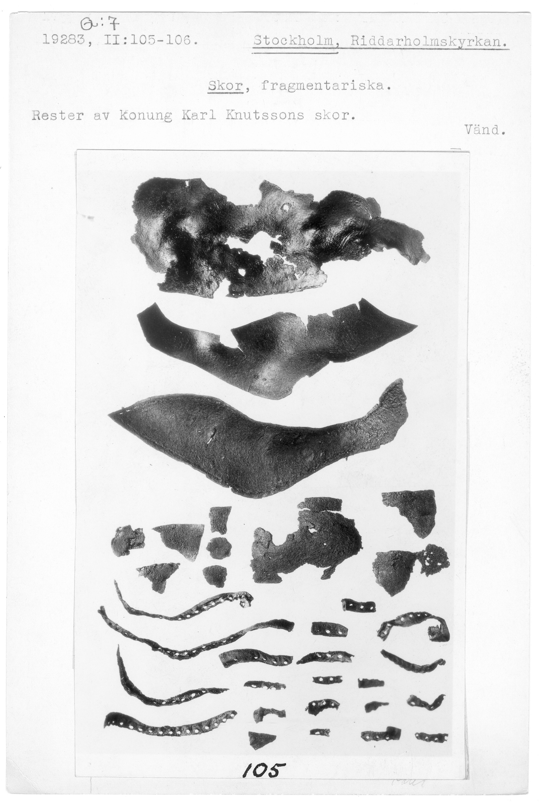 Sko av läder med yttersula, ovanläder och rem, fragmenterad. Rester av Karl Knutssons högra sko.