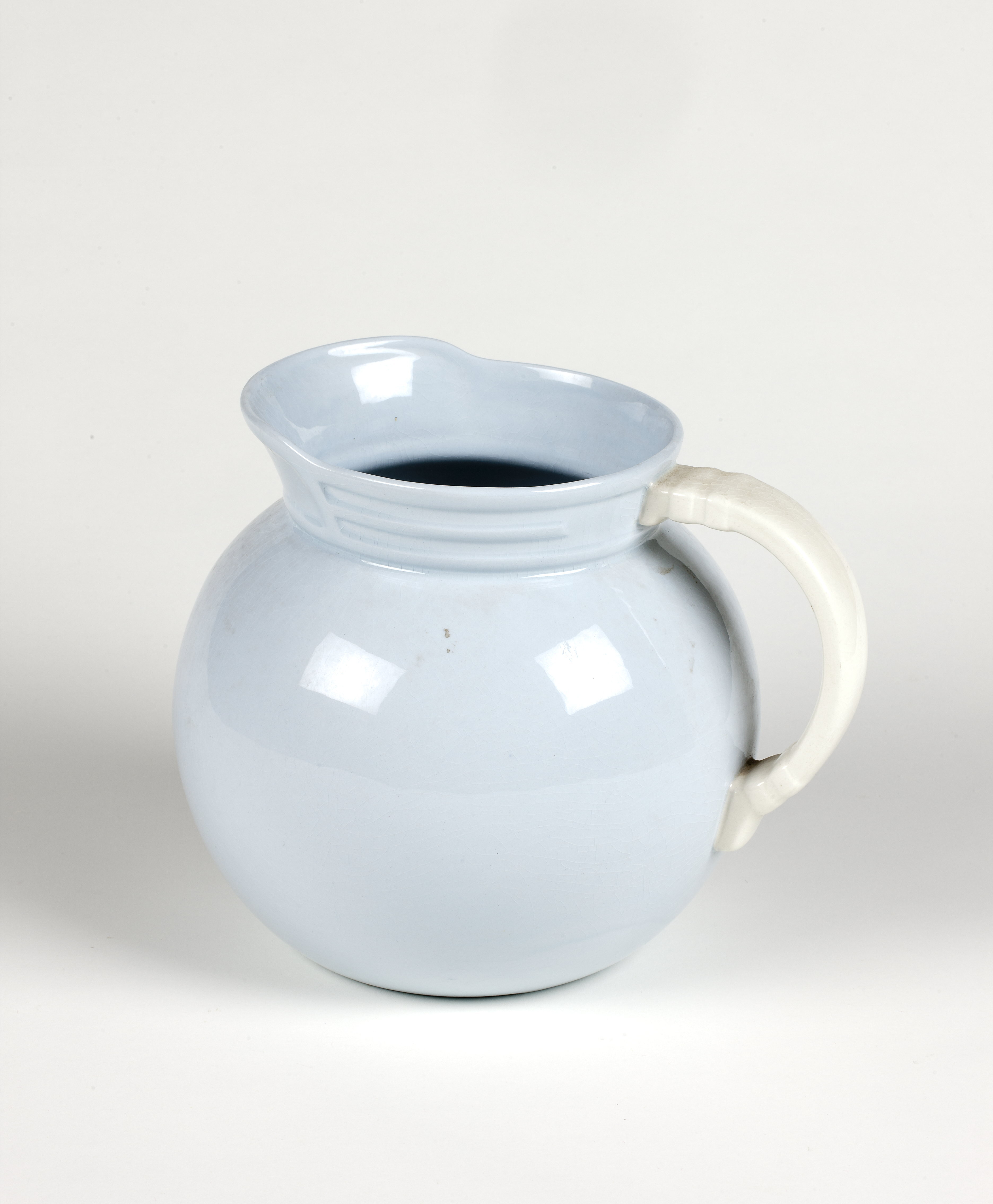 Sfärisk handkanna av flintporslin , ljusblå glasyr , vitt handtag.