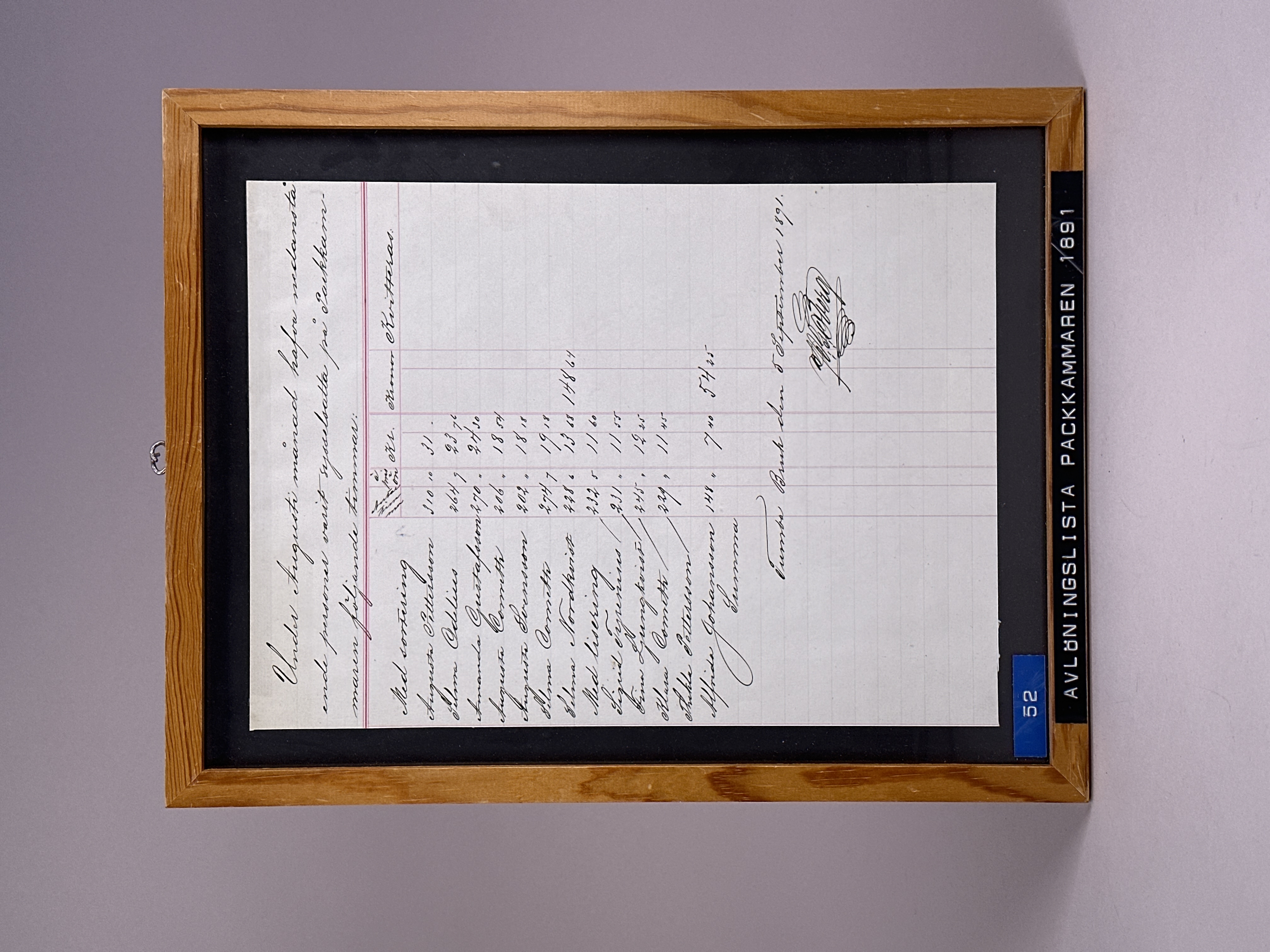 Avlöningslista från Tumba bruk. Avlöningslistan skrevs den 5 september 1891 och avser lönen för arbetet i packkammaren under augusti månad samma år. På listan omnämns tolv kvinnor, deras inarbetade timmar, timlön samt slutgiltiga lön. På listan går det att utläsa att arbetarna har arbetat mellan 310 till 148 timmar, med en timlön mellan 10 till 5 öre. Avlöningslistan är handskriven med svart bläck på vitt papper, placerad innanför ram av trä. Ramens framsida i glas och baksidan i papp. Ramens övre list med ögla i metall för upphängning.