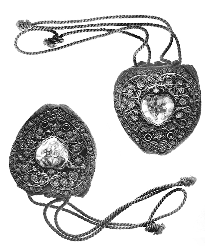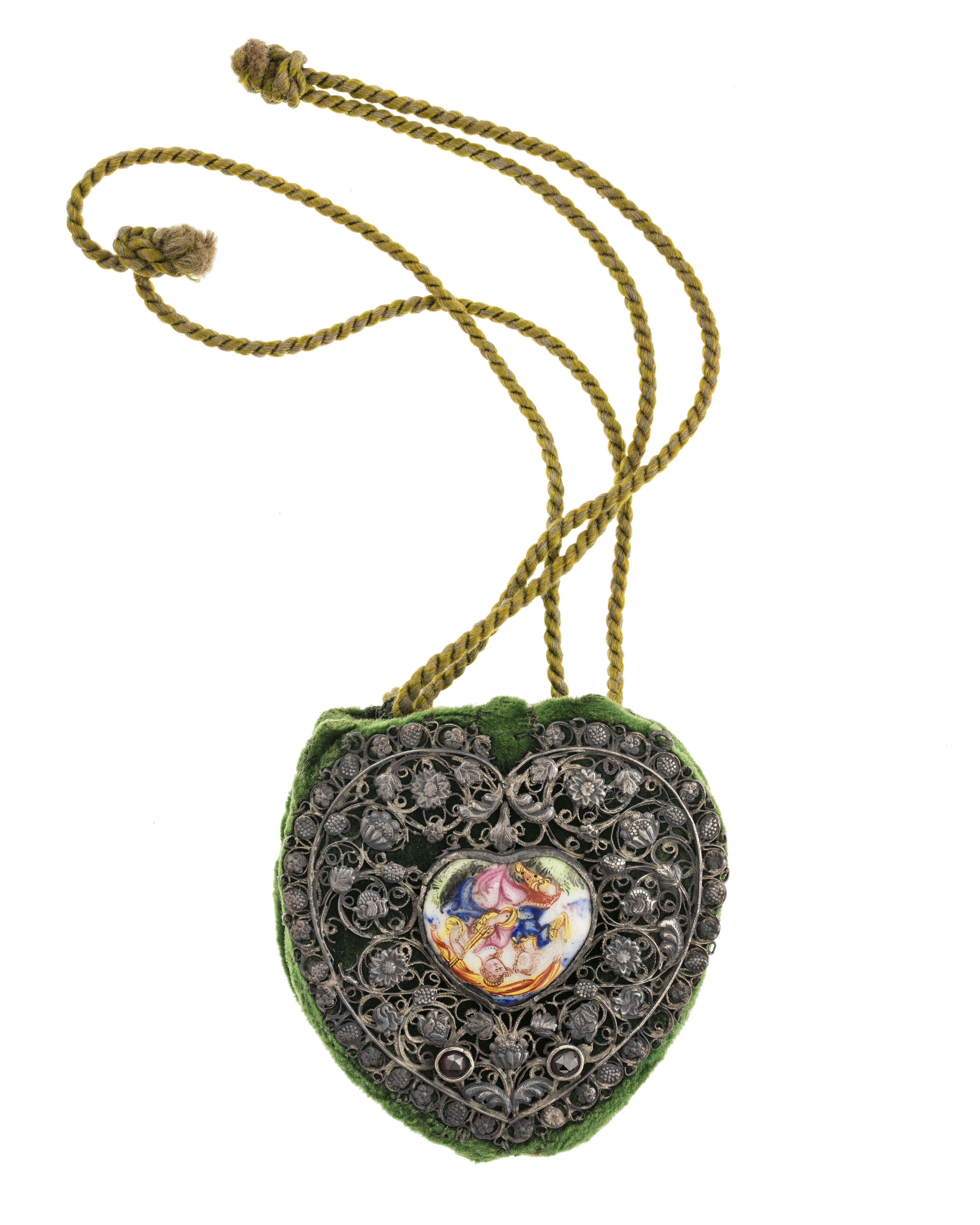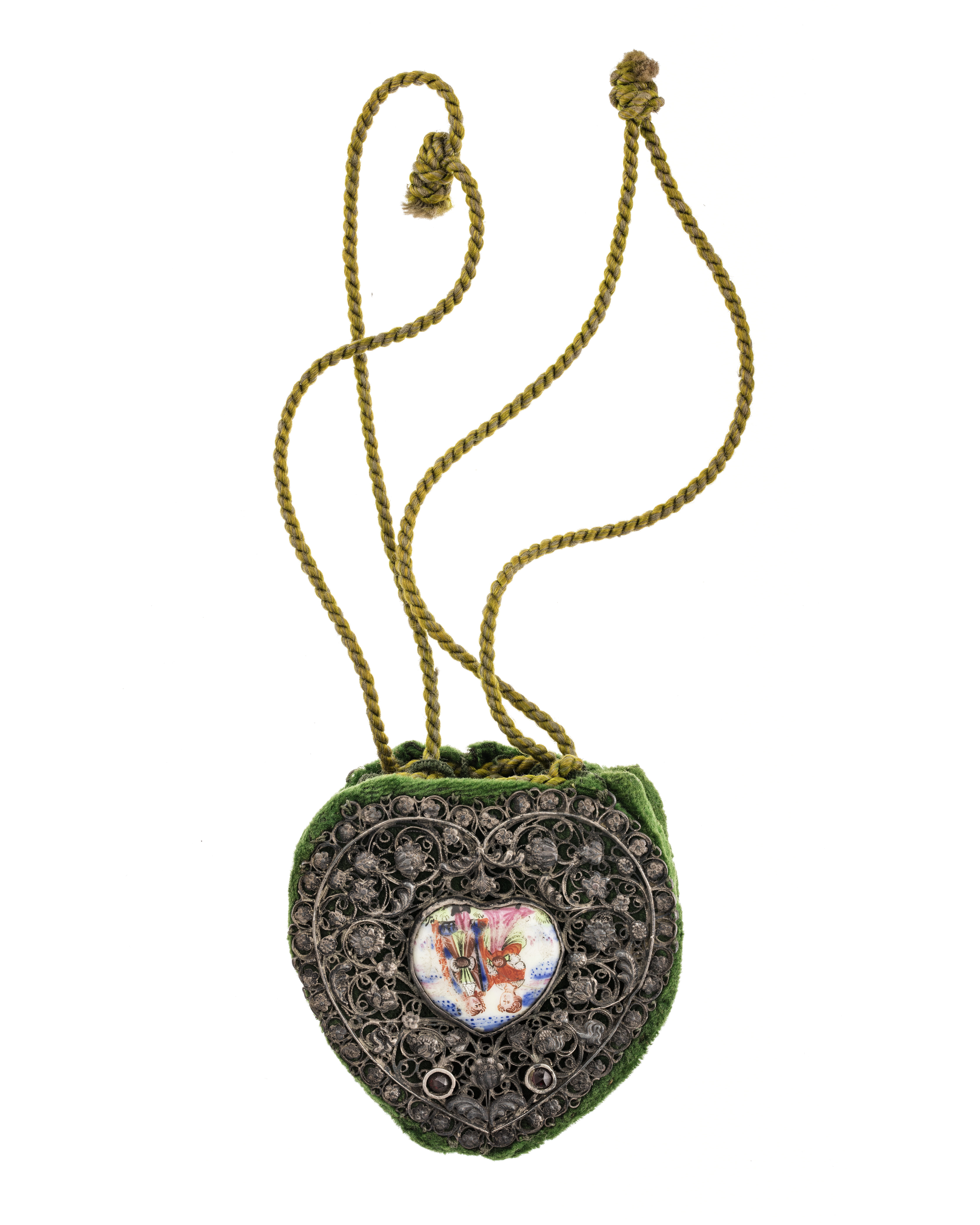 BÖRS. Av sammet med emalj, silver i filigran och böhmiska granater. Bestående av två hjärtformiga skivor, klädda med samt sammanhållna vid kanten av grön sammet. I övre kanten en ljusgrön tvinnad snodd löpande i tränsade öglor. Vadera skivan omgiven av ett filigranornament av silver med blad och blommor av olika slag. Tyskt arbete frÂn 1600-talets slut eller 1700-talets början. Inköpt av Wilhelmina von Hallwyl juli 1896 från antikvitetshandlaren Ed Kahlert, Tyskland.
