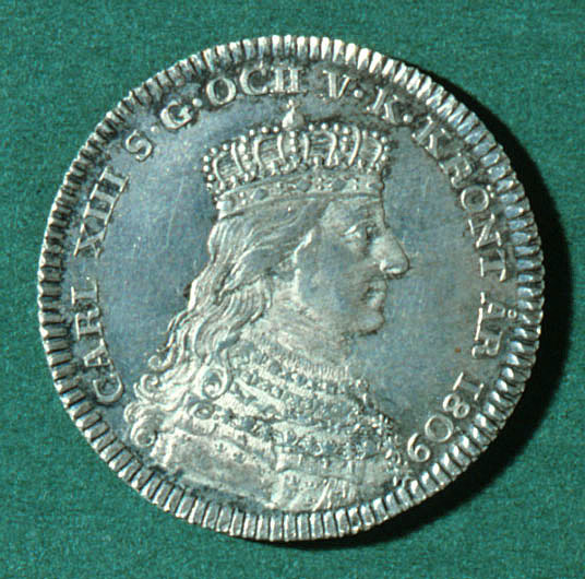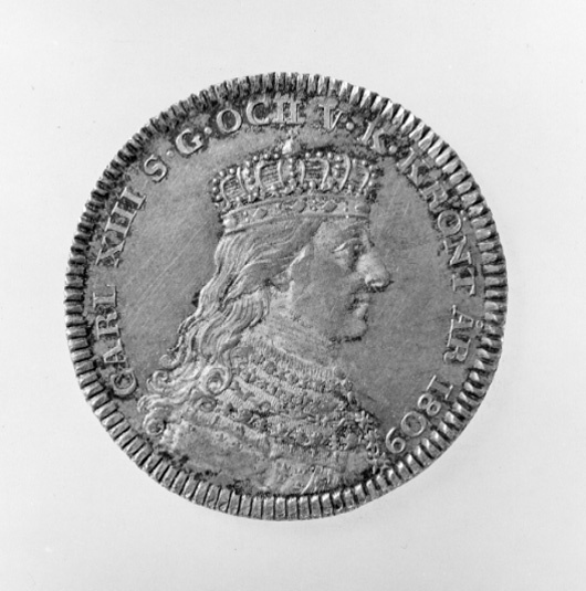 Kastpenning från konung Karl XIII:s (1748-10-07 - 1818-02-05) kröning i Stockholms storkyrka 1809-06-29. Oregelbundet runt mynt av silver, 7:e storleken. Åtsida: Karl XIII, bröstbild, profil h, utslaget hår, krona, mantel, de fyra ordnarnas kedjor, text: "CARL XIII S.G.OCH V.K.KRÖNT ÅR 1809". Frånsida: Text: "FOLKETS VÄL // MIN // HÖGSTA LAG", omgivet av lagerkrans. Räfflad kant, vinkelräfflad rand.