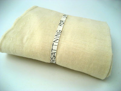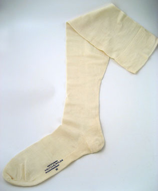 Beige, knälång strumpa av samspunnen helylle-nylon. Strumpan är formsydd och maskinstickad med söm mitt bak, som löper ner under foten samt tå- och hälsöm. Strumpan har förstärkt tå, häl och under foten. Under foten finns blå, tryckt text: "SAMSPUNNEN // HELYLLE/NYLON // NYLONFÖRSTÄRKT // 10". Längst upp finns en 83 mm bred fåll. Troligen rekvisita inköpt till utställningen Vasasamlingen i Ornässtugan 1958-1959.