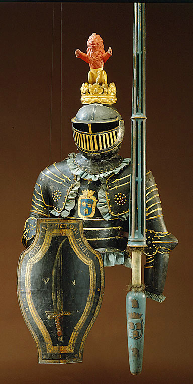 Tornerhjälm i förtent bleckplåt. Prydnad i form av ett lejon målat i rött och guld som ursprungligen hade en svart orm i vardera tassen. Rustningens samtliga delar är svartlackerade med förgyllda kanter, bröst- och ryggharnesk dekorerade med grevliga ätten Lewenhaupts krönta hjärtvapen.