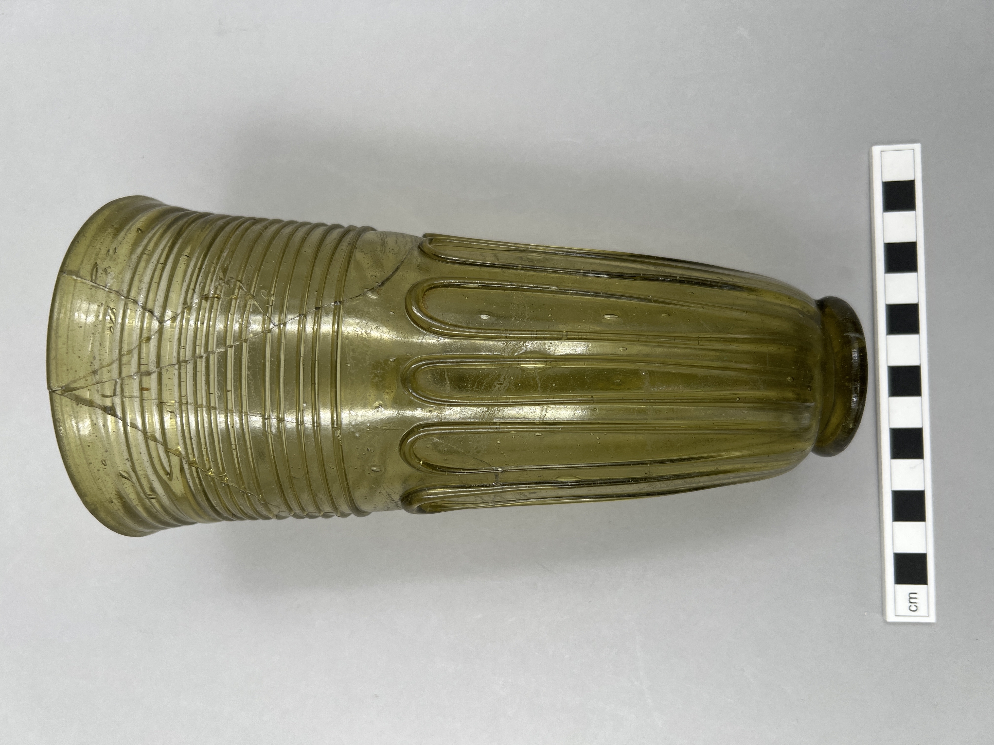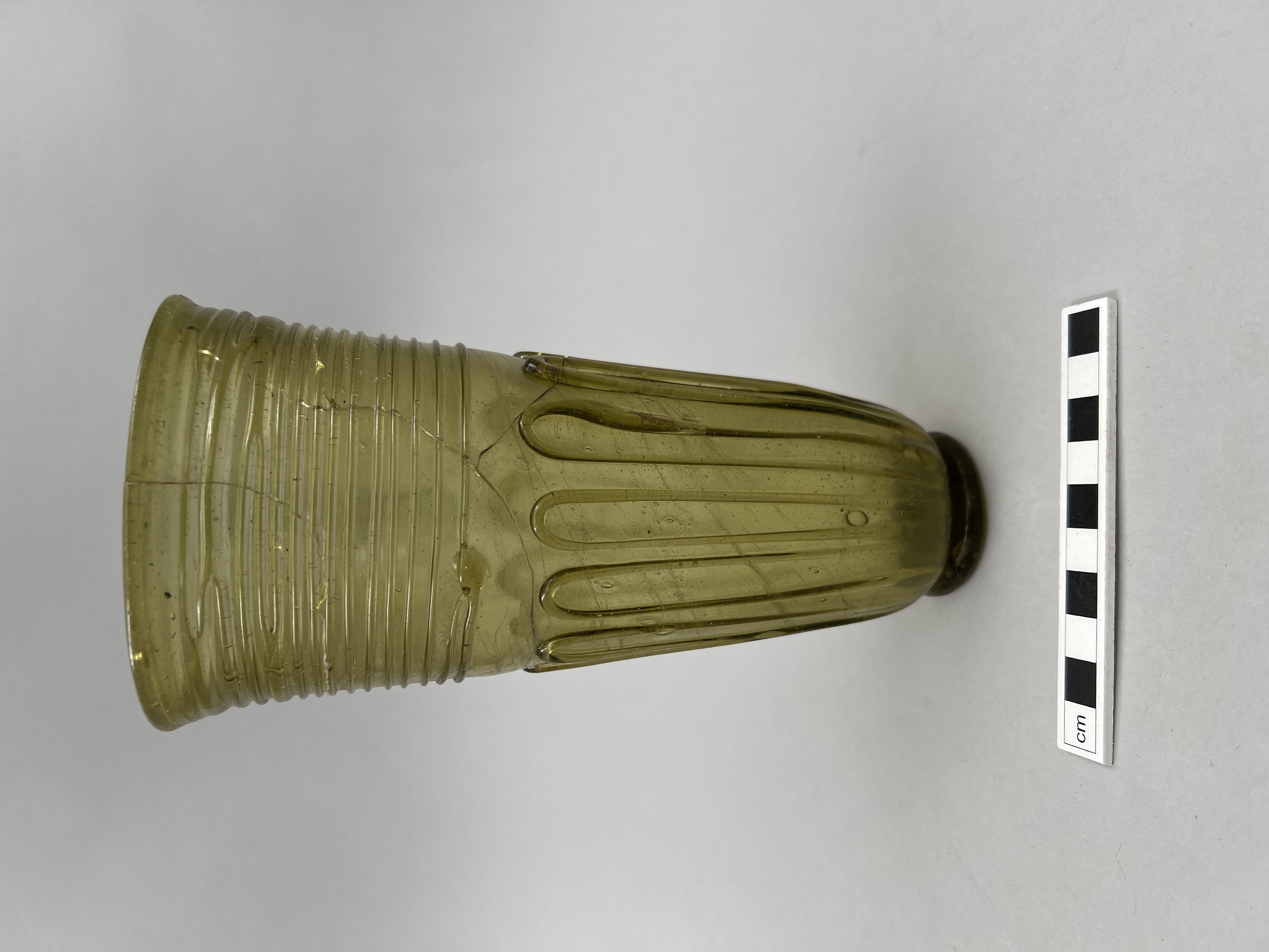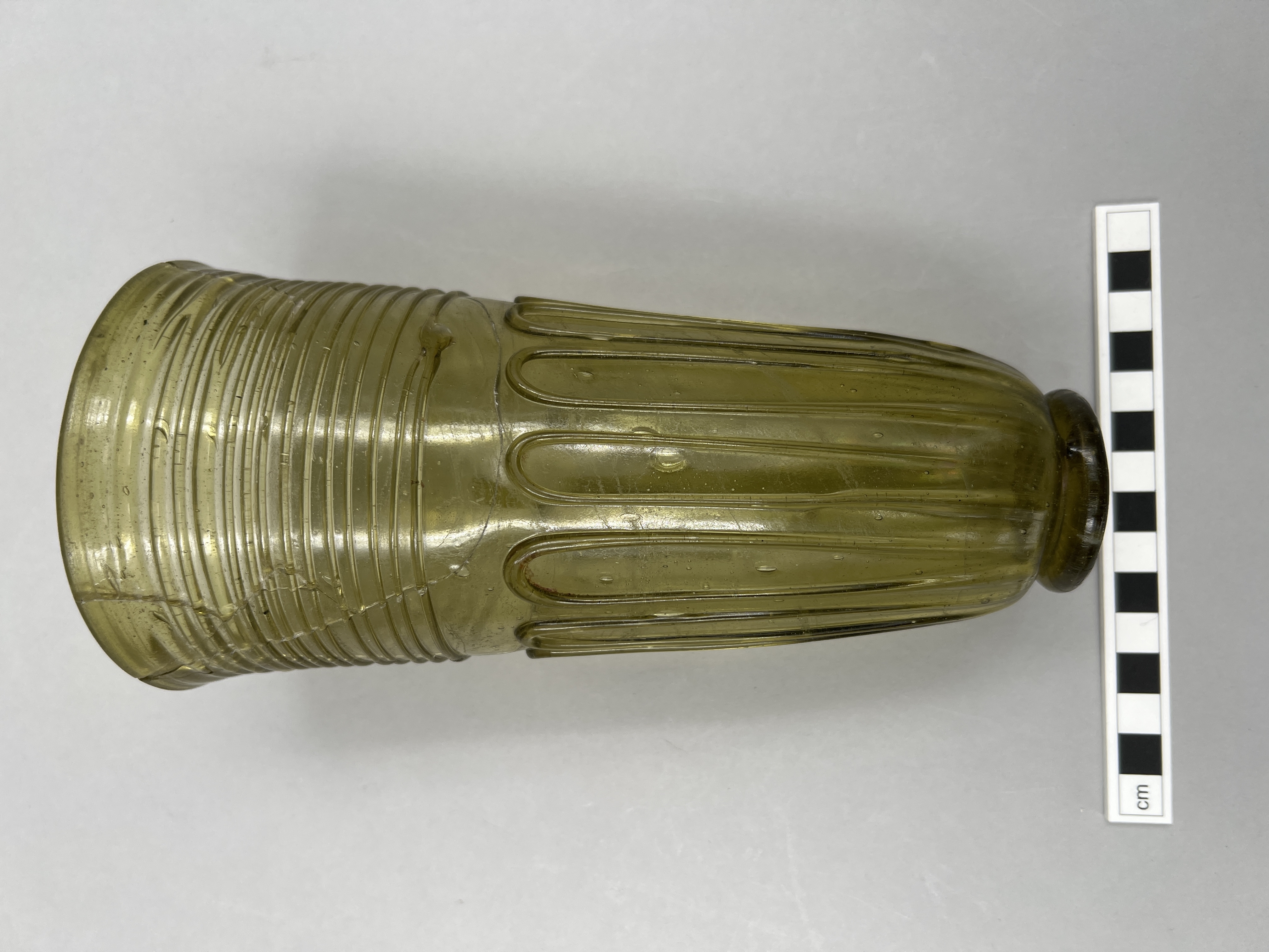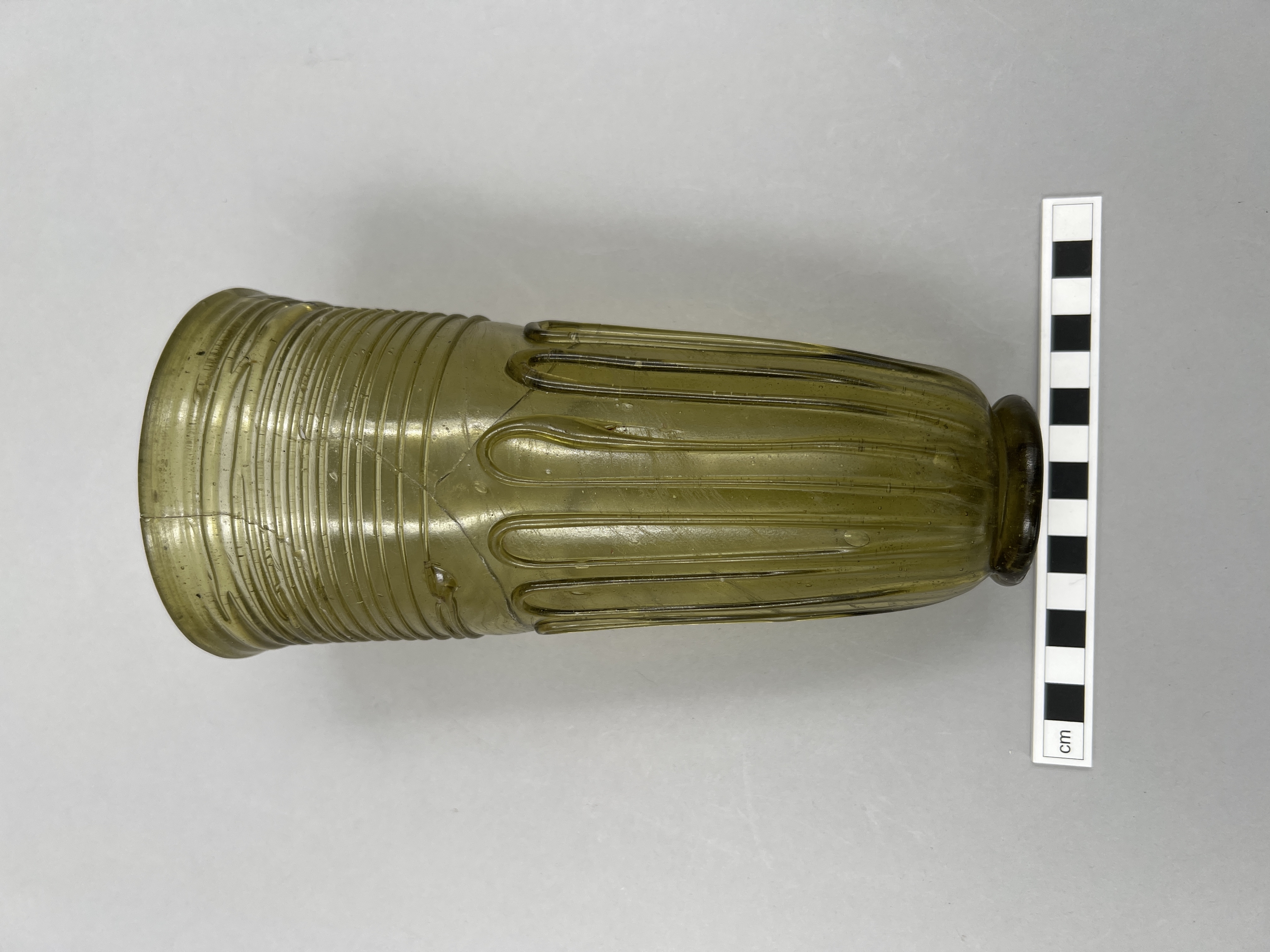 Gult glas med pålagda öglor på buken och horisontella trådar på halsen.