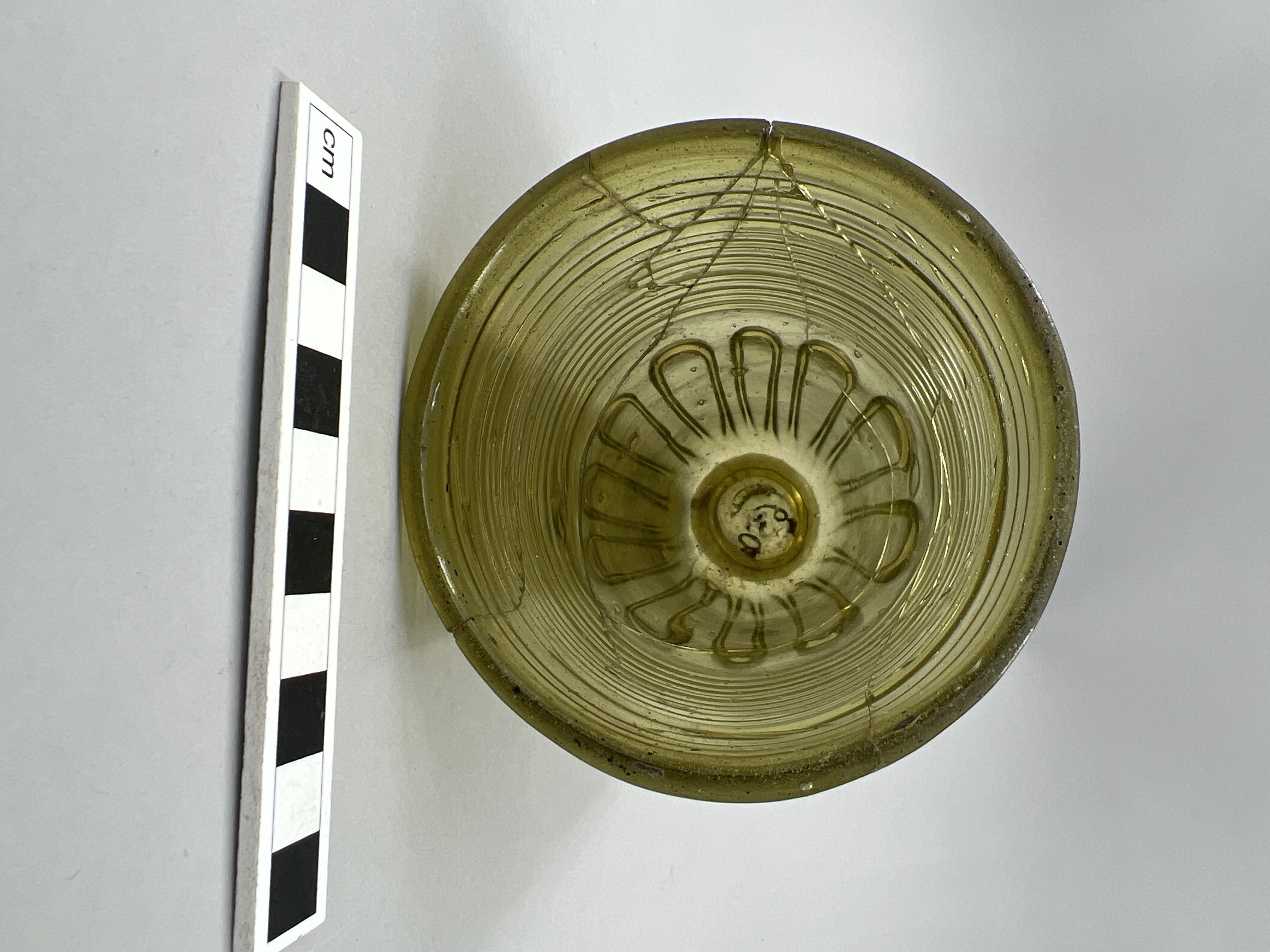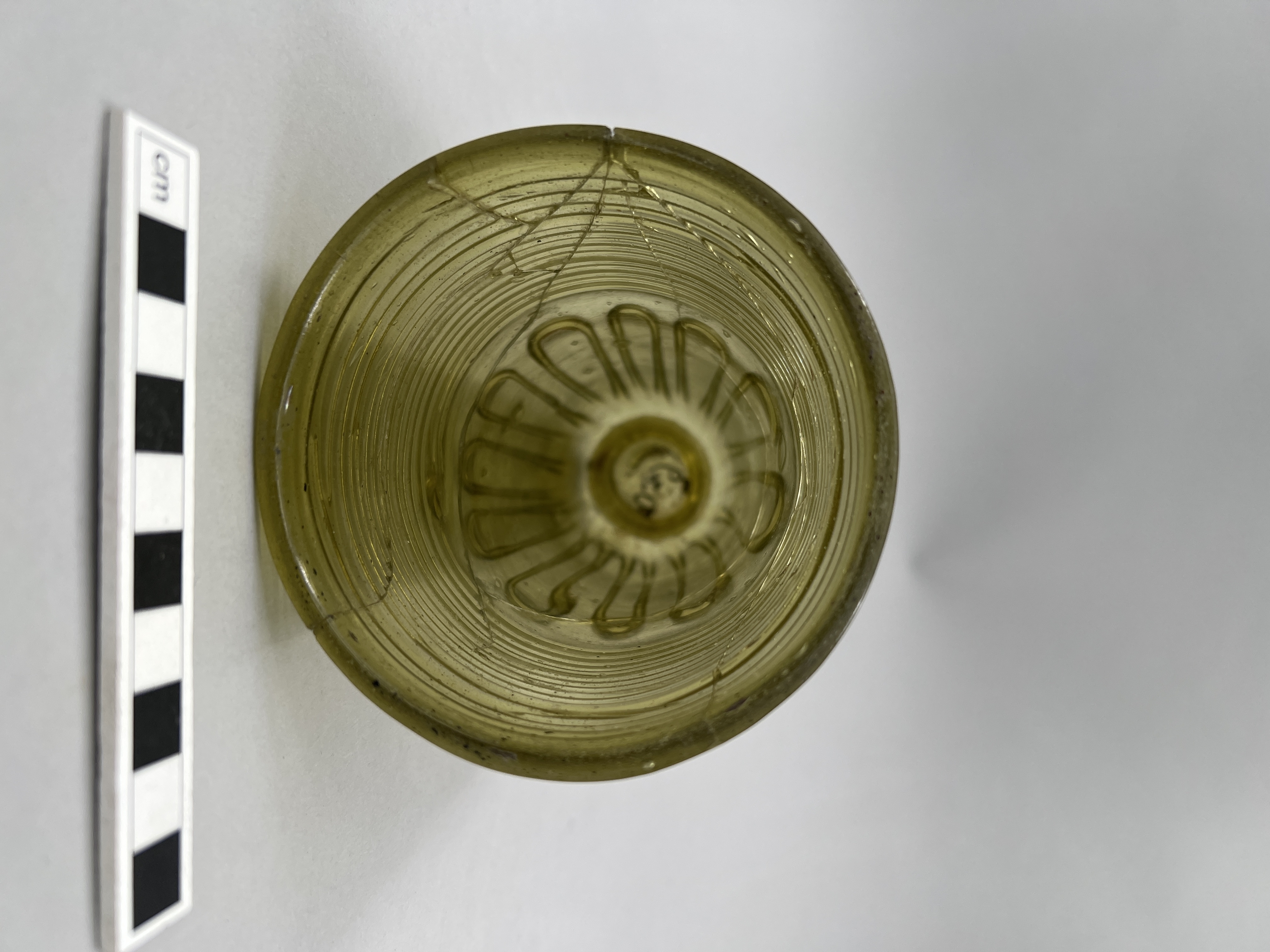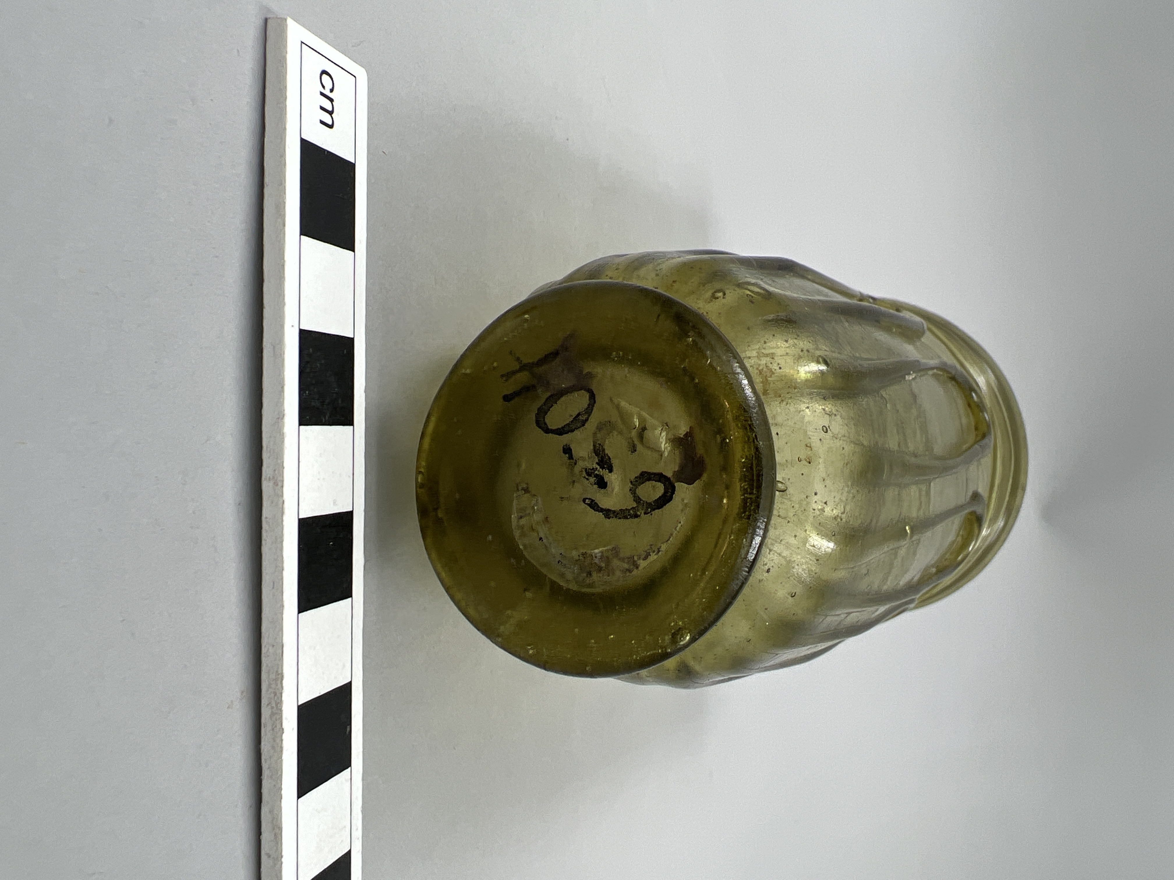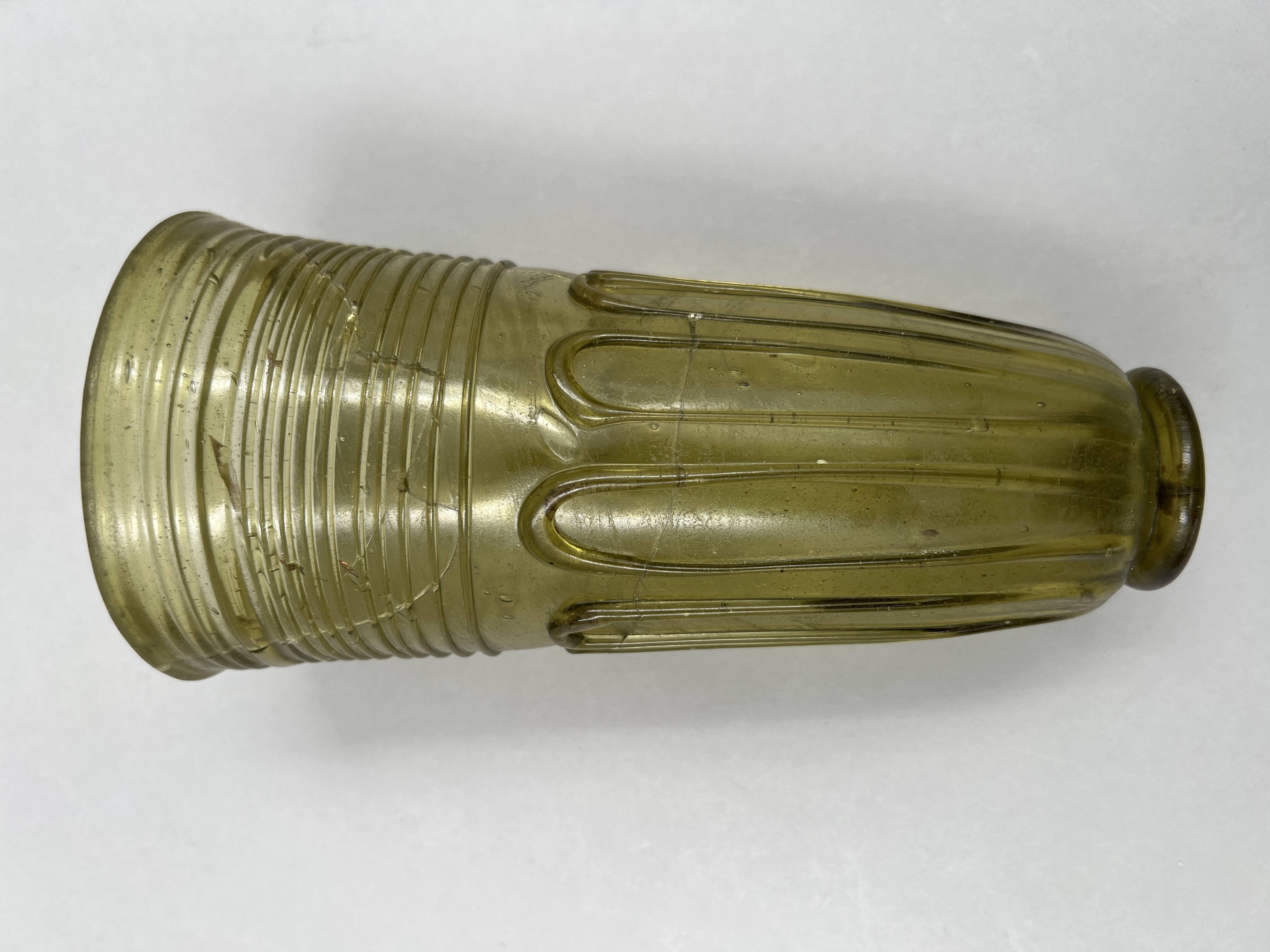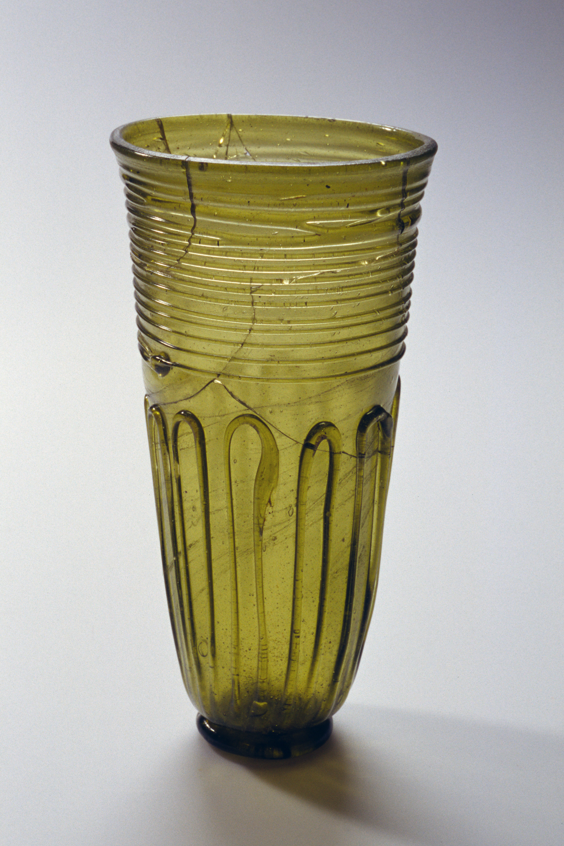 Gult glas med pålagda öglor på buken och horisontella trådar på halsen.