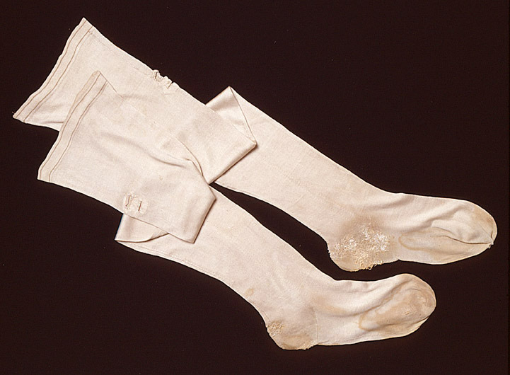 Burna av Gustav III vid attentatet på operan den 16 mars 1792. Stickade strumpor i tunt silke med söm mitt bak. Formsydda efter fot och vader och hopsydd i tån. Tunn fåll upptill med två mörkare ränder som dekor. Nedvikta upptill. Högt upp på benen finns två knapphål under varandra. Knapphålen sitter 14,5 resp 13 cm från kanten upptill och nästan mitt fram, aningen mot yttersidan om mitten. De är förstärkta på avigsidan med tunna smala sidenband som lagts kant i kant med hålen och sytts fast på baksidan. På benets utsida från fotknölen och uppåt finns en 18 cm lång dekorstickning bestående av två mönsterlinjer som krönts av ett n. Anmärkning: De två knapphålens placering stämmer väl mot knapphålen under ficklocken på byxorna. Var det så att ett band drogs igenom dessa hål för att hålla strumporna på plats? Strumporna är mycket stoppade och lagade.