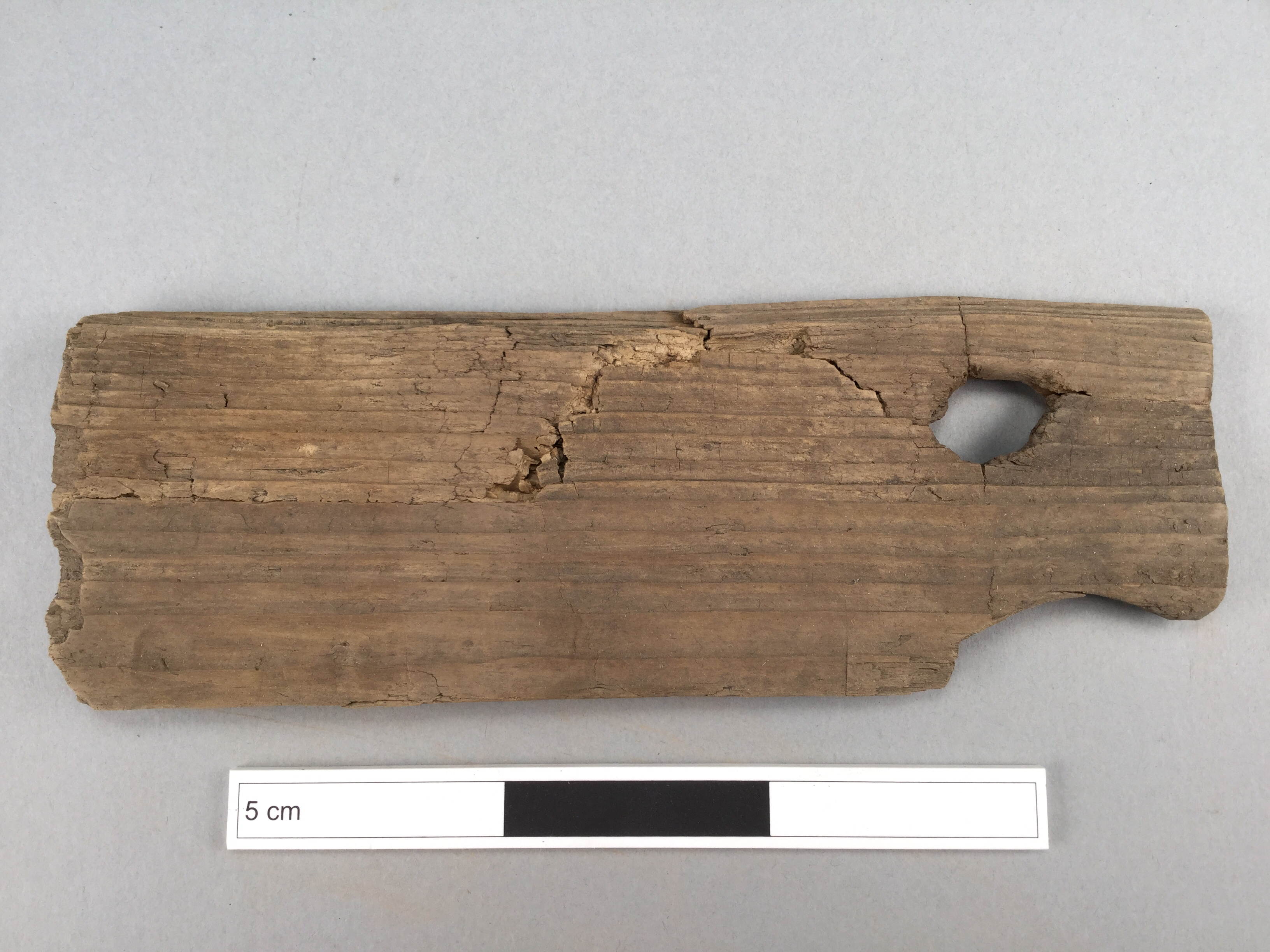 Laggkärlsstav till större kärl, med hål för handtag.Utskuren del vid kanten nära hålet.