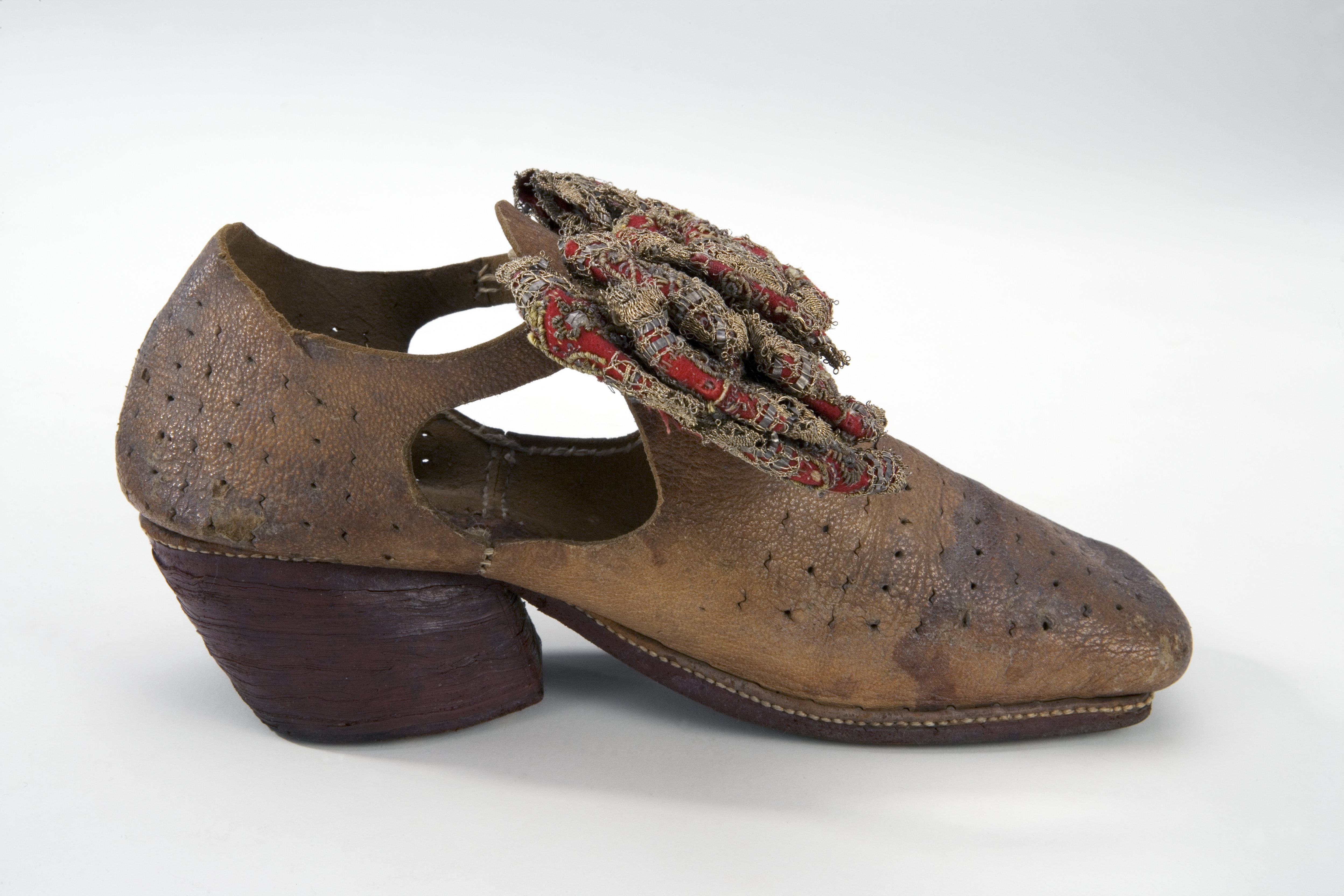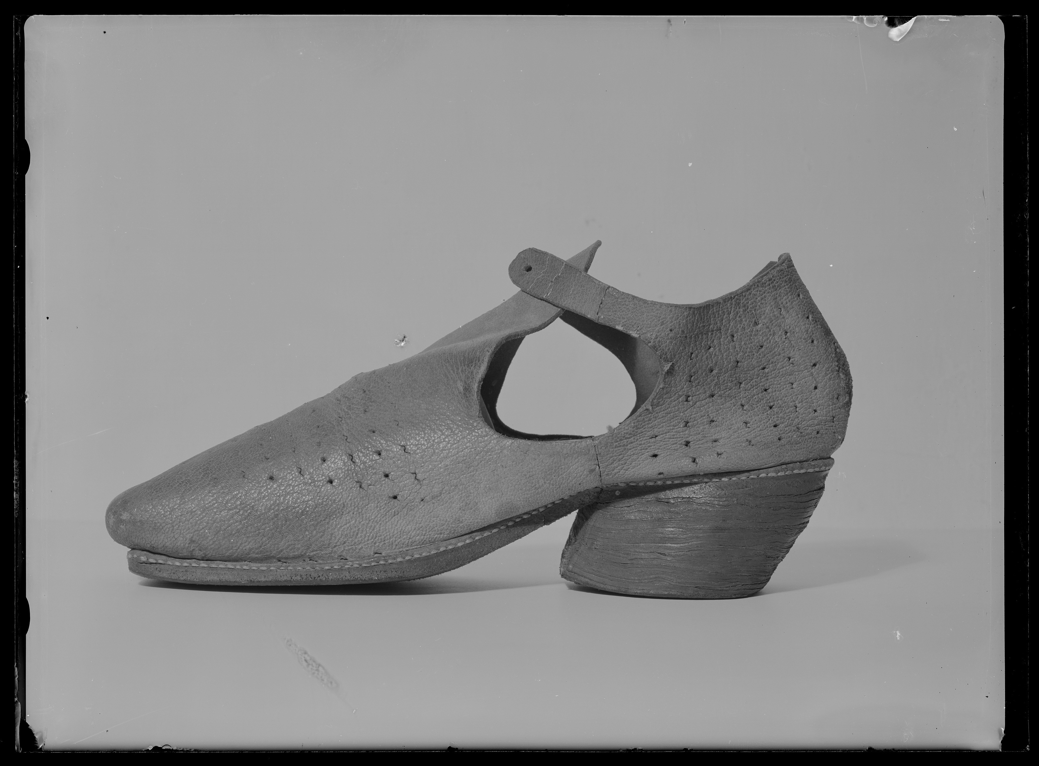 Mansslejfsko, perforerad av tjockt ljusbrunt skinn med narven utåt. Modellen som är ofodrad har tvär tå. Ovanlädret går upp i en avrundad plös över vristen och har två hål för fästande av skorosen.Bakstycket består av två stycken, som dragits ut till en hålförsedd slejf på varje sida. Sömmarna bak och i sidorna är hopspannade från insidan. Botten är sydd med holtrand. Ovanlädret och bakstycket perforerade med ett runt och litet z-format instrument.Klacken, som består av ett stort antal hårt sammanpressade klacklappar av läder, är 45 mm hög och 65 mm bred. Den har fasats av bak och även planats till. Skon är sydd med holtrand, vari även klacken fästs. Stiftlappen fäst med åtta träpligg. Sulan av tjockt läder har tre längsgående dolda ritsar. Såväl sula som klack är rödmålade. Skon är fodrad i tåpartiet. Fotlängden är 27 cm och motsvarar storlek 40 1/2.