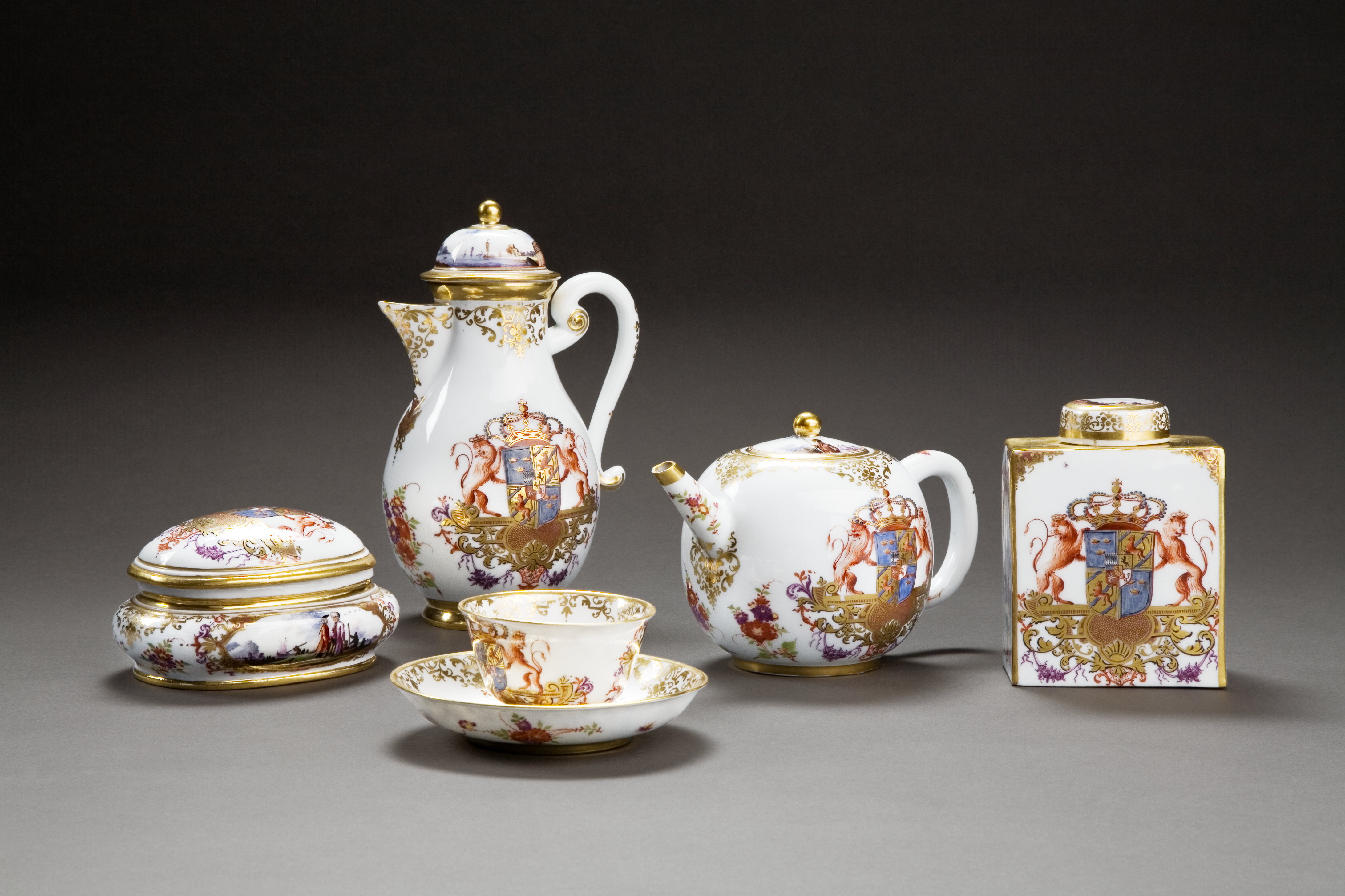 Dekor i guld och klara färger, blommor och på livet pfalziska svenska riksvapnet 2 ggr, felaktiga färger. På locket landskap med sjömän, sjöutsikt. Signerad i blå underglasyr: två korsade svärd. Meissen 1730-tal.