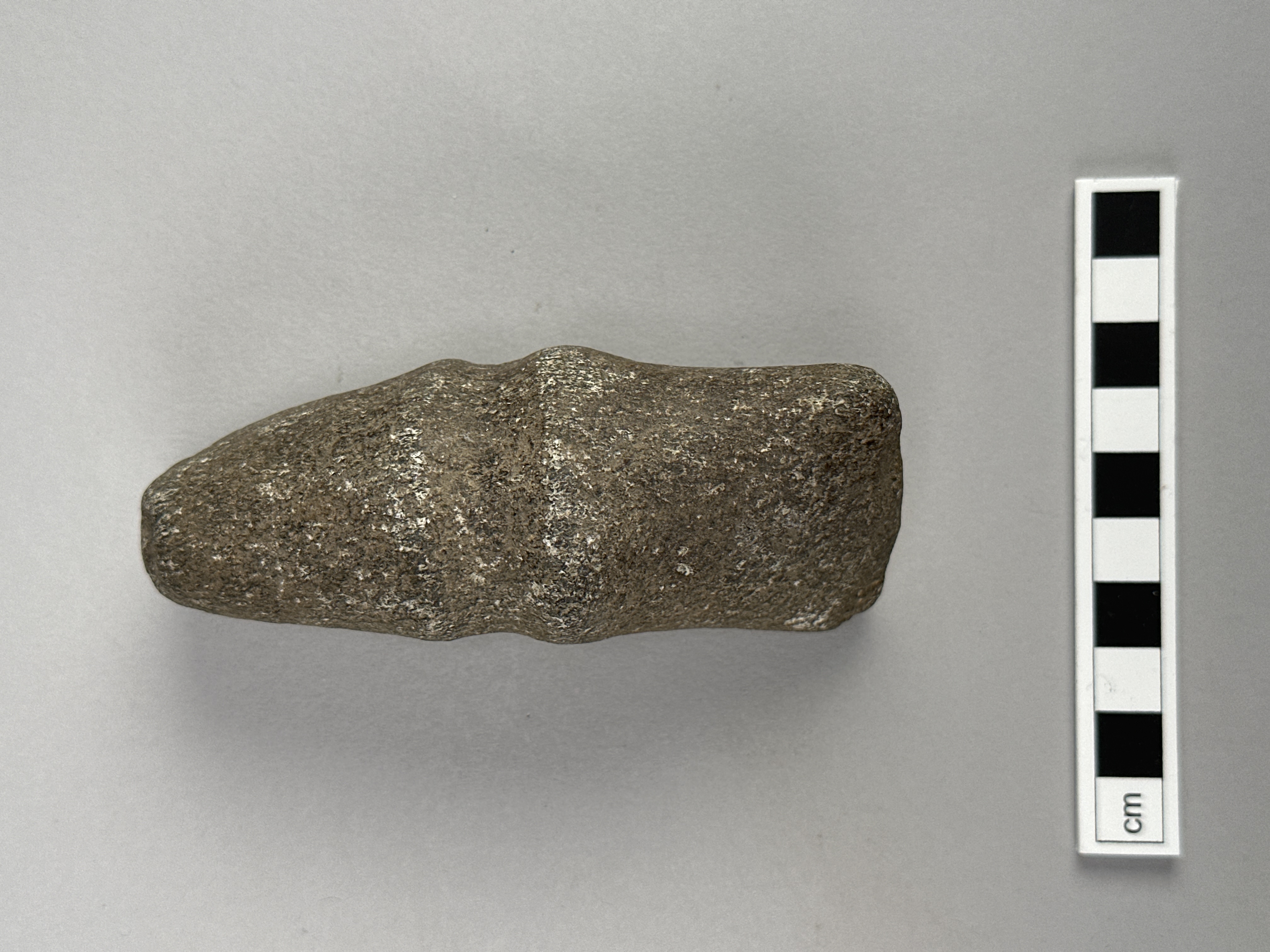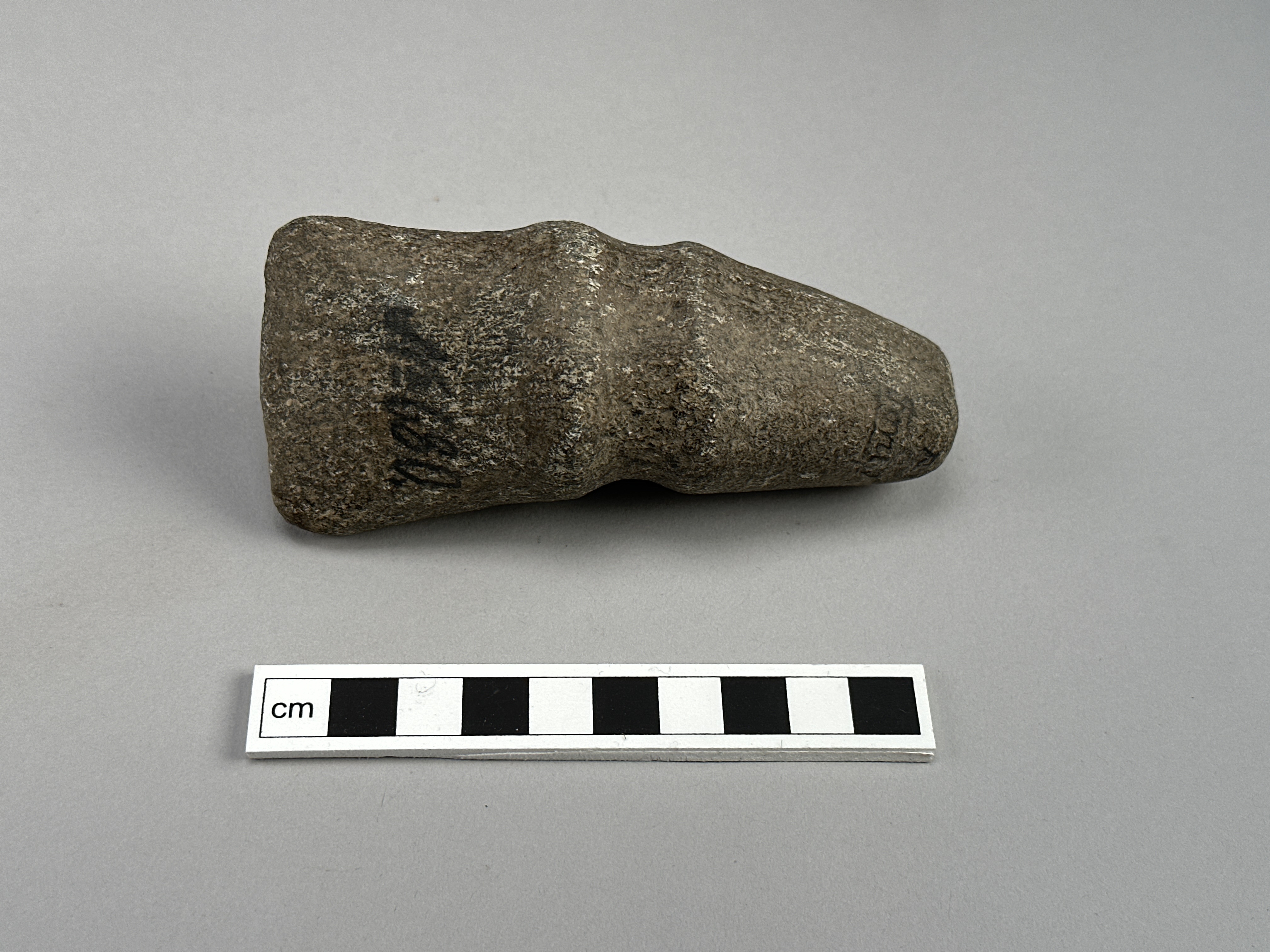 Nackböjd yxa av bergart med skaftränna. Rund nackknopp. Rak egg.