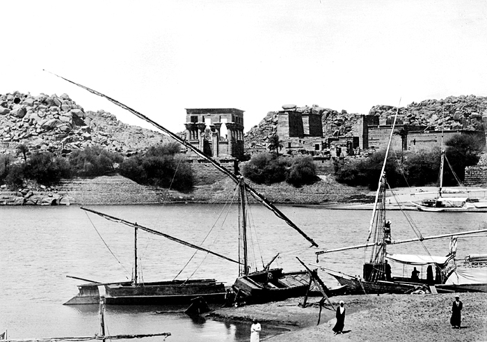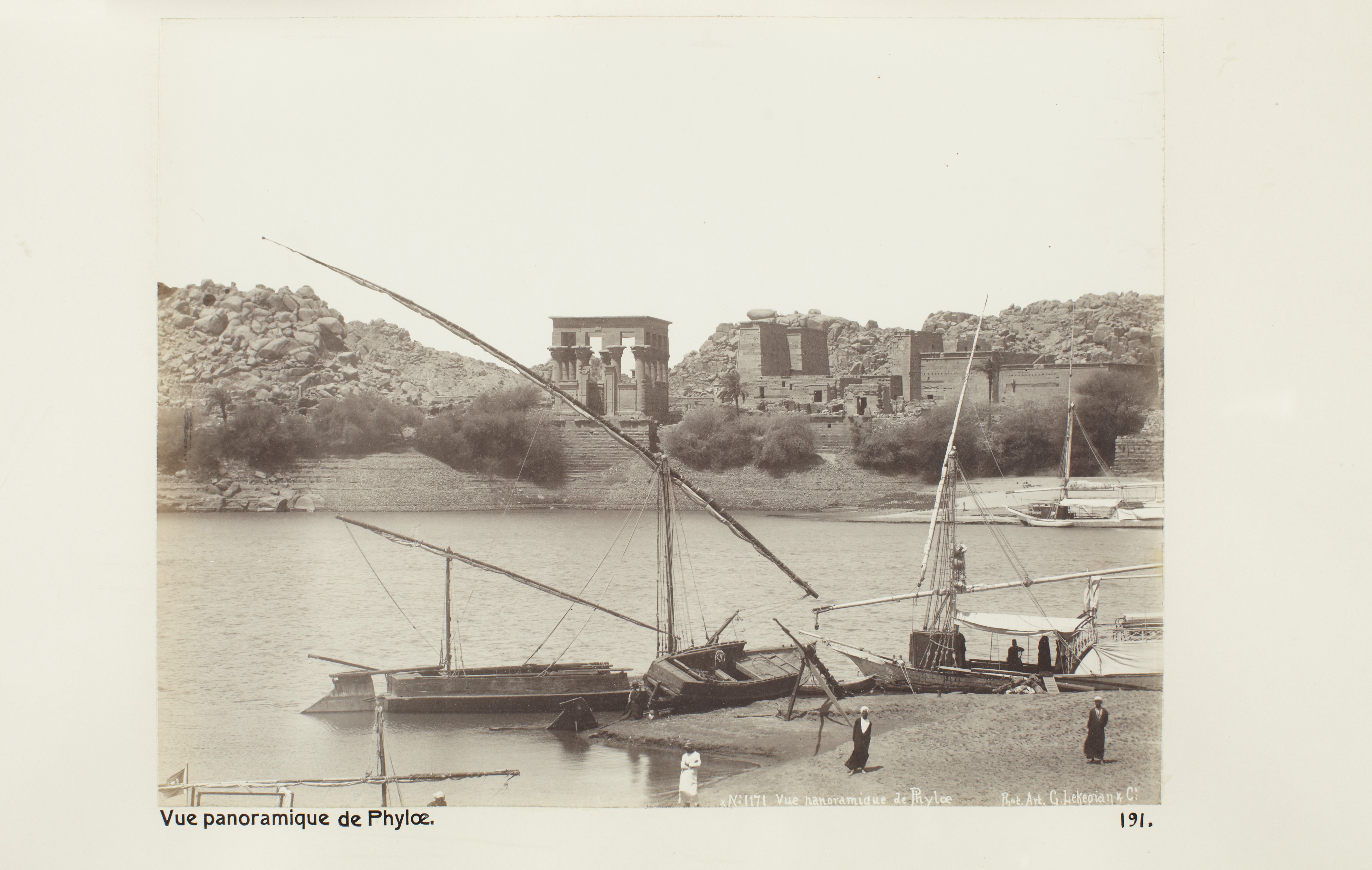 Panorama över ön File (Philae) utanför Assuan, Egypten. Text på fotografiet: Vue panoramique de Phylae. Fotografierna LXVI:M.01.- 201. kommer från resan till Egypten och Sudan som Wilhelmina och Walther von Hallwyl gjorde vintern 1900-1901. De lämnade Sverige den 5 november 1900 och fortsatte från Egypten till Palestina den 28 mars 1901. Med på resan var döttrarna Ellen med maken Henric de Maré och Irma med maken Wilhelm von Geijer. Wilhelminas sällskapsdam, fröken Ida Uhse reste också med. Under en del av resan anslöt sig ledamoten av Internationella domstolen i Kairo, assessorn Otto Conrad Waldemar Cedercrantz med makan Anna Elisabeth. Vid resan uppför Nilen hade Walther von Hallwyl hyrt ångfartyget Columbia med besättning. Båtresan startade i Kairo 27 december 1900, gick ända till Wadi Halfa varifrån man reste vidare med tåg till Khartum och tillbaka till Wadi Halfa. Båten vände åter i riktning mot Kairo, men det verkar som att sällskapet tog tåg sista biten, från Luxor. Henric och Ellen de Maré samt fru Cedercrantz lämnade båten redan då de passerade Luxor första gången. Resten av sällskapet återvände till Kairo den 1 mars. Fotografierna LXVI:M.01.-120. togs av resenärerna själva, de största av Ellen de Maré, de mellersta av Wilhelmina von Hallwyl och de minsta av Wilhelm von Geijer. Resten köptes av professionella fotografer i Kairo, de flesta från Studio Photogr. Artistique G. Lekegian & Cie. Alla uppgifter kommer från Ida Uhses reseanteckningar. Inköpt hos studio Photogr. Artistique G. Lekegian & Co.