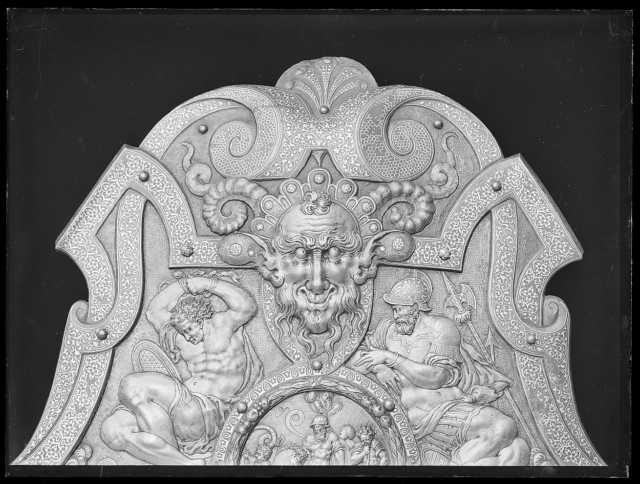 Praktsköld tillverkad i Antwerpen av Eliseus Libaerts, troligen för Kejsar Maximilian II kröning 1564 i Wien. Denna sköld har alltid betraktats som det främsta konstföremålet på Skoklosters slott och är förmodligen tagen av Wrangel i samband med stormningen och plundringen av Lilla sidan i Prag 1648. Paradsköld, efter förlaga av Etienne Delaune ritning. Troligen tillverkad i Antwerpen. Kartuschformad sköld av drivet stål, med påhamrat guld och silver. Ramverket är tjockare, med i kanterna fauns-maskaroner i profil med från munnen framskjutande ringar för fästande av hängen eller pärlor. Sköldens över- och nederdel med ett faun- respektive kvinnohuvud. Sköldens fyllning utgöres dels av fyra oregelbundna, nitade sidofyllningar med figurer i större skala - fjättrade fångar, troféer - dels av fem ovala medaljonger med små figurgrupper. Sköldens bottenytor punsade. Ramverket med påhamrat guld och silver i arabeskmönster. Påslaget guld och silver även i fyllningarna. De med ädelmetall försedda partierna är blånerade, profilmaskaronerna bär spår av brunering. Fodrad med purpurviolett sammet, belagda med guldtrådar i rombiska mönster. Alla på baksidan synliga nitar har rosformiga, förgyllda brickor av koppar (43 stycken bevarade). Spår av bärremmar av läder, överklädda med samma purpurfärgade sammet som baksidan i övrigt (tre remrester återstår). Enligt 1710 års inventarium p. 72, rum III: "1Romansk Schilt med drifwit arbete och gull inlagt i Canterne, Rödt Sammet underfodrat, och röde silckess Frantzar kring". 1653 års inventarium N:o 21 (Riksarkivet E 8205) "Ein schöner gearbeiter Schildt mit Figuren". Upptagen i 1651 års Wolgastinventarium.