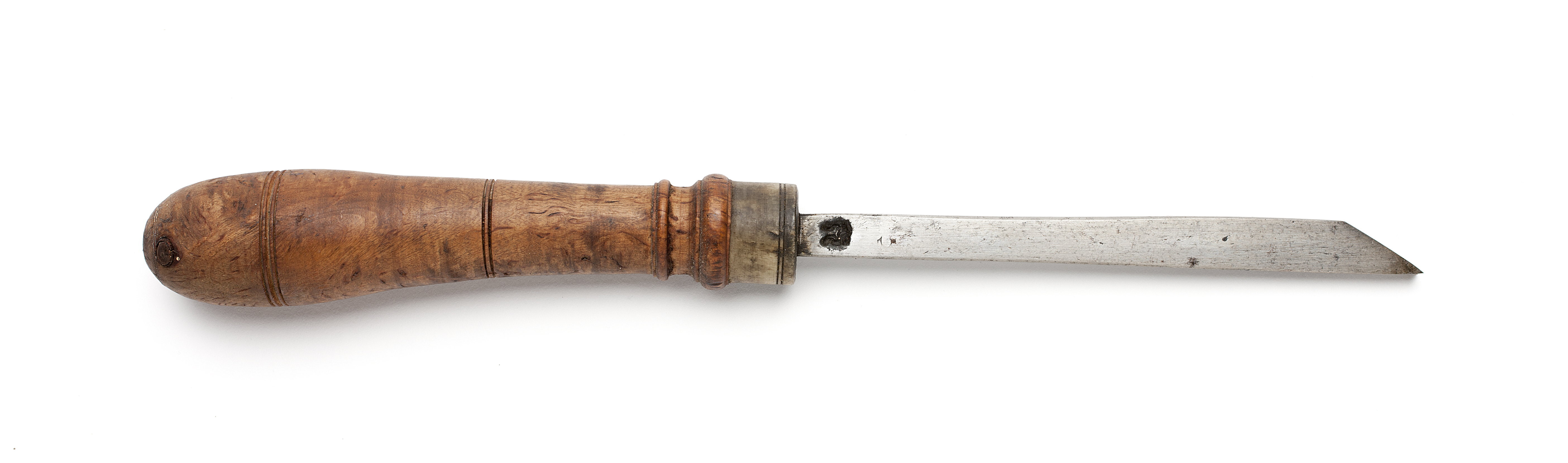 Klinga med rektangulär genomskärning med avfasade kanter. Rak egg med i mitten halvcirkelformad konkavitet. Stämplat på klingan: oxenstiernska vapnet samt "2". Svarvat skaft av masurbjörk, med två vulster nedtill. Hornring.