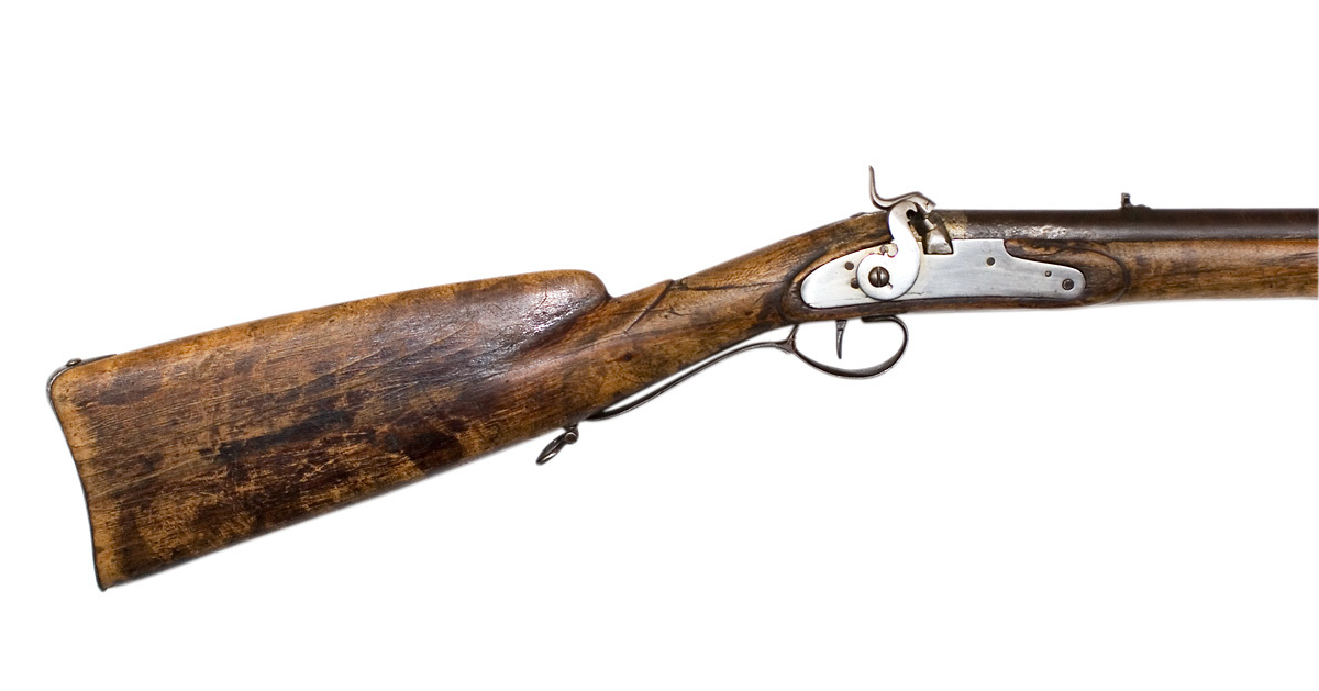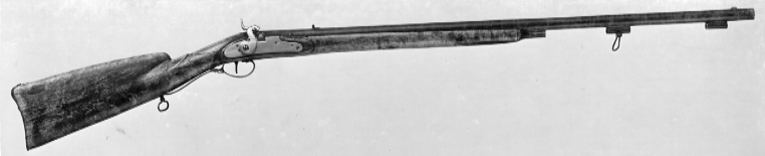 Rund, slätborrad, brunerad pipa av stål, baktill förlängd 23 mm, urtag för den kantiga tändhattssnäckan. Böjt svansskruvblad med rundad ände. På pipans undersida fäst fyra rörkor, därav de tre främre synliga, den bakre rörkan nedtill försedd med en framåtriktad hake för pipstift, bakre mellanrörkan bakåt vidgad till en tapp, omslutande framstockens ände, tandad kant. På främre mellanrörkan en rembygel av stål. Riktmedel: ifrån bladet till ca 300 mm från pipbasen en framåt något avsmalnande siktribba, vid framänden en ring. V-formigt ståndsikte av stål, stolpkorn av mässing. Fästning: Pipan fäst med krysskruv, bakre låsskruven genom svansskruvplattan samt ursprungligen med ett pipstift. Flintlås ändrat till slaglås. Plant låsbleck, platt hane med rundade hak på hanryggen vid halsen samt mellan hals och huvud framtill. Slaghuvud med skadade munväggar, nätskuret tumgrepp. Fästning: Två låsskruvar. Rak, kort avtryckare, framtill utdragen till en svagt rombisk spets. Halvstock av urspr. rödmålad björk med kolv av provinsiell svensk(?) typ, kindstöd och smal, svängd rygg, svängd undersida. Beslag av stål, bakplåt med kort, spetsig flik på kolvryggen, s-formigt sidbleck med en rät vinkel på vardera sidan. Varbygel med kluven bakre stolpe, fri bakre arm med rombisk ändplatta, fäst med bakre rembygelns skruv, framstolpen fäst med krysskruven.