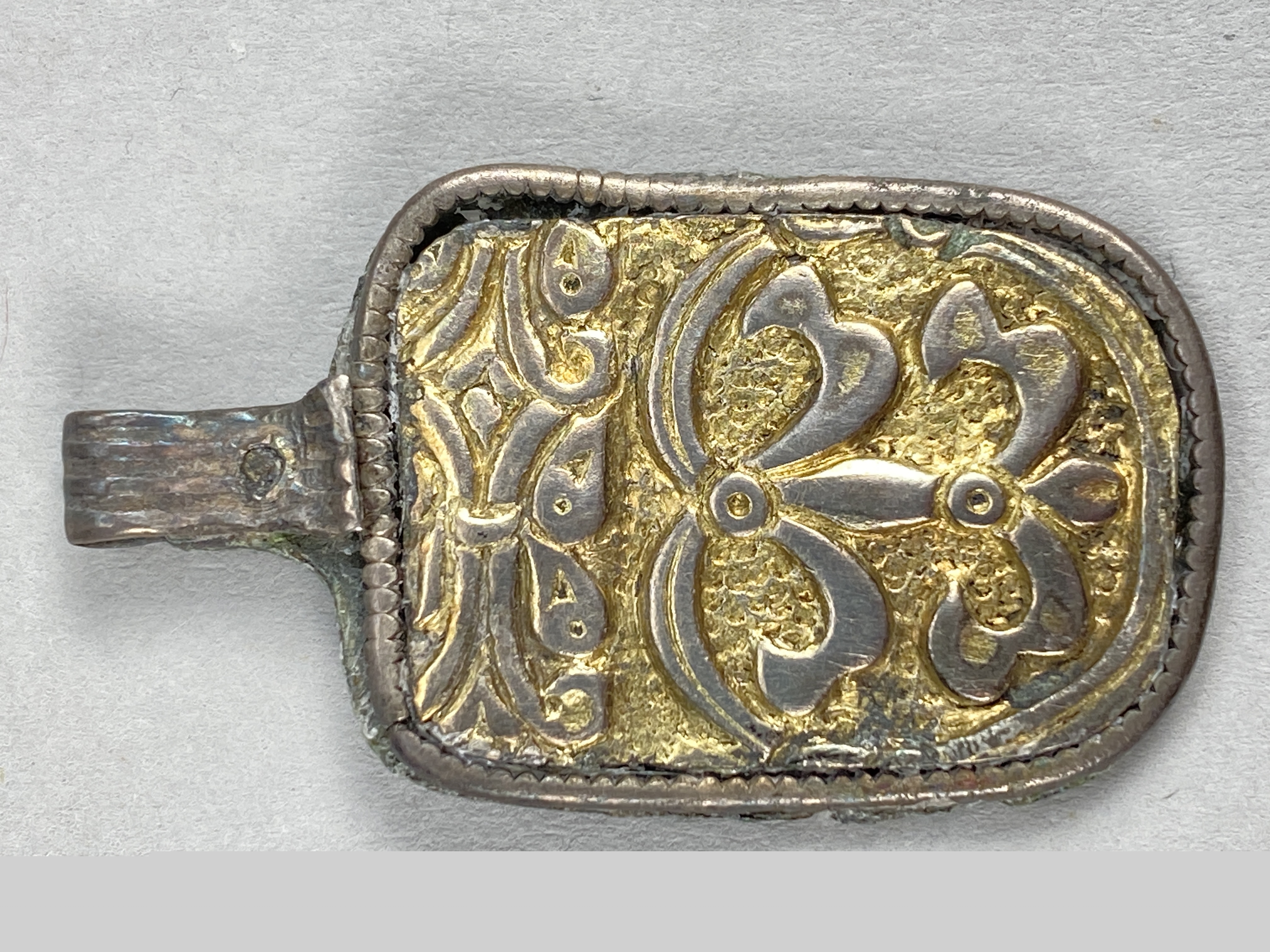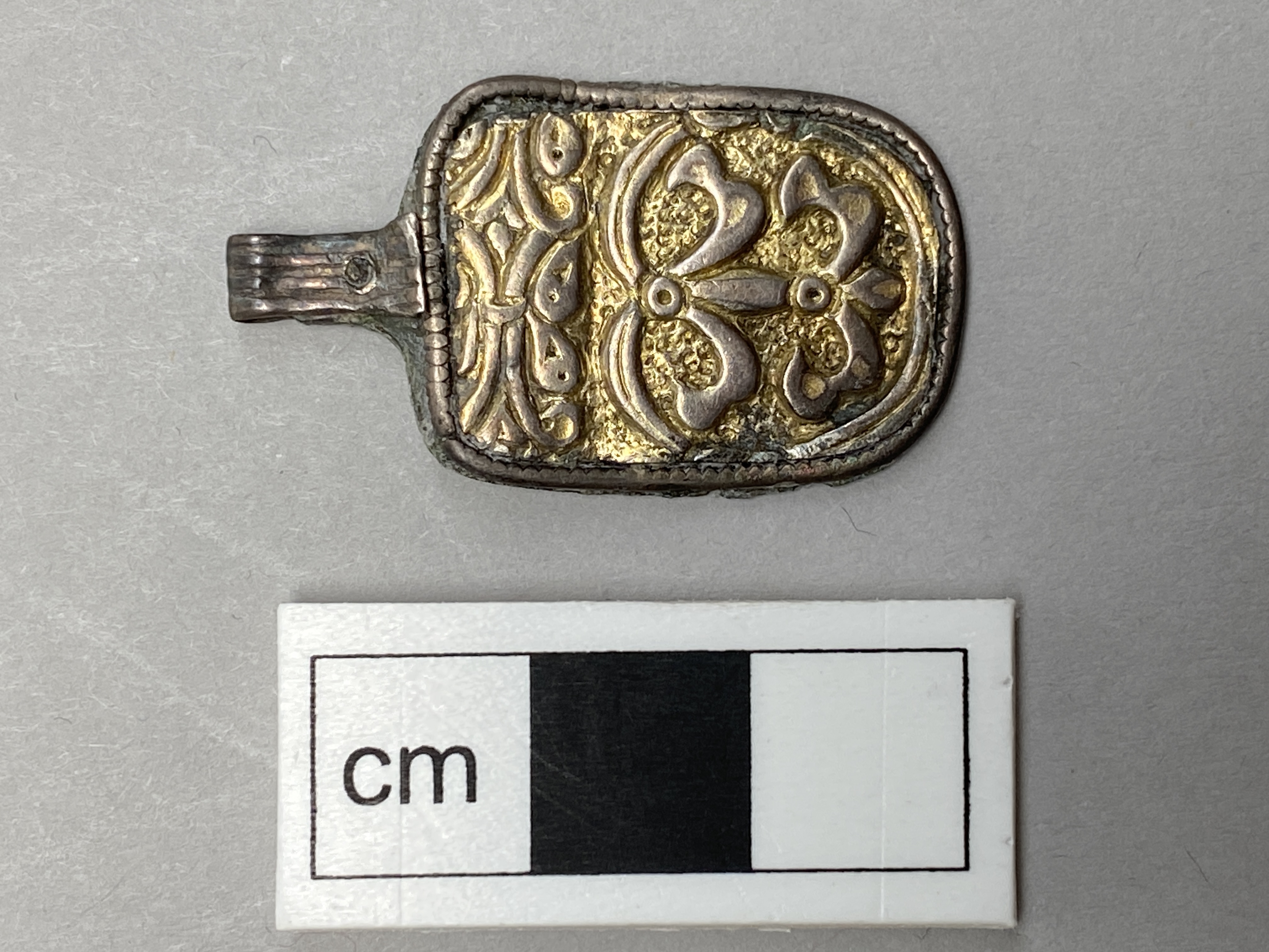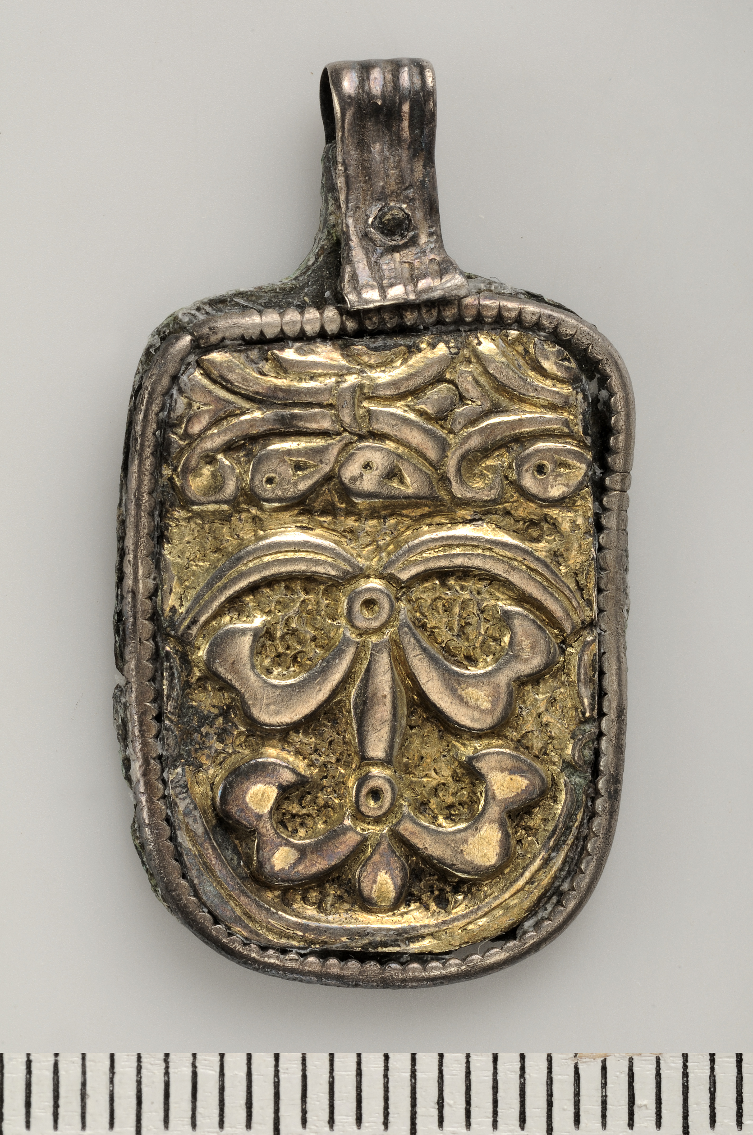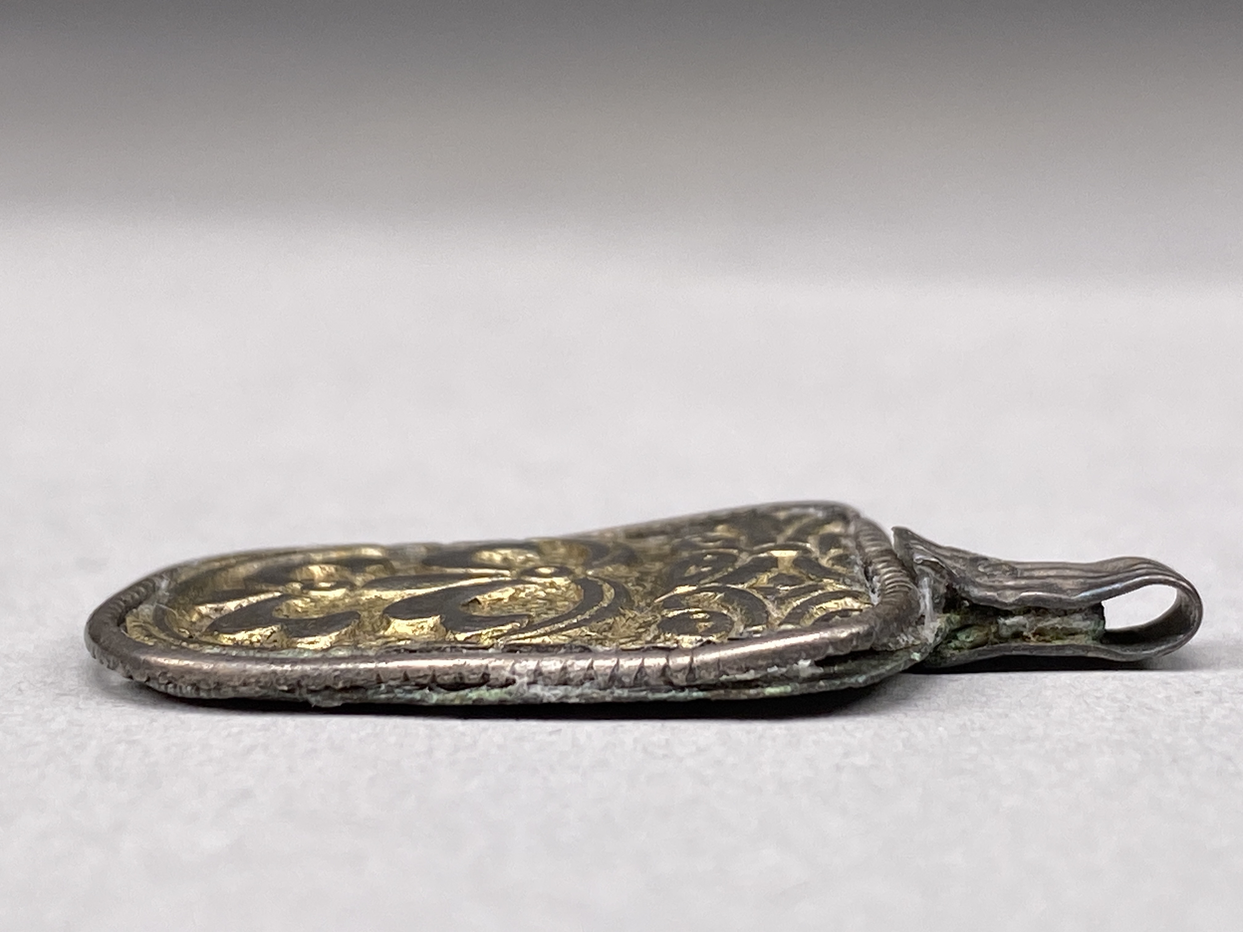 Hänge utskuret ur kanten på 1 ornerat östligt/sydöstligt silverkärl. Det utskurna skålfragmentet omgjort till hänge.