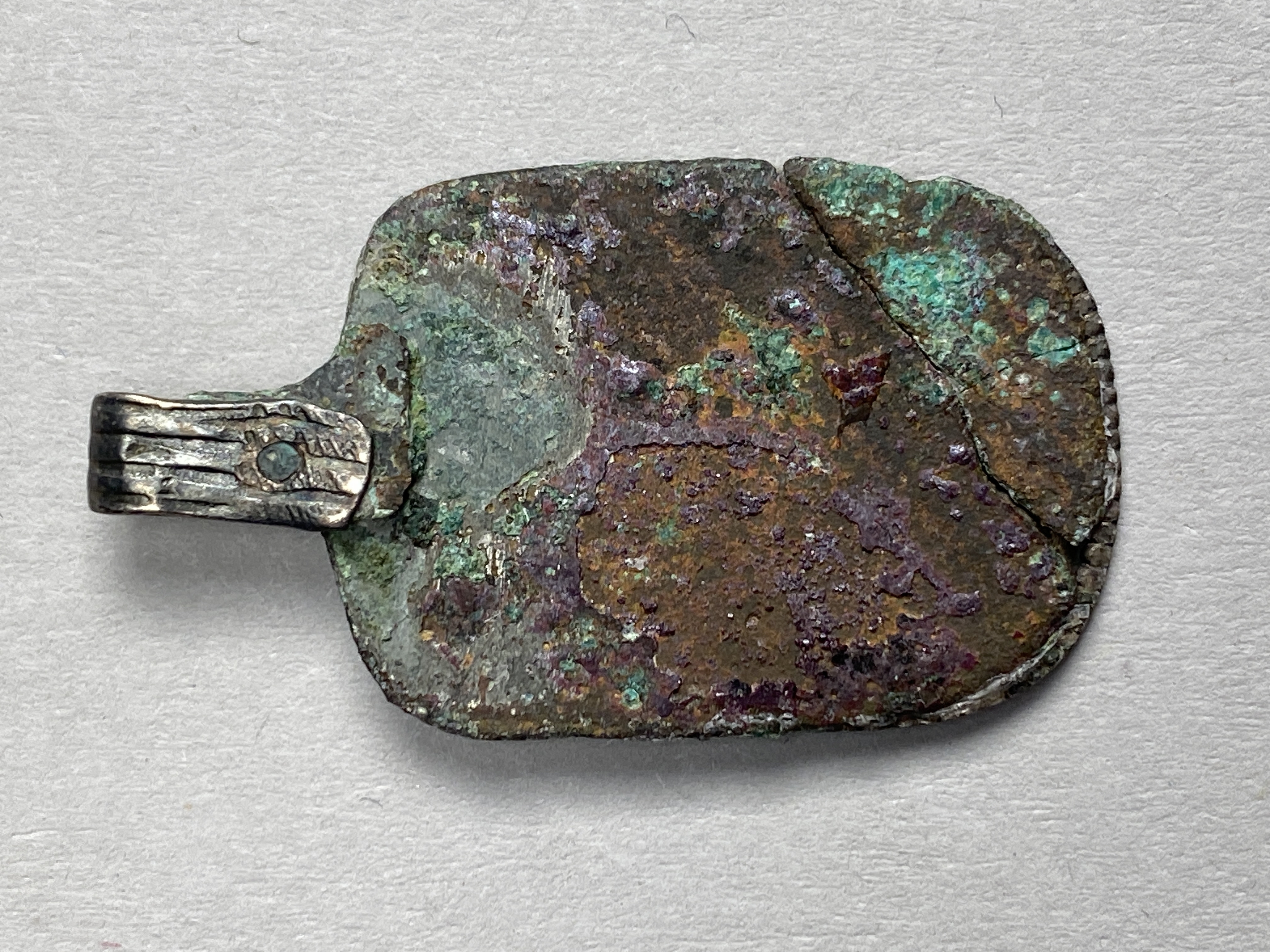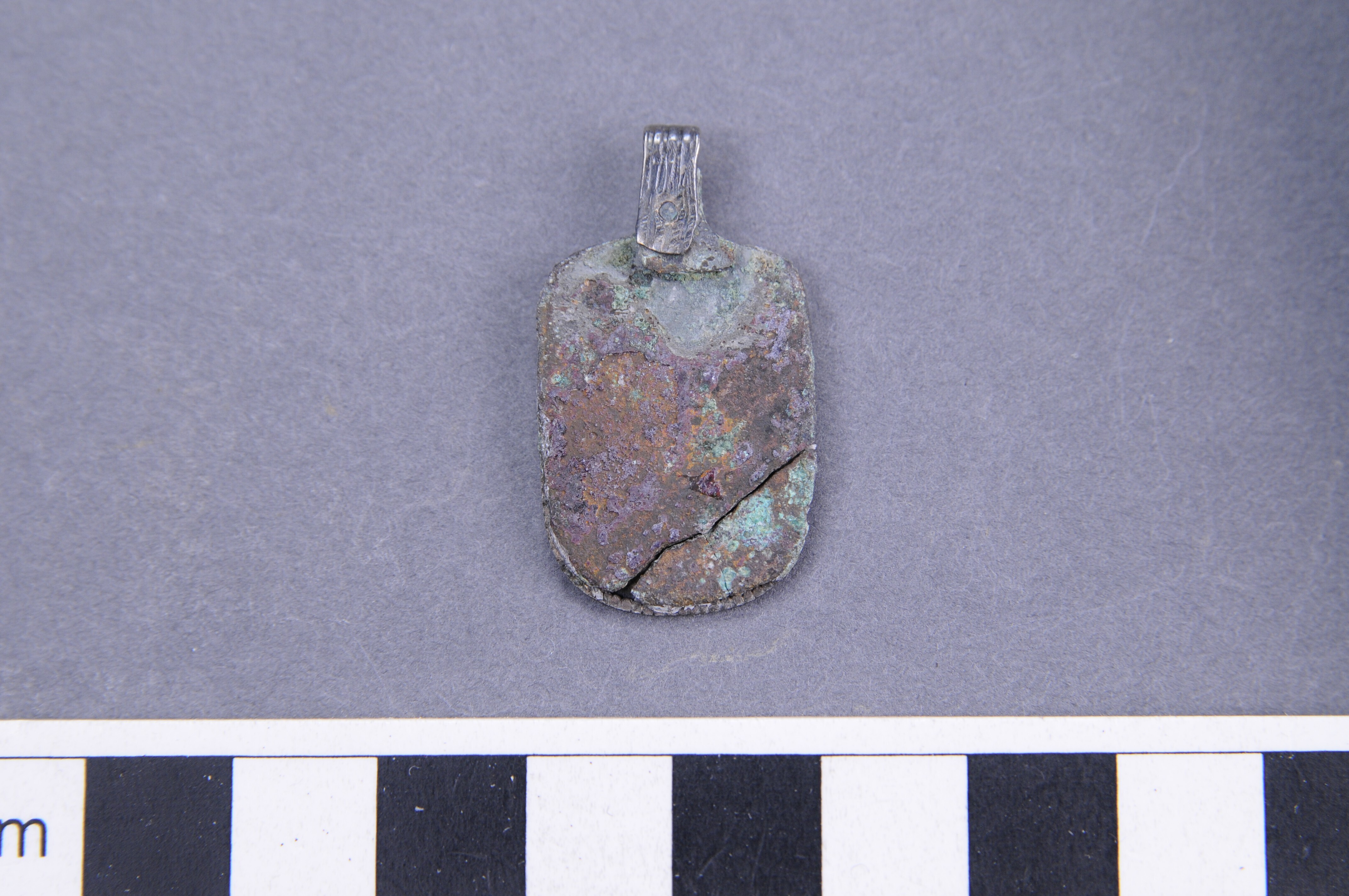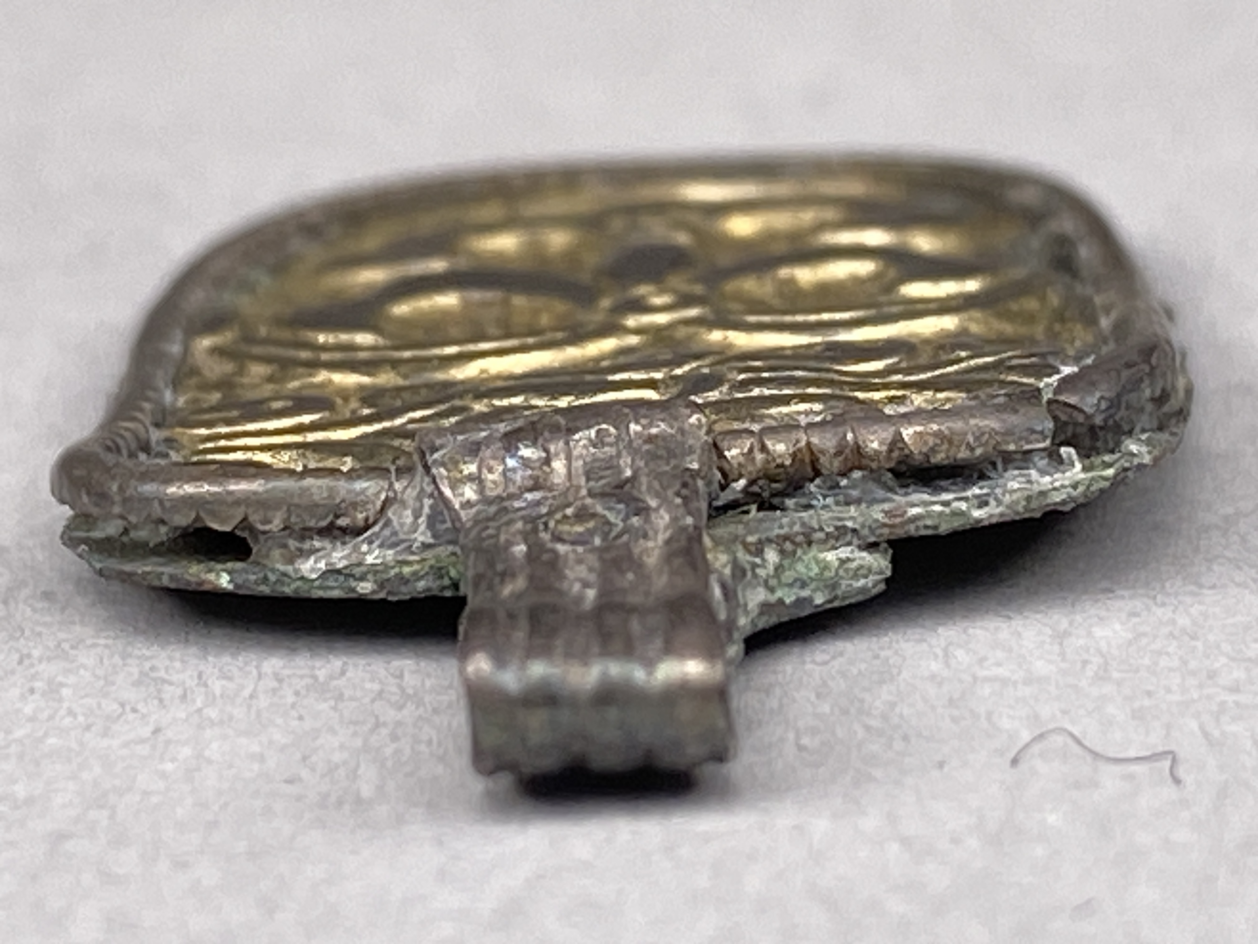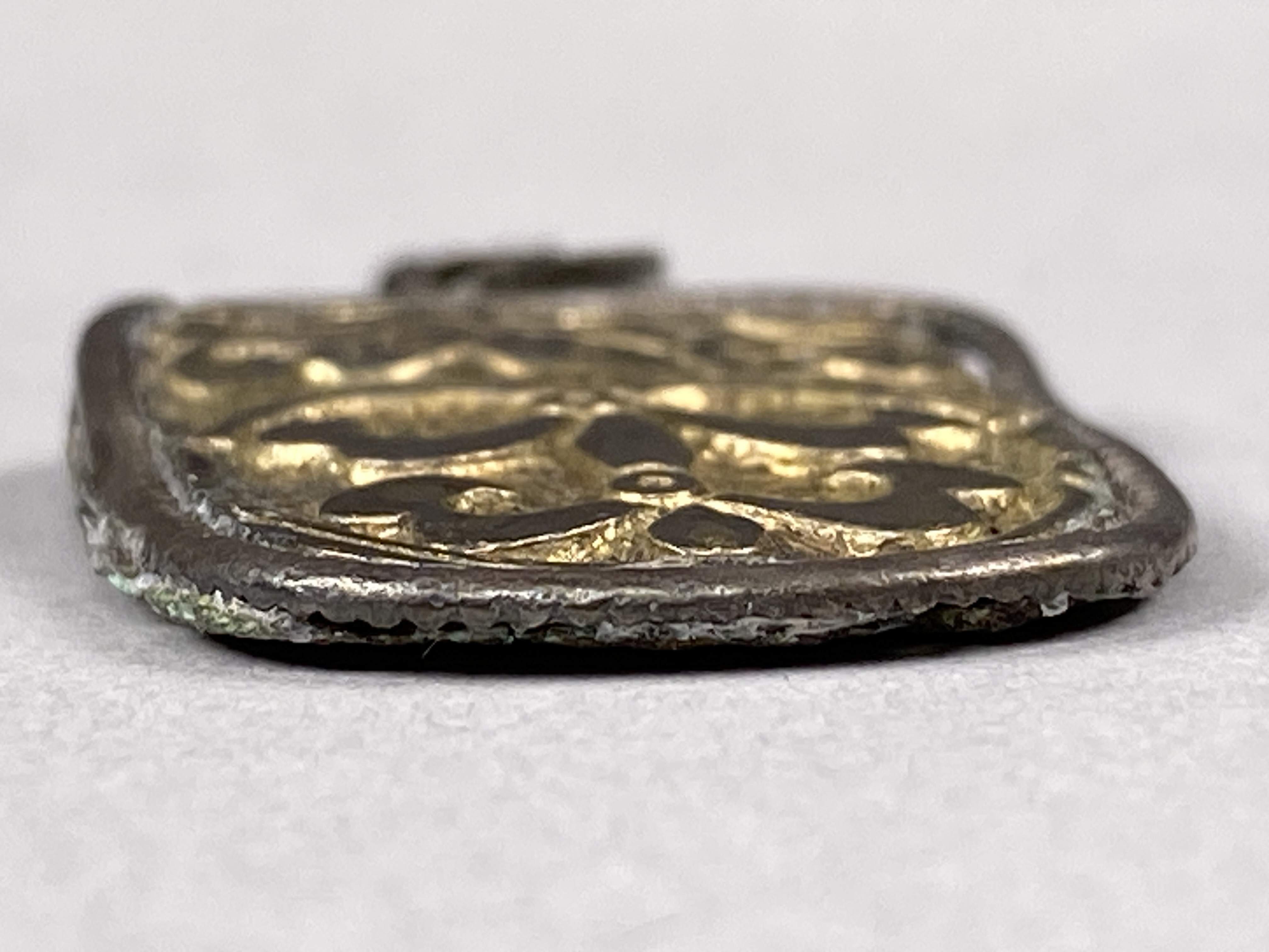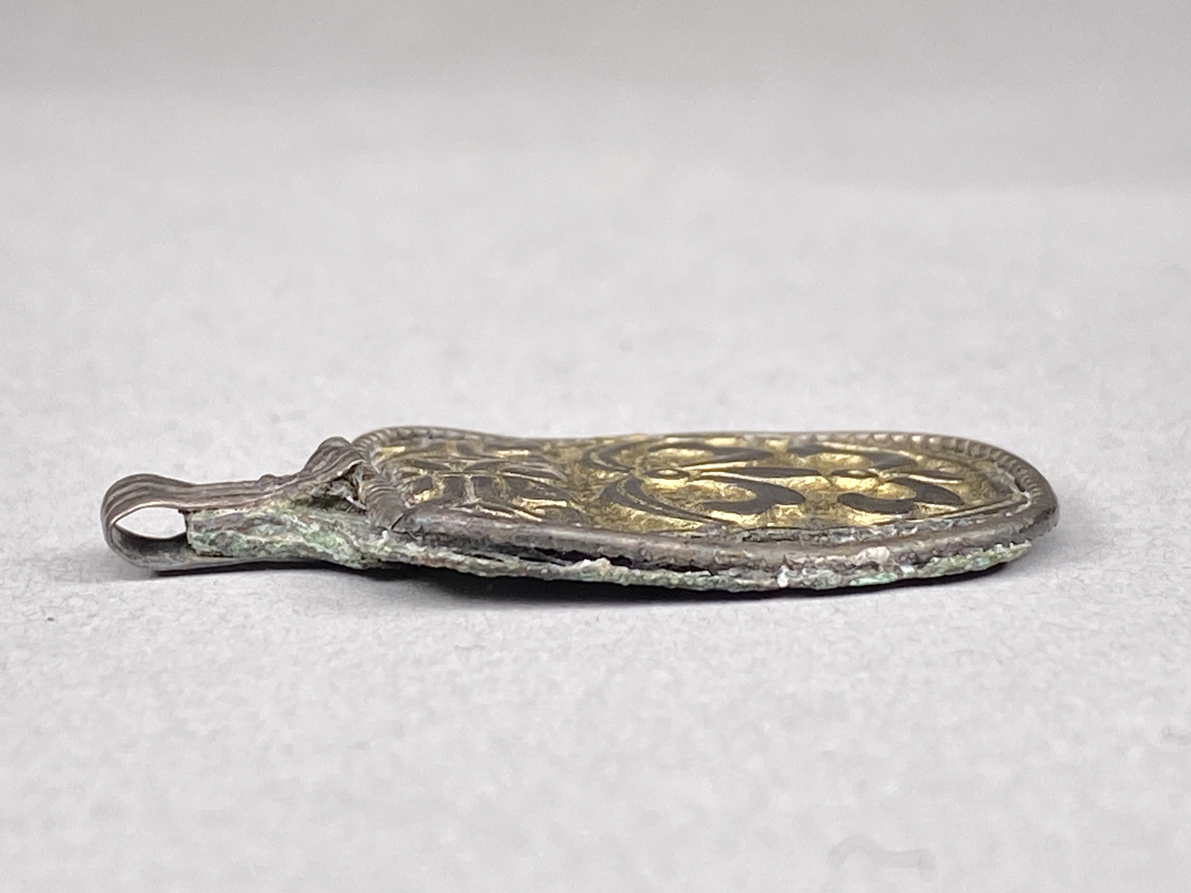 Hänge utskuret ur kanten på 1 ornerat östligt/sydöstligt silverkärl. Det utskurna skålfragmentet omgjort till hänge.