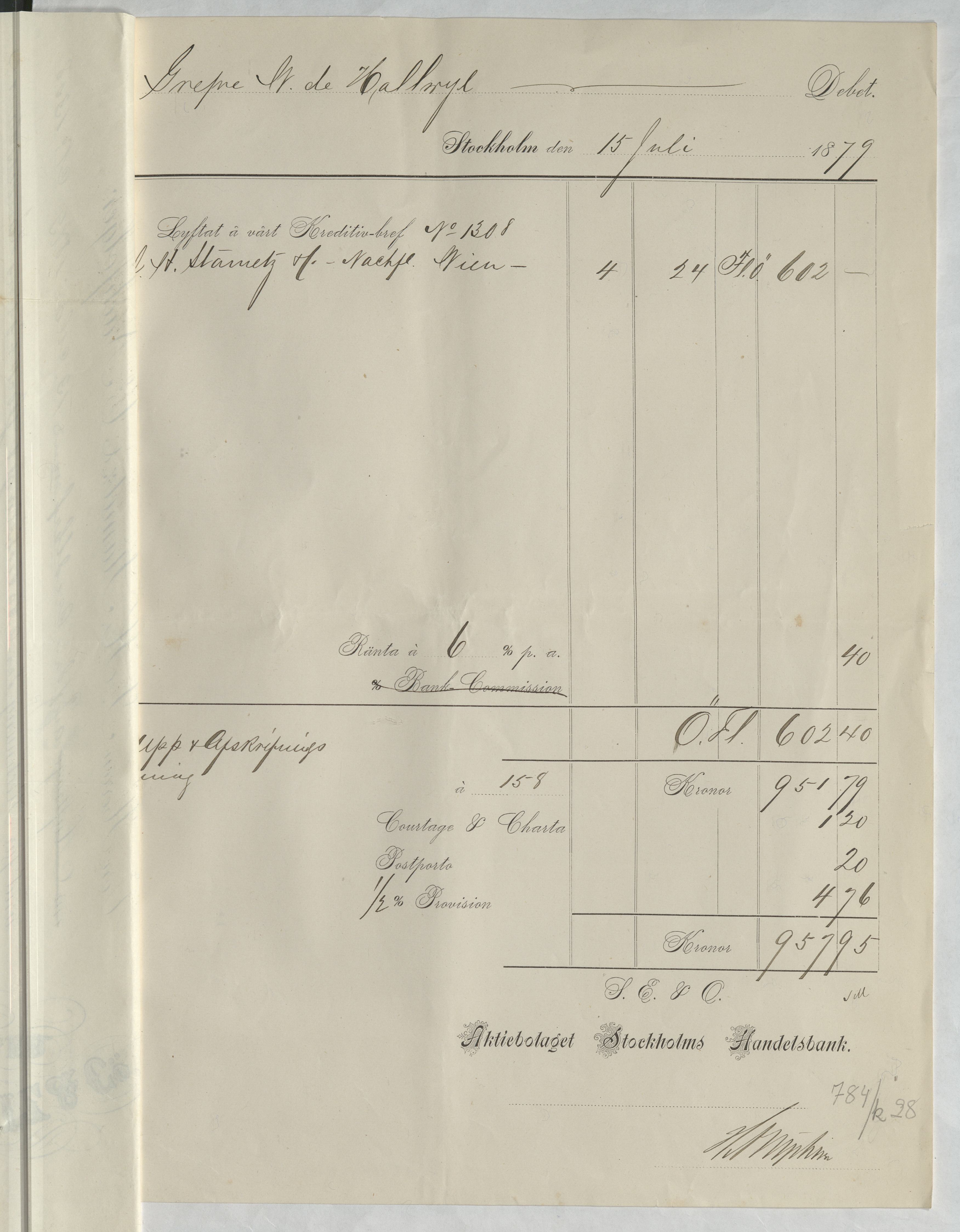 A. Anhalt und Wagener Nachf. Berlin B. Bayerischen Vereinsbank, München C. Boucicaut, Aristide, Paris D. Erikson, L. E. Spannmålshandlare E. Loewe, M. Innsbruck F. Mallet, Frères & C:ie, Paris G. Munktells Mekaniska Werkstads AB H. Passavant & Comp. Basel; Knörr, Frédéric & fils, Lucerne: Anhalt & Wagener, Berlin (på samma räkning) I. Schultess Erben, Zürich J. Sjöberg, Gustaf, Operasångare K. Stametz & C:o, I. H. Nachfolger, Wien L. Upp- och Afskrifnings-Besked och andra verifikationer