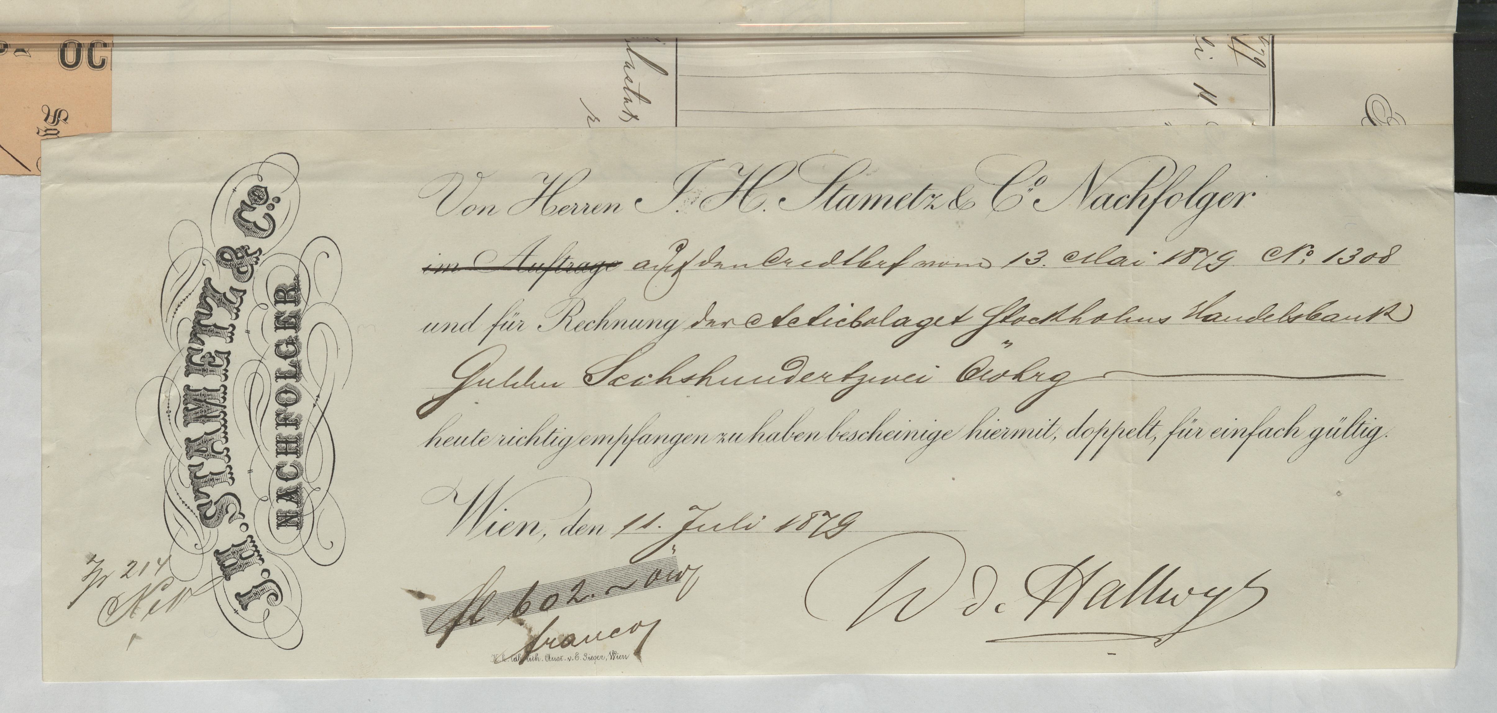 Kvitto från Aktiebolaget Stockholms Handelsbank rörande I. H. Stametz & C:o, Nachfolger, Wien