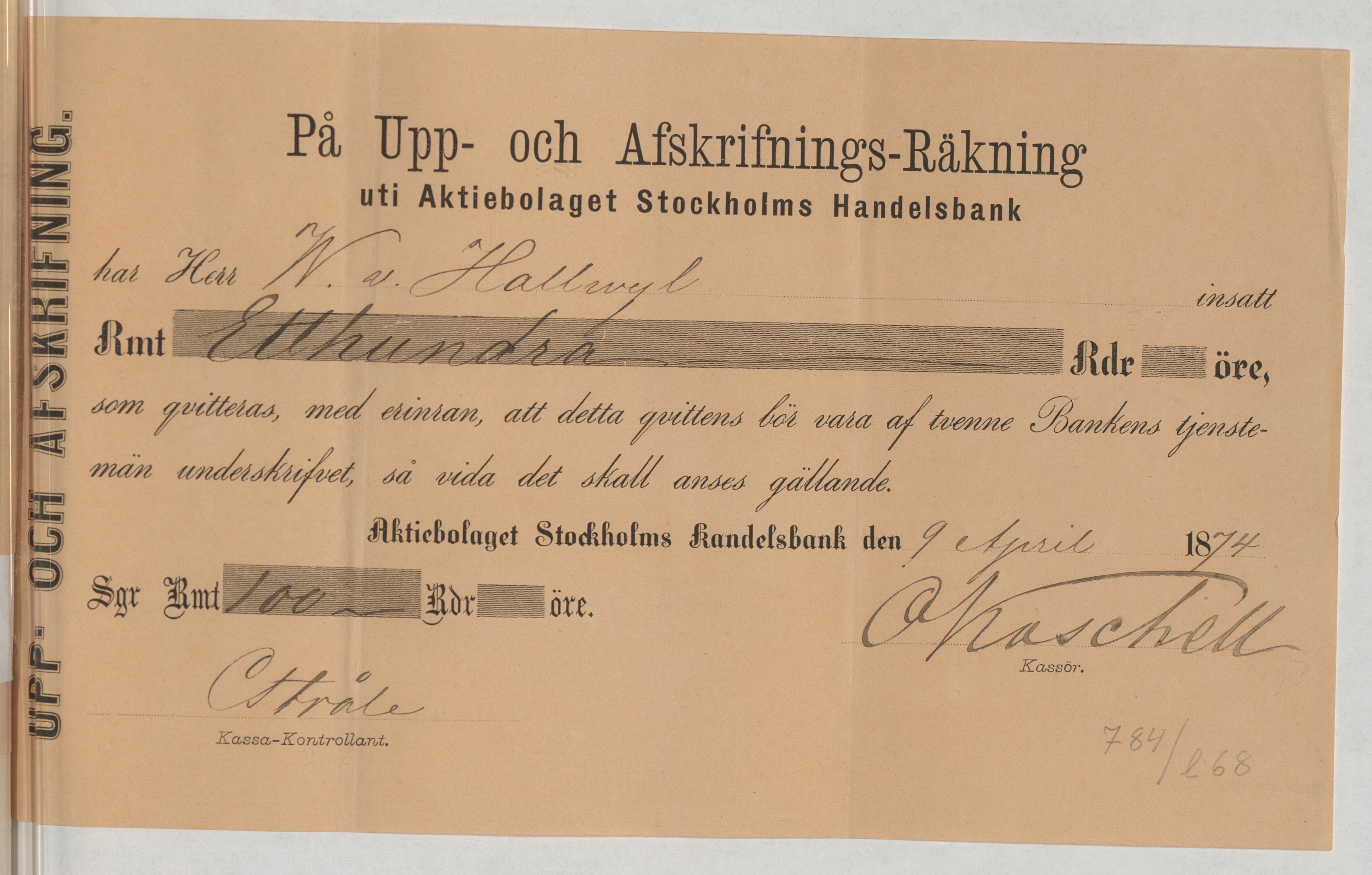 Kvitto från Aktiebolaget Stockholms Handelsbank rörande Upp- och Afskrifnings-Räkning
