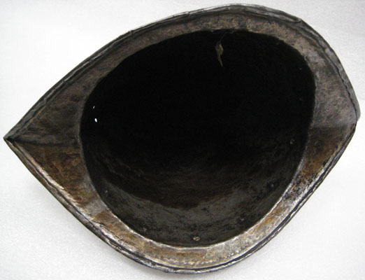 Av stål med blank utsida och brunaktig behandlad insida. Tydliga slagmärken på bägge sidor. Driven i ett stycke. Klockan mandelformig med tydlig längsgående ås och i toppen utsmitt bakåtsvängt utskott (sk päronstjälk). Neddragna sidor med brätte runtom, fram- och baktill uppsvängt i en spets. Kanterna omvikta inåt och rundsmidda med längsgående försänkning. I nacken plyhållare av gulmetallplåt fäst med två nitar. Ändarna vikta utåt, vingarna triangulära. Längs klockans nederkant nitar i rad, några med brickor.