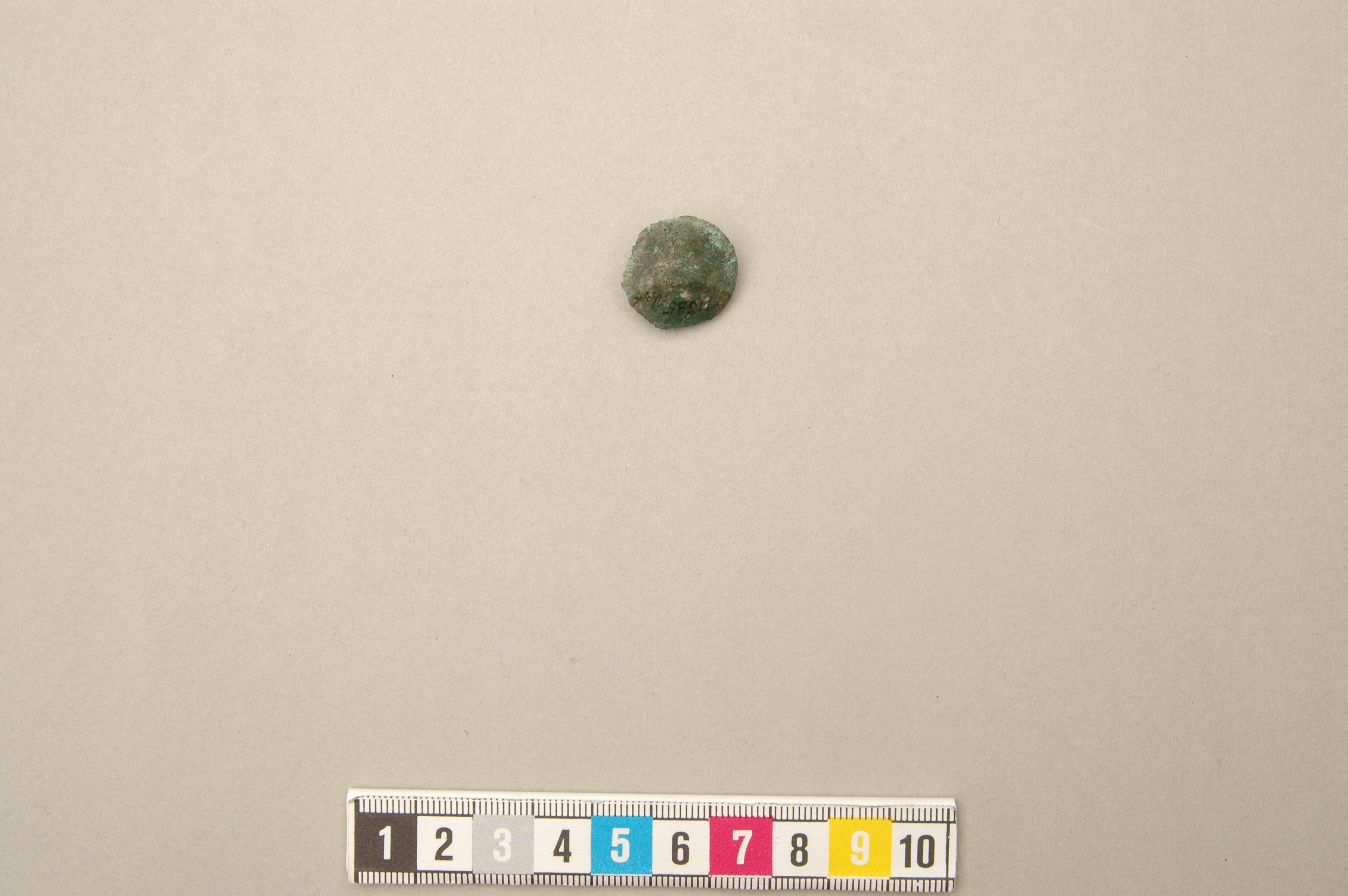 Dubbelknapp av brons med närmast platt huvud och ståndare med nitbricka på baksidan.