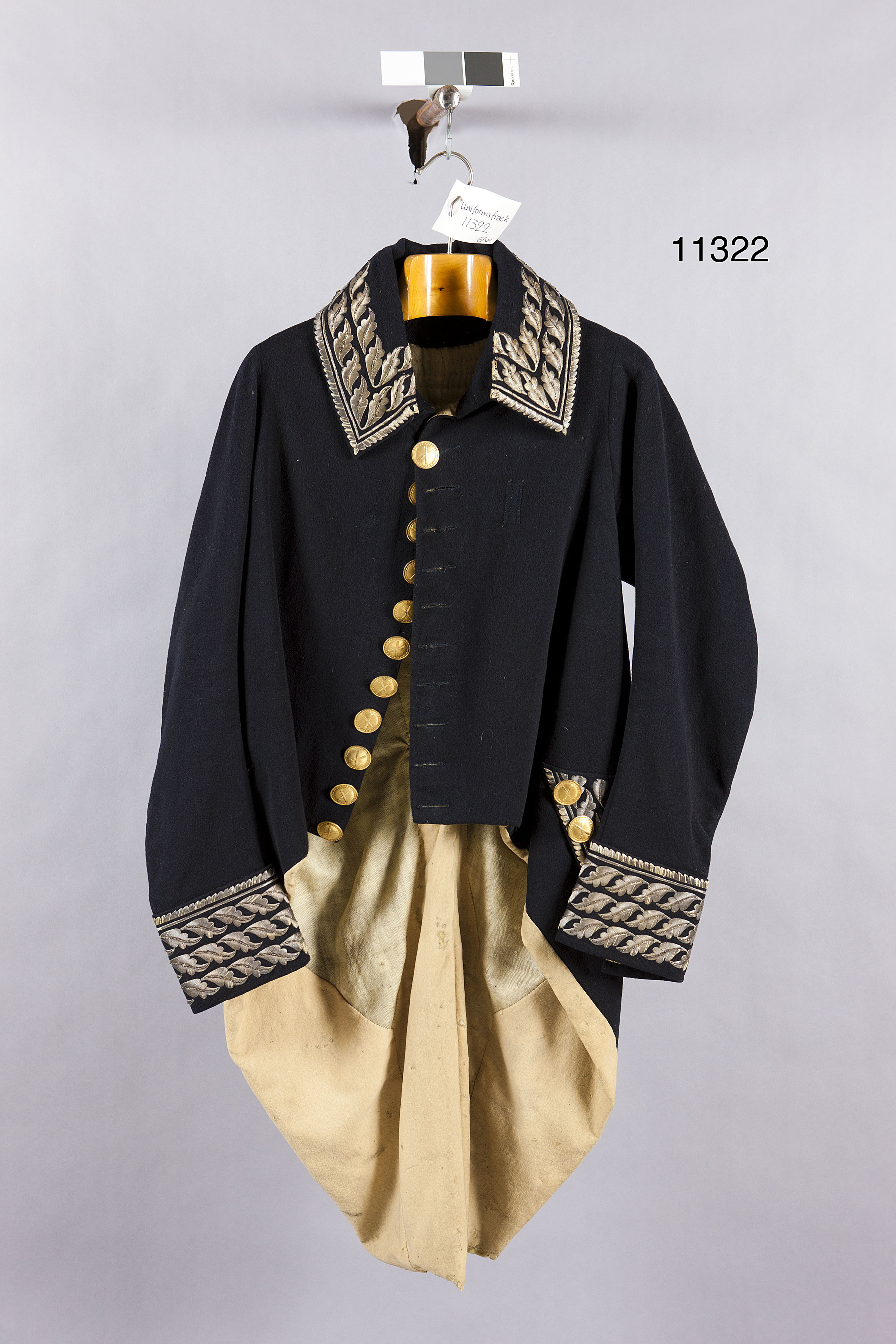 Uniformsfrack av mörkblått kläde tillskuren med delat bakskört, fällkrage och enkelradig. 11 knappar av förgylld mässing, d: 29 mm med korslagda marskalkstavar, bladbård i ytterkanten. Kragen med två rader eklöv broderade med guldtråd. Ärmuppslag 110 mm med tre rader broderade blad, sprund med två små knappar, d: 16 mm, på axlarna en hälla samt en liten klädd knapp. Två ficklock 240 mm breda med två knappar i främre och bakre kanten samt tre nedtill. Sprund mitt bak med två knappar i livsömmen samt två dolda fickor med en knapp i nederkant. Foder av gulaktigt ylle, tuskaftat i livet, kyprat i skörten. Fodret når fram på utsidan och bildar en kant på skörten. Har tillhört Excellensen, greve Georg Adlersparre (1760-1835).