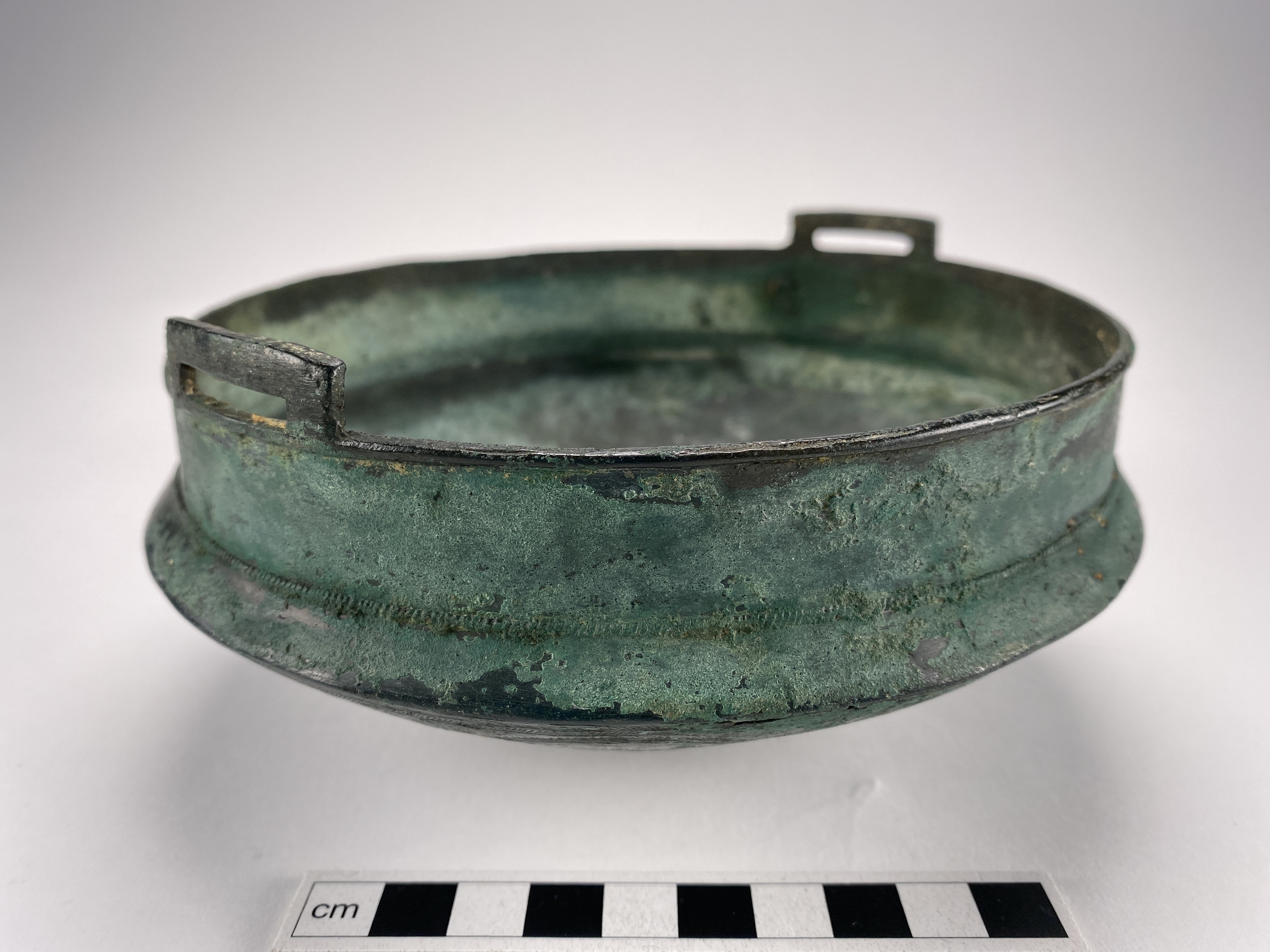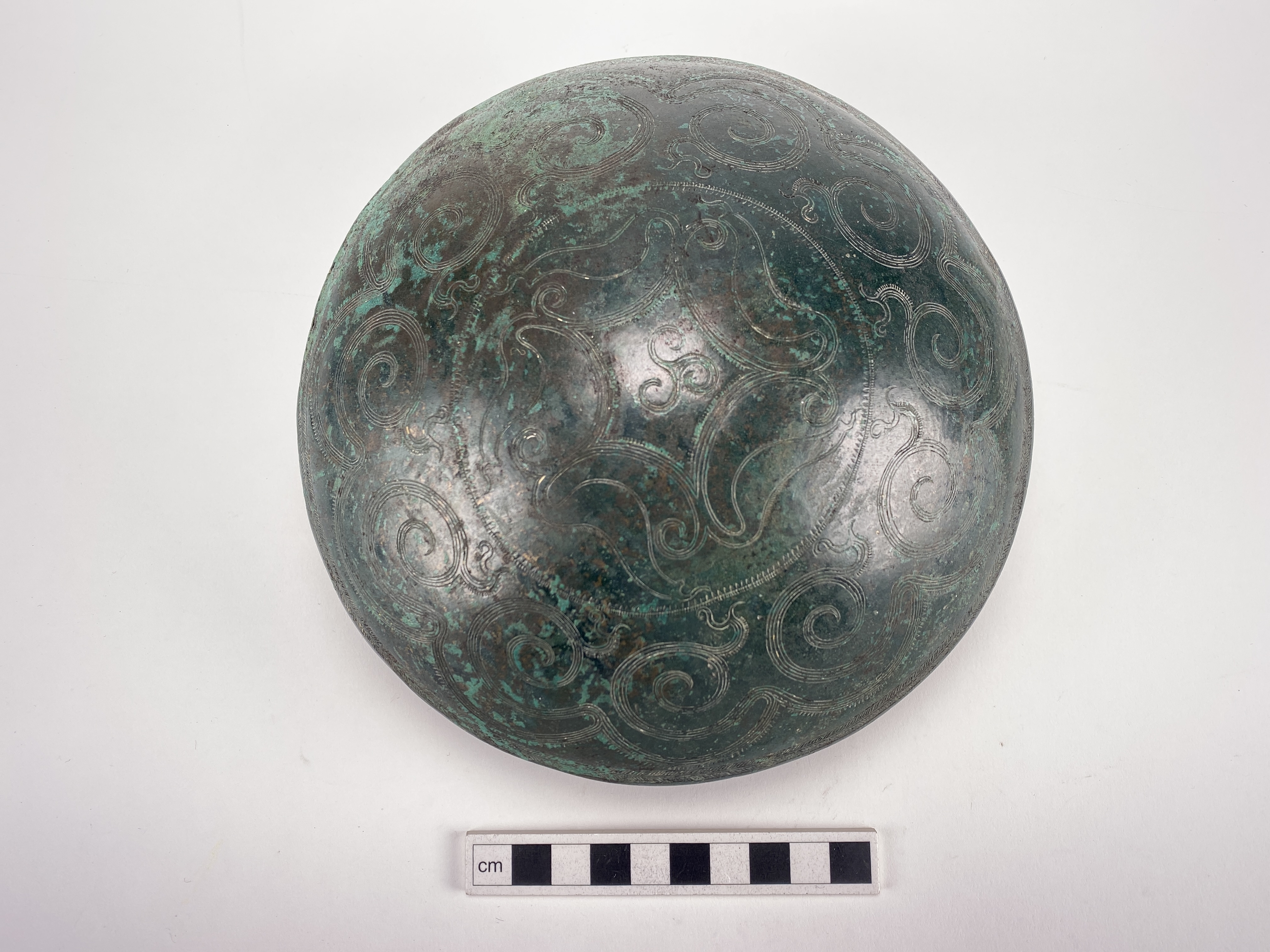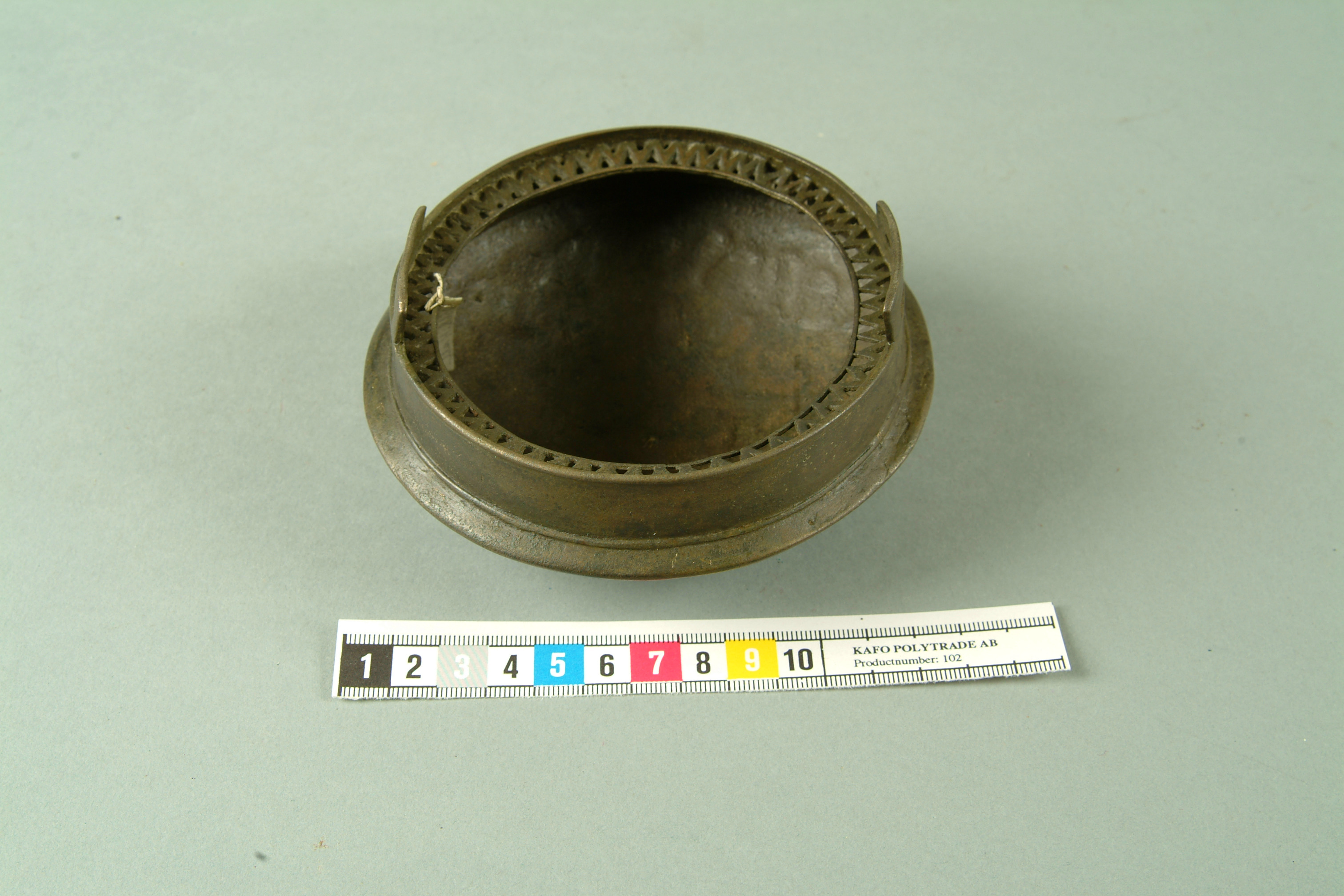 Bälteskål av brons med inpunsad ornamentik på botten, ganska fint arbete. Vid övergången mellan krage och hals en slät vulst, mynningen med genombruten kant.
