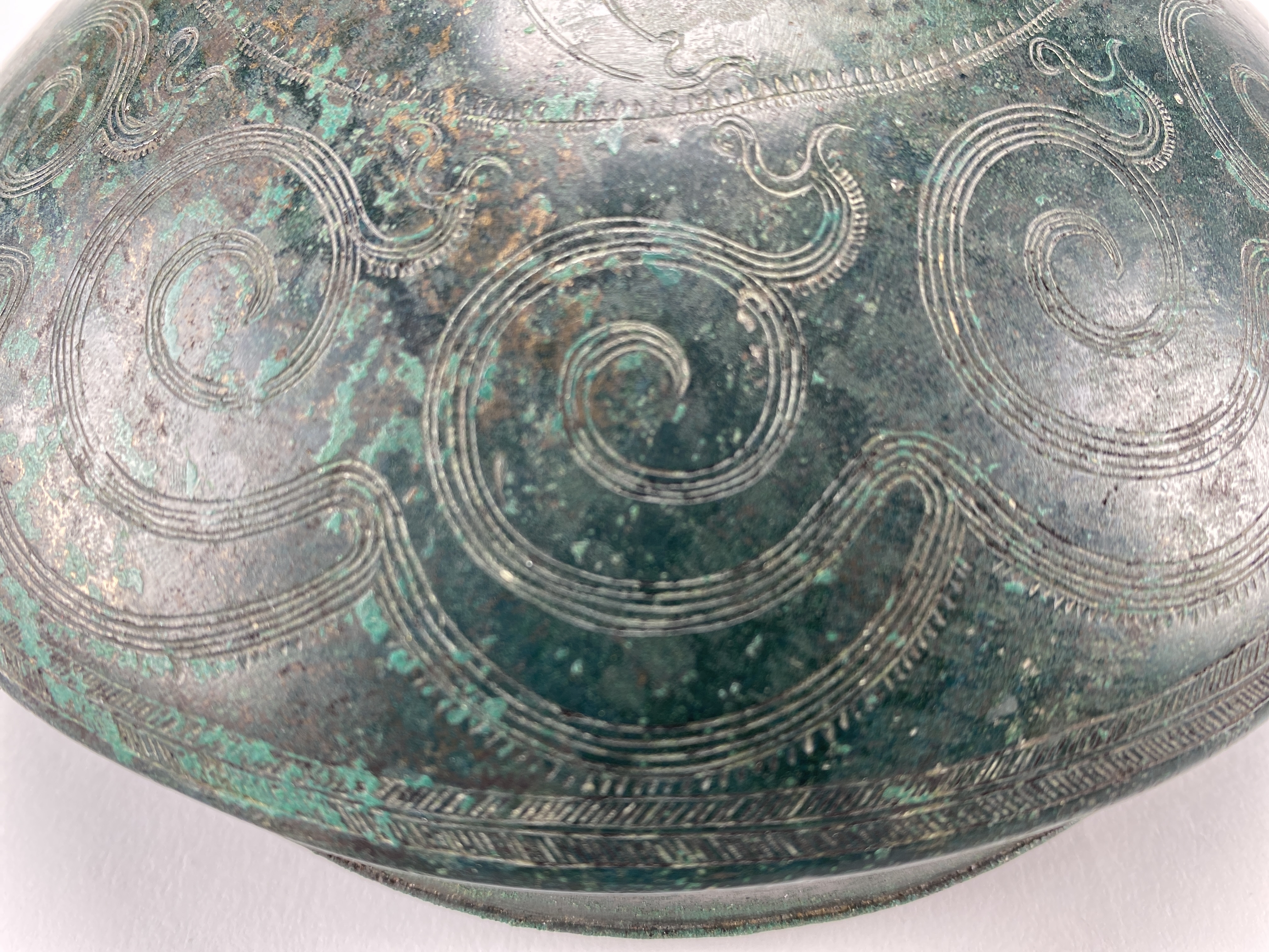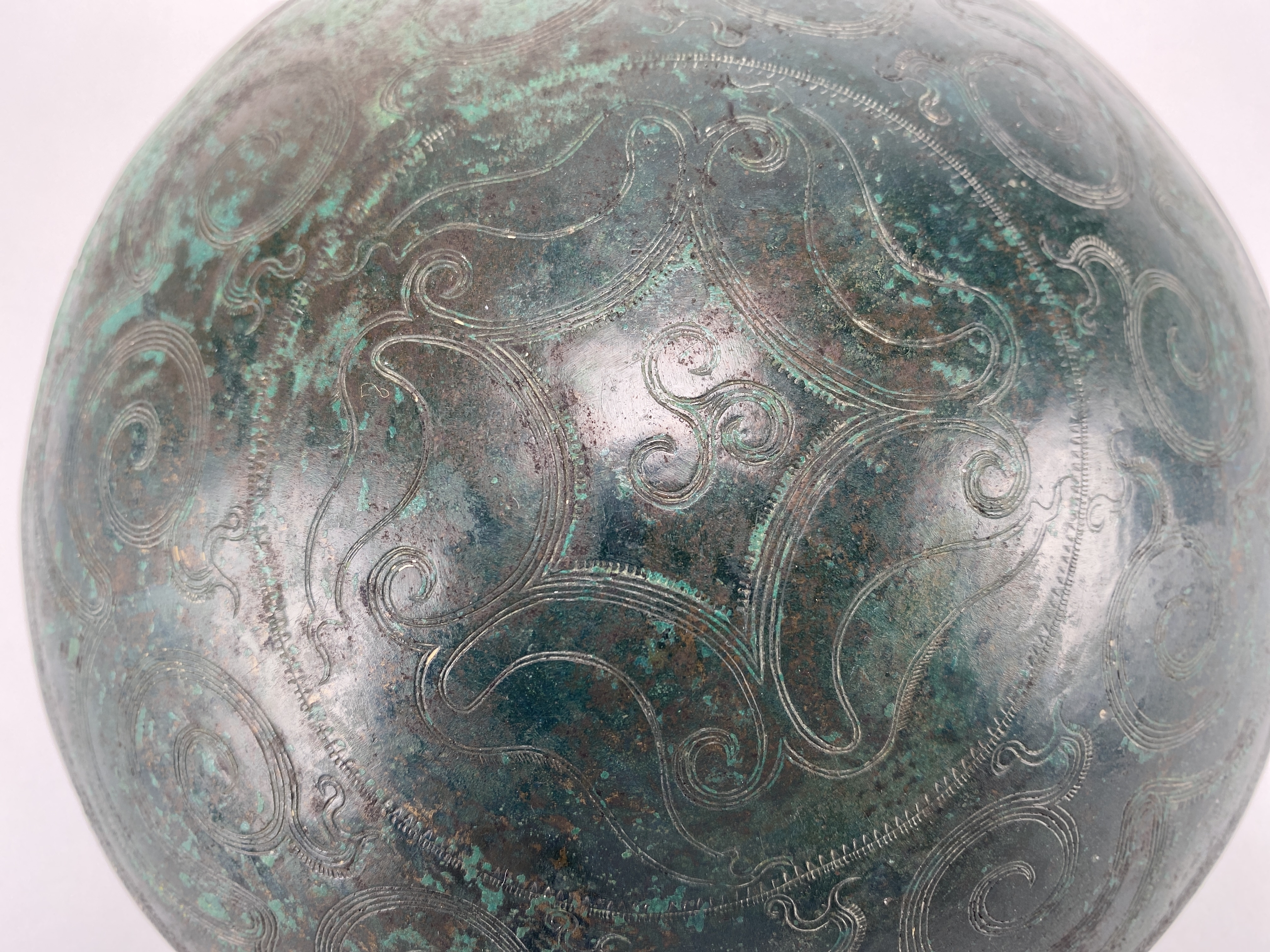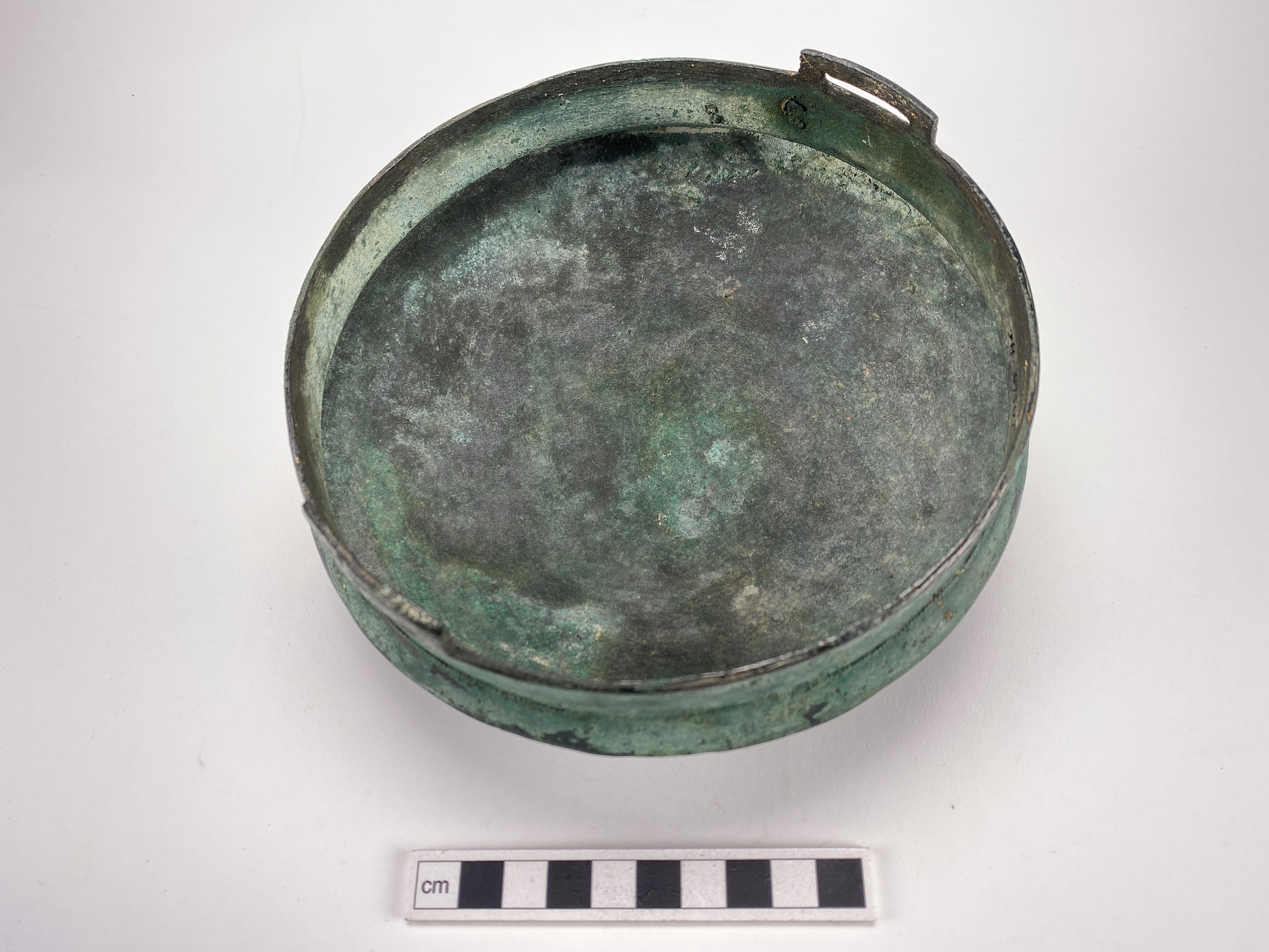 Bälteskål av brons med inpunsad ornamentik på botten, ganska fint arbete. Vid övergången mellan krage och hals en slät vulst, mynningen med genombruten kant.