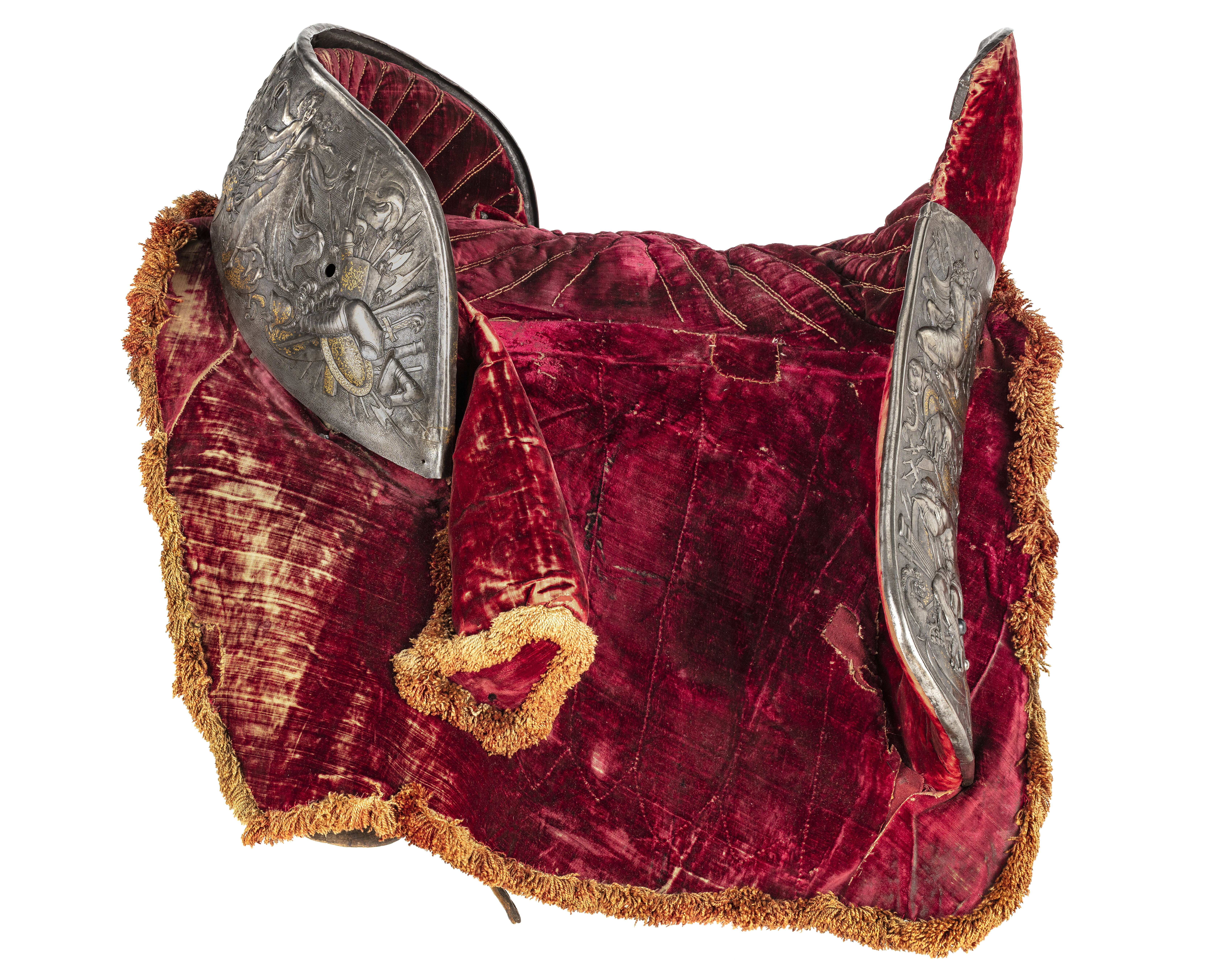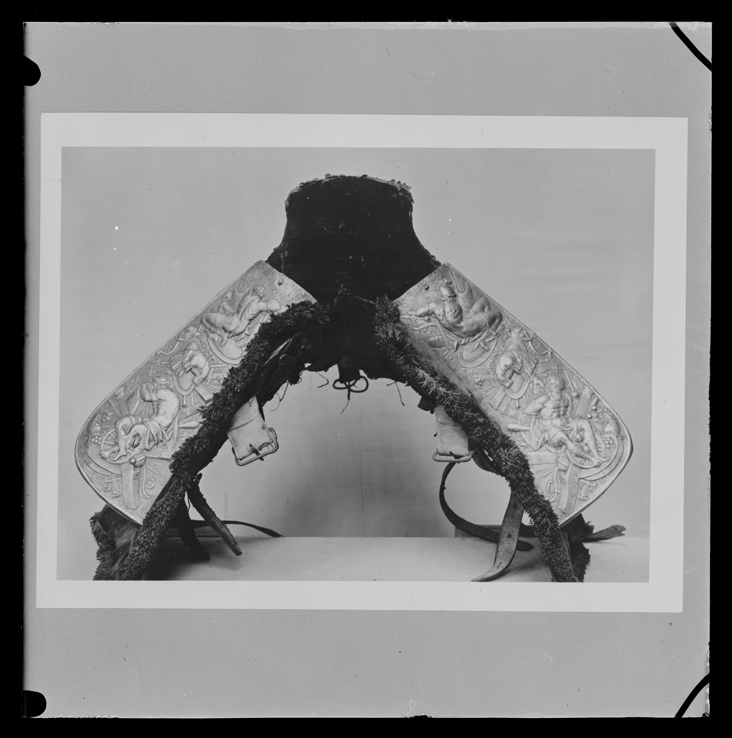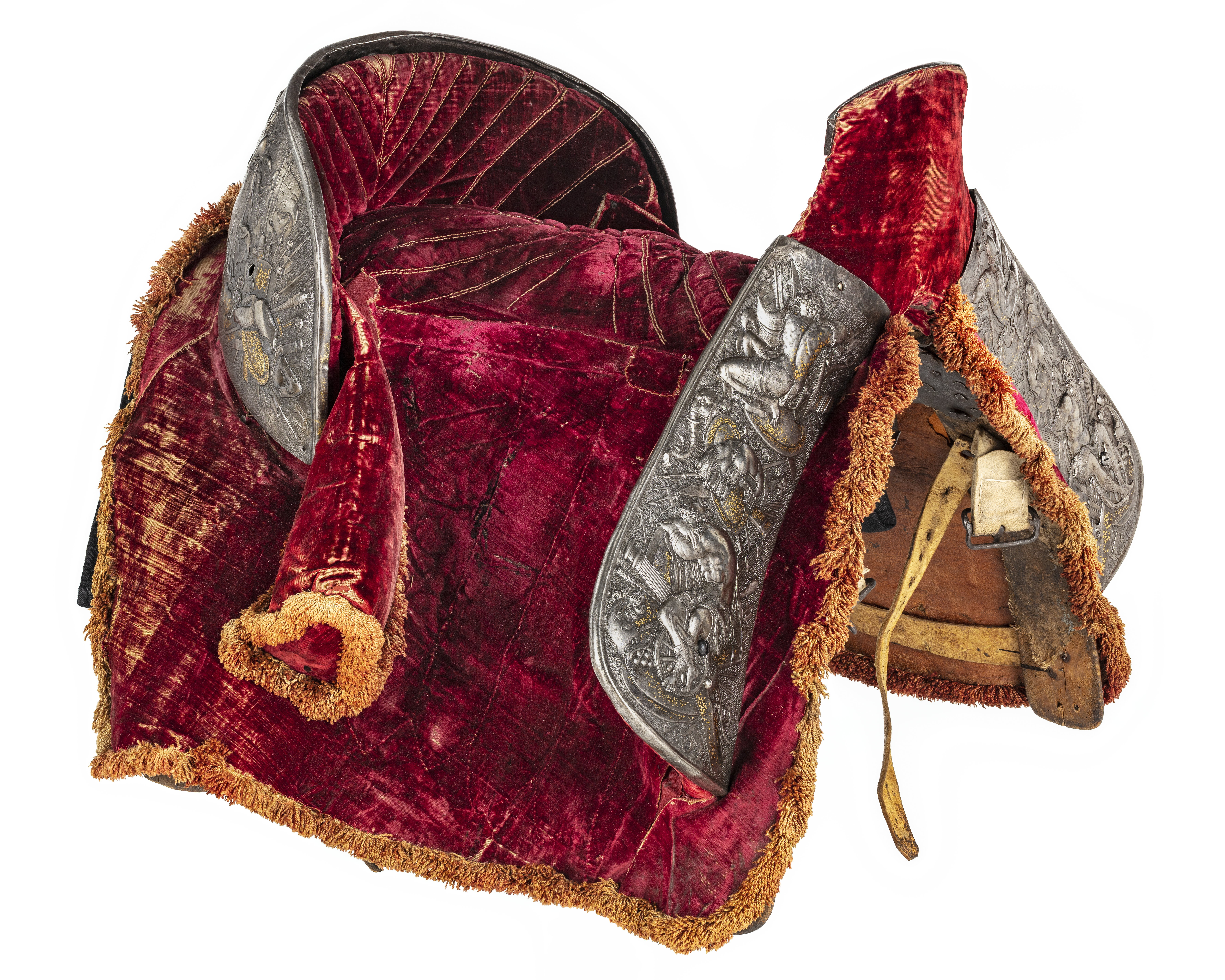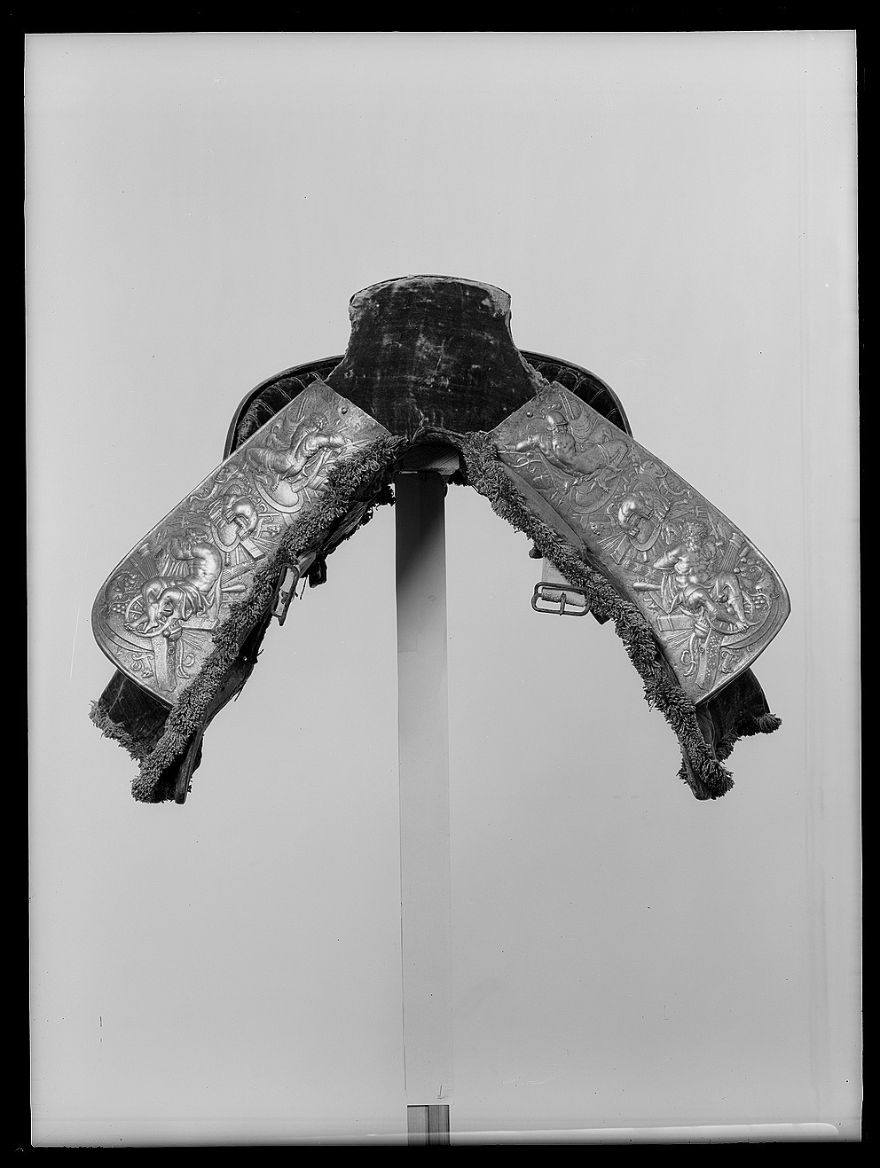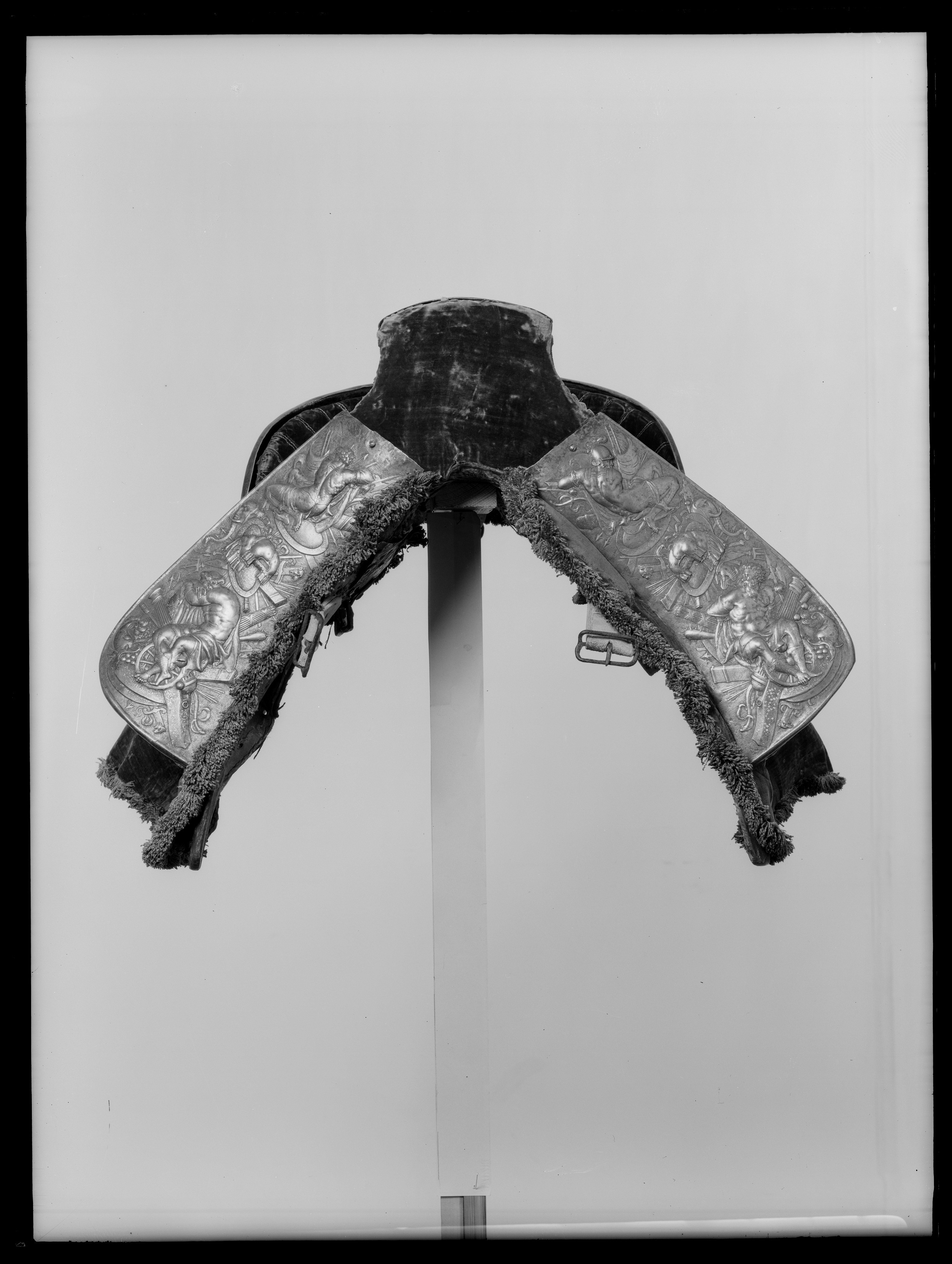 Harnesksadel med hög fram- och bakbom samt med en hög sadelknapp. Sadeln klädd med röd sammet och med fram- och bakbom förstärkt med stålplåt. Rektangulära kappor svagt rundade framtill. Kapporna kantade av en kort tät frans av gul och gulröd tvinnad silkestråd. Bakvalvet är förlängt i två rullade stycken av röd sammet troligen stoppade med tagel eller något liknande material. Dessa båda stycken är kantade av samma slags frans som kapporna. Sammetstyget har skarvats ihop av ett flertal stycken. Sitsen har sytts i ett mönster av sneda sömmar med en rak söm i mitten. Sömmarna är av gul silkestråd. Vid frambommen sitter ett vågformigt stycke kantat med gul silkestråd. Bakbom: L 450, h 138 mm. Driven stålplåt, välvd med sidorna sluttande nedåt. Nedre kanten rak. Övre kanten vikt inåt och utåt. Driven och ciselerad dekor med detaljer av påslaget guld och silver mot skrafferad yta. Heltäckande streckpunsad bakgrund. Fäst med skruv i var ände. Dekoren föreställer i vänstra och högra kanten fredsgenier i färd med att bränna vapen och rustningsdelar, i mitten ett groteskt huvud med upptill slingrande ormar. Frambom: L 340 b 100-140. Av två större plåtar och en mindre. De större plåtarna nedåt svagt ökande i bredd med nedre kanten lätt rundad. Övre långsidan vikt inåt 90 grader, övriga kanter raka och tvärt avklippta. Dekor i samma teknink som tidigare, motiv av fjättrade fångar och trofégrupper. Upptill på valvets insida en mindre plåt, l 155, h 43 mm, liknande bågformig rektangel. Nedre kanten rak och i sdorna och upptill vikt inåt 90 grader. Mot skrafferad yta påslaget sliver i små fyllda cirklar. Sadeln är på undersidan klädd med brunt läder och med ett mellantyg av beigefärgad lärft. Mitt på undersidan är sadeln klädd med grov beige säckväv och med två påsydda breda band. Längs med sidokapporna en träskena som bildar själva bommen. Mitt under sitsen två vertikala skenor av smitt stål med droppformade ändar fastnitade på träbommen. På vardera träskena sitter två spännen av stål. På träskenan är fastnitat två långa band av ljusgult skinn samt tre slåar med spännen av stål, två under framvalvet och en under bakvalvet. En slå av brunt läder på höger respektive vänster bakvalvs träskena.
