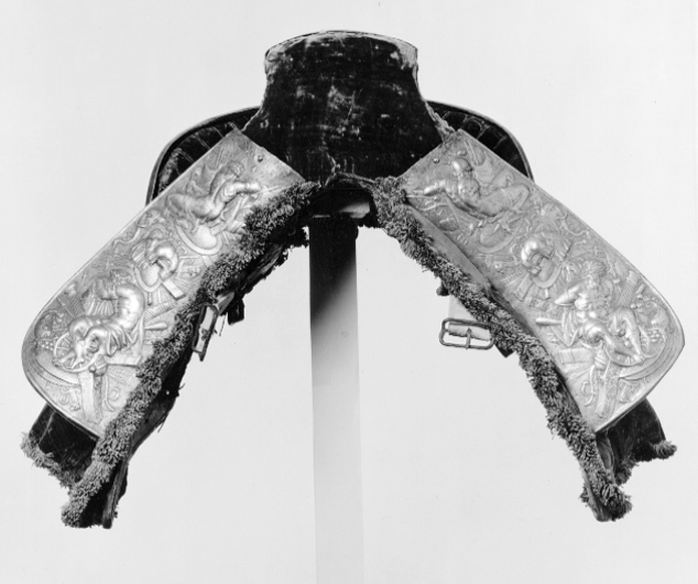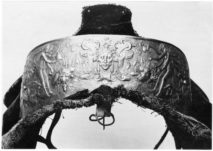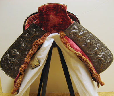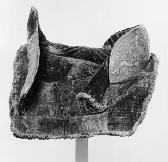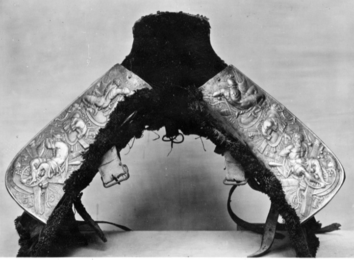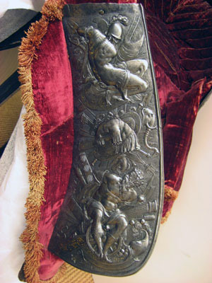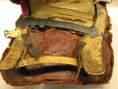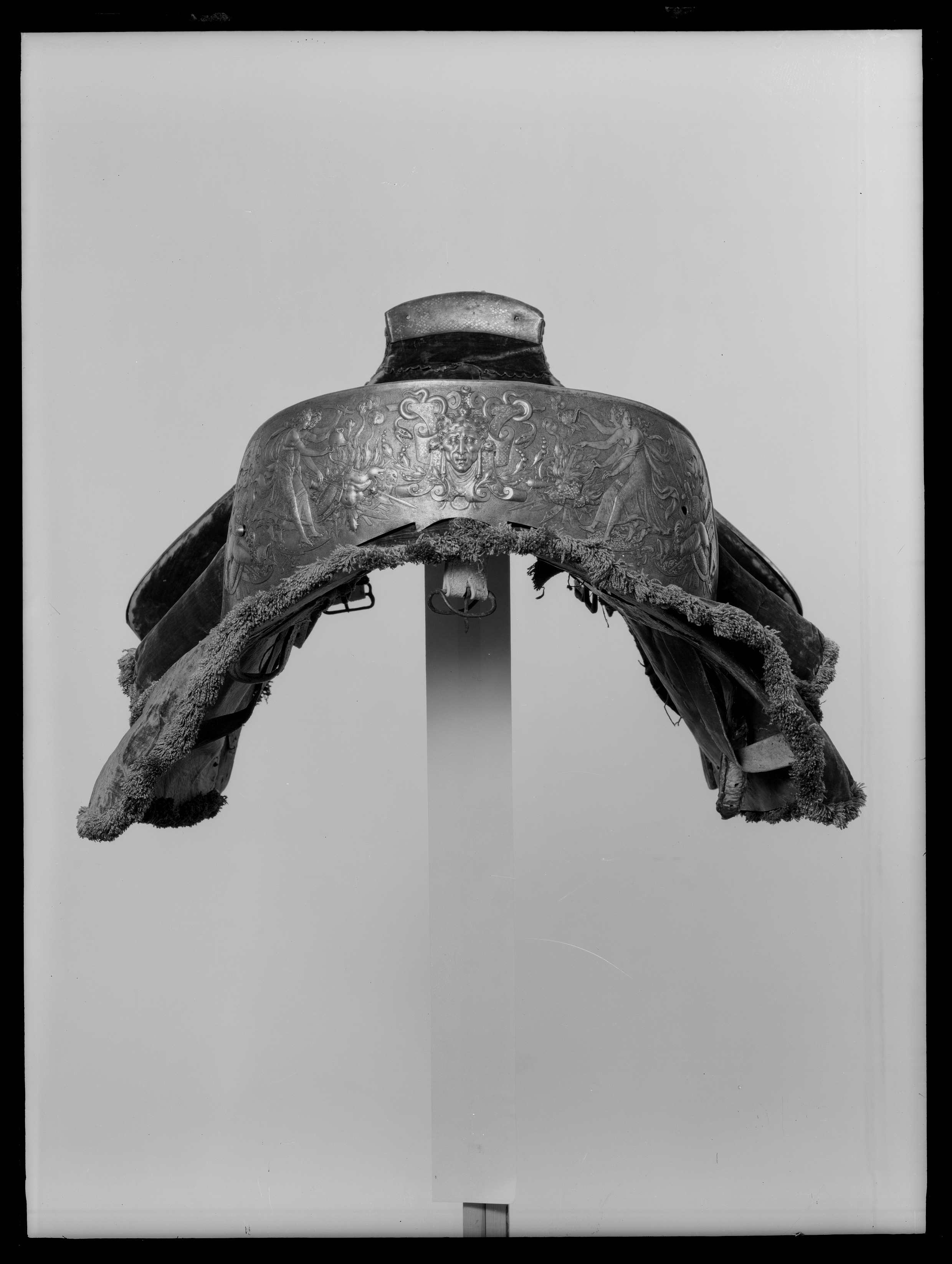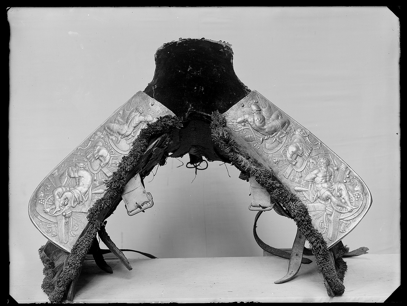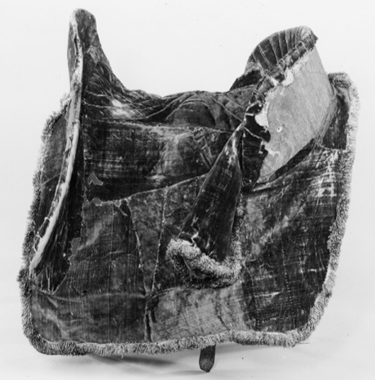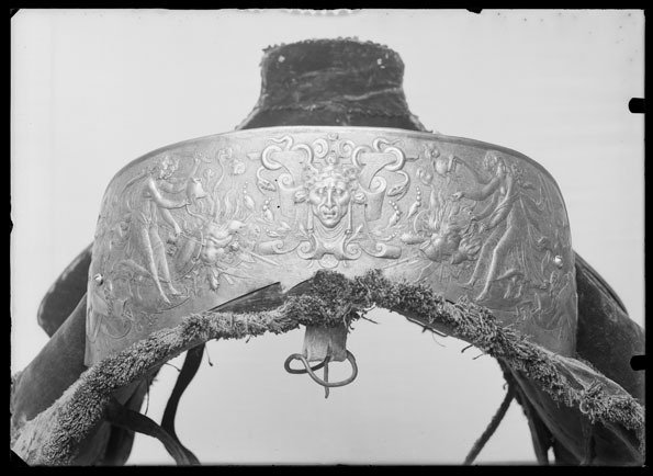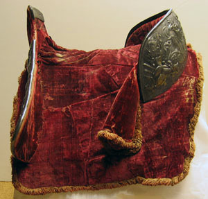 Harnesksadel med hög fram- och bakbom samt med en hög sadelknapp. Sadeln klädd med röd sammet och med fram- och bakbom förstärkt med stålplåt. Rektangulära kappor svagt rundade framtill. Kapporna kantade av en kort tät frans av gul och gulröd tvinnad silkestråd. Bakvalvet är förlängt i två rullade stycken av röd sammet troligen stoppade med tagel eller något liknande material. Dessa båda stycken är kantade av samma slags frans som kapporna. Sammetstyget har skarvats ihop av ett flertal stycken. Sitsen har sytts i ett mönster av sneda sömmar med en rak söm i mitten. Sömmarna är av gul silkestråd. Vid frambommen sitter ett vågformigt stycke kantat med gul silkestråd. Bakbom: L 450, h 138 mm. Driven stålplåt, välvd med sidorna sluttande nedåt. Nedre kanten rak. Övre kanten vikt inåt och utåt. Driven och ciselerad dekor med detaljer av påslaget guld och silver mot skrafferad yta. Heltäckande streckpunsad bakgrund. Fäst med skruv i var ände. Dekoren föreställer i vänstra och högra kanten fredsgenier i färd med att bränna vapen och rustningsdelar, i mitten ett groteskt huvud med upptill slingrande ormar. Frambom: L 340 b 100-140. Av två större plåtar och en mindre. De större plåtarna nedåt svagt ökande i bredd med nedre kanten lätt rundad. Övre långsidan vikt inåt 90 grader, övriga kanter raka och tvärt avklippta. Dekor i samma teknink som tidigare, motiv av fjättrade fångar och trofégrupper. Upptill på valvets insida en mindre plåt, l 155, h 43 mm, liknande bågformig rektangel. Nedre kanten rak och i sdorna och upptill vikt inåt 90 grader. Mot skrafferad yta påslaget sliver i små fyllda cirklar. Sadeln är på undersidan klädd med brunt läder och med ett mellantyg av beigefärgad lärft. Mitt på undersidan är sadeln klädd med grov beige säckväv och med två påsydda breda band. Längs med sidokapporna en träskena som bildar själva bommen. Mitt under sitsen två vertikala skenor av smitt stål med droppformade ändar fastnitade på träbommen. På vardera träskena sitter två spännen av stål. På träskenan är fastnitat två långa band av ljusgult skinn samt tre slåar med spännen av stål, två under framvalvet och en under bakvalvet. En slå av brunt läder på höger respektive vänster bakvalvs träskena.