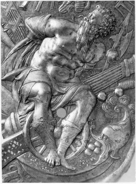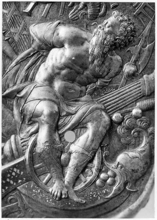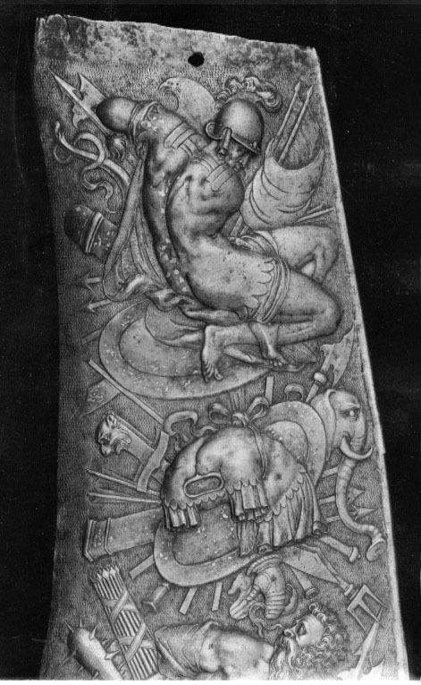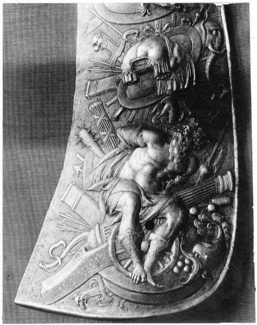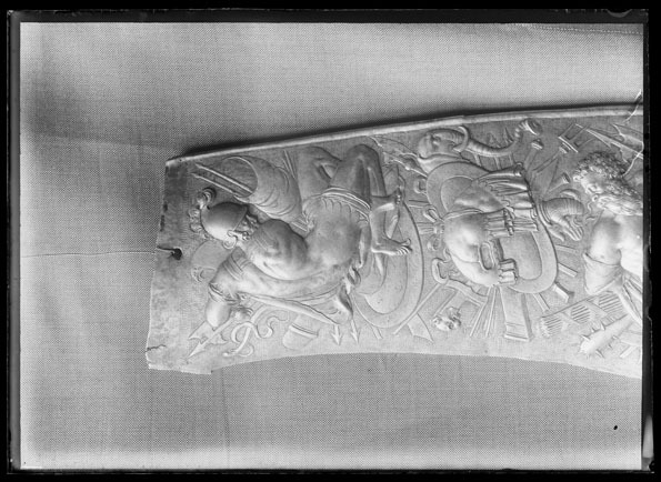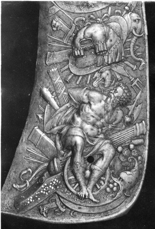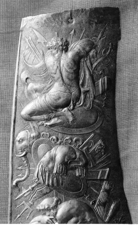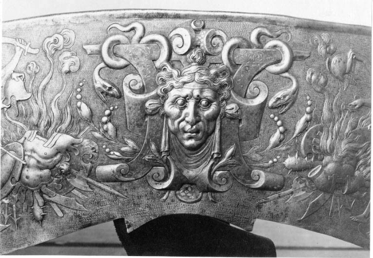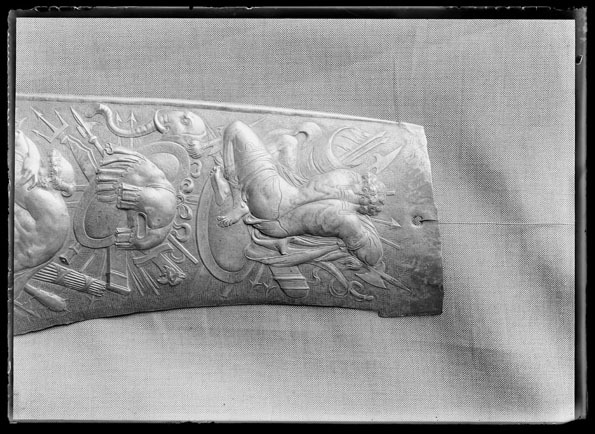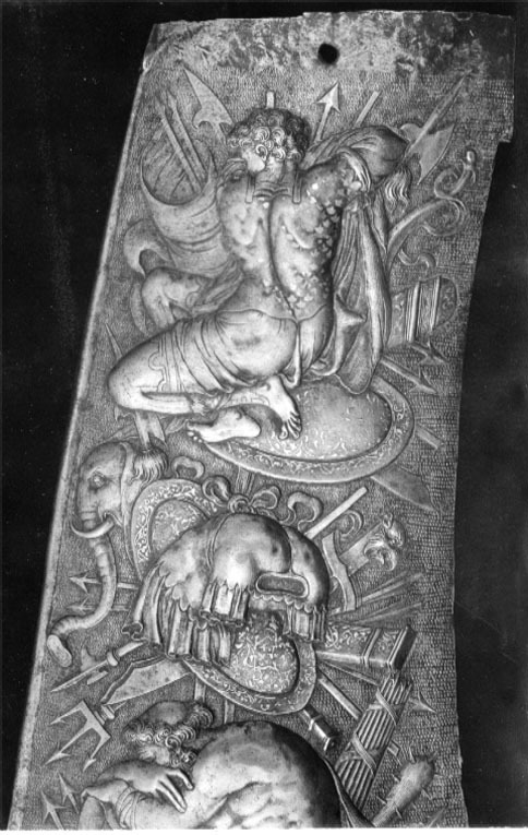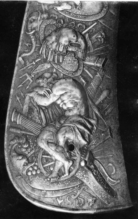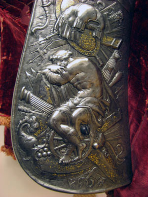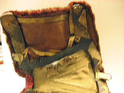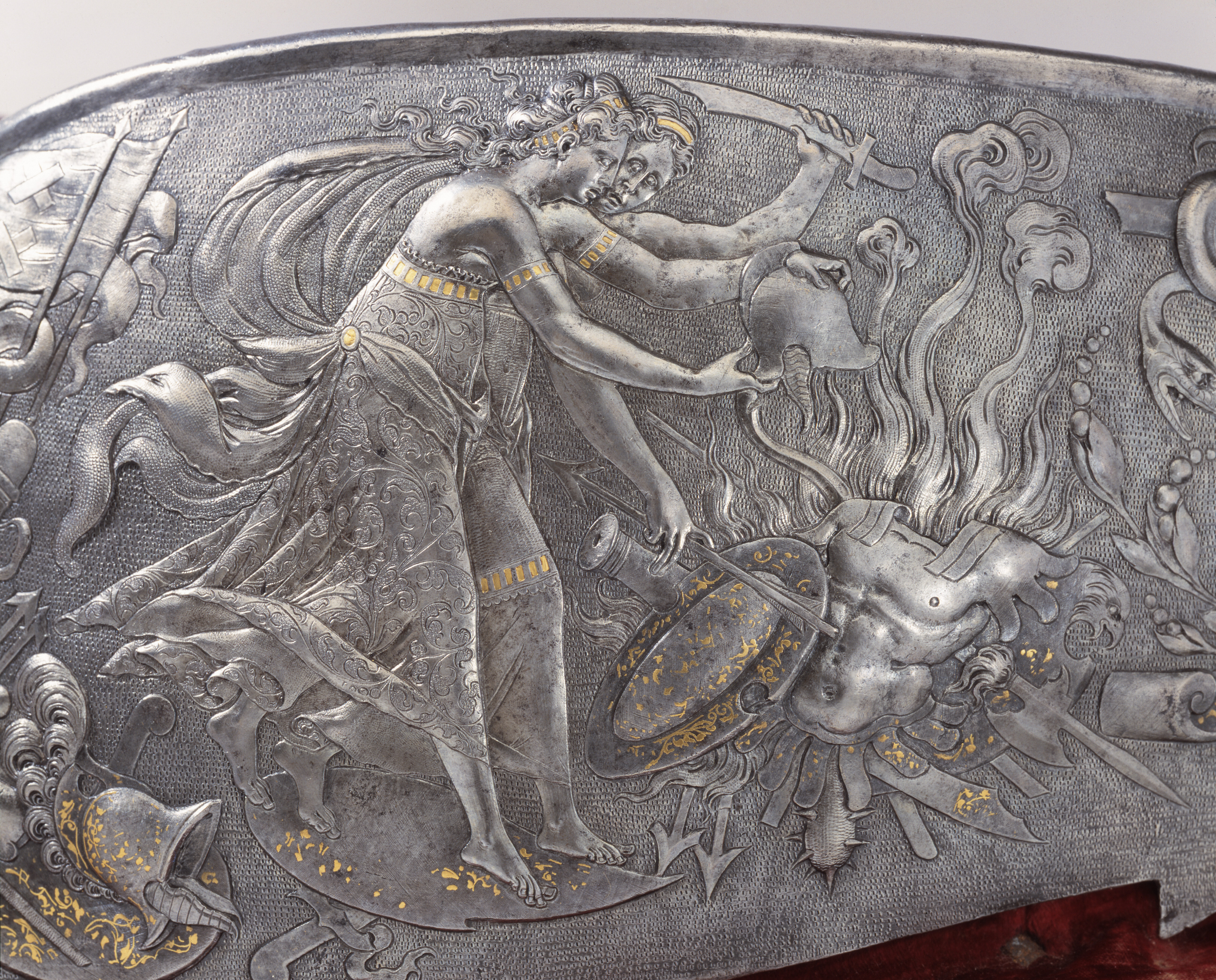 Harnesksadel med hög fram- och bakbom samt med en hög sadelknapp. Sadeln klädd med röd sammet och med fram- och bakbom förstärkt med stålplåt. Rektangulära kappor svagt rundade framtill. Kapporna kantade av en kort tät frans av gul och gulröd tvinnad silkestråd. Bakvalvet är förlängt i två rullade stycken av röd sammet troligen stoppade med tagel eller något liknande material. Dessa båda stycken är kantade av samma slags frans som kapporna. Sammetstyget har skarvats ihop av ett flertal stycken. Sitsen har sytts i ett mönster av sneda sömmar med en rak söm i mitten. Sömmarna är av gul silkestråd. Vid frambommen sitter ett vågformigt stycke kantat med gul silkestråd. Bakbom: L 450, h 138 mm. Driven stålplåt, välvd med sidorna sluttande nedåt. Nedre kanten rak. Övre kanten vikt inåt och utåt. Driven och ciselerad dekor med detaljer av påslaget guld och silver mot skrafferad yta. Heltäckande streckpunsad bakgrund. Fäst med skruv i var ände. Dekoren föreställer i vänstra och högra kanten fredsgenier i färd med att bränna vapen och rustningsdelar, i mitten ett groteskt huvud med upptill slingrande ormar. Frambom: L 340 b 100-140. Av två större plåtar och en mindre. De större plåtarna nedåt svagt ökande i bredd med nedre kanten lätt rundad. Övre långsidan vikt inåt 90 grader, övriga kanter raka och tvärt avklippta. Dekor i samma teknink som tidigare, motiv av fjättrade fångar och trofégrupper. Upptill på valvets insida en mindre plåt, l 155, h 43 mm, liknande bågformig rektangel. Nedre kanten rak och i sdorna och upptill vikt inåt 90 grader. Mot skrafferad yta påslaget sliver i små fyllda cirklar. Sadeln är på undersidan klädd med brunt läder och med ett mellantyg av beigefärgad lärft. Mitt på undersidan är sadeln klädd med grov beige säckväv och med två påsydda breda band. Längs med sidokapporna en träskena som bildar själva bommen. Mitt under sitsen två vertikala skenor av smitt stål med droppformade ändar fastnitade på träbommen. På vardera träskena sitter två spännen av stål. På träskenan är fastnitat två långa band av ljusgult skinn samt tre slåar med spännen av stål, två under framvalvet och en under bakvalvet. En slå av brunt läder på höger respektive vänster bakvalvs träskena.
