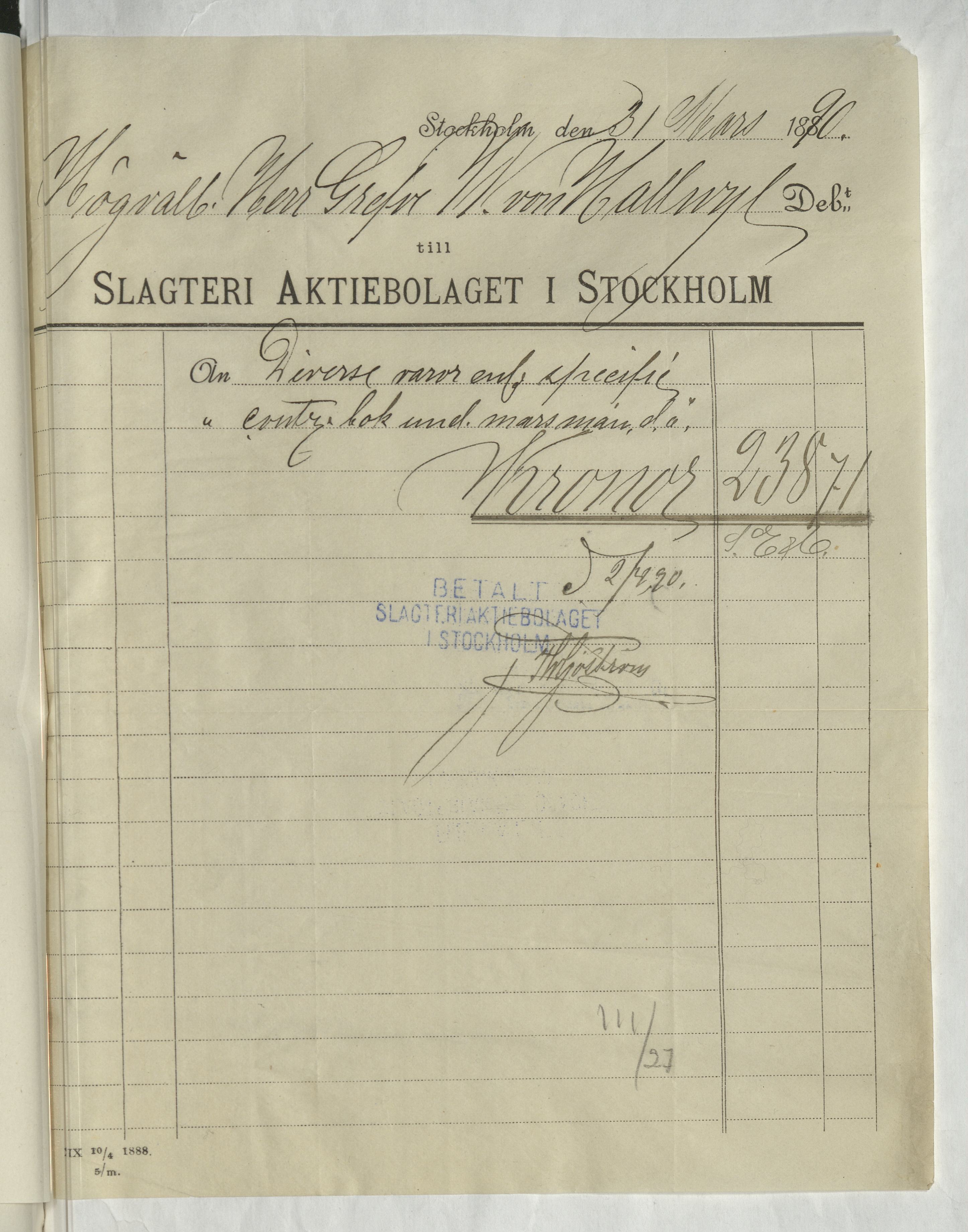 Kvitto från Slagteri Aktiebolaget i Stockholm