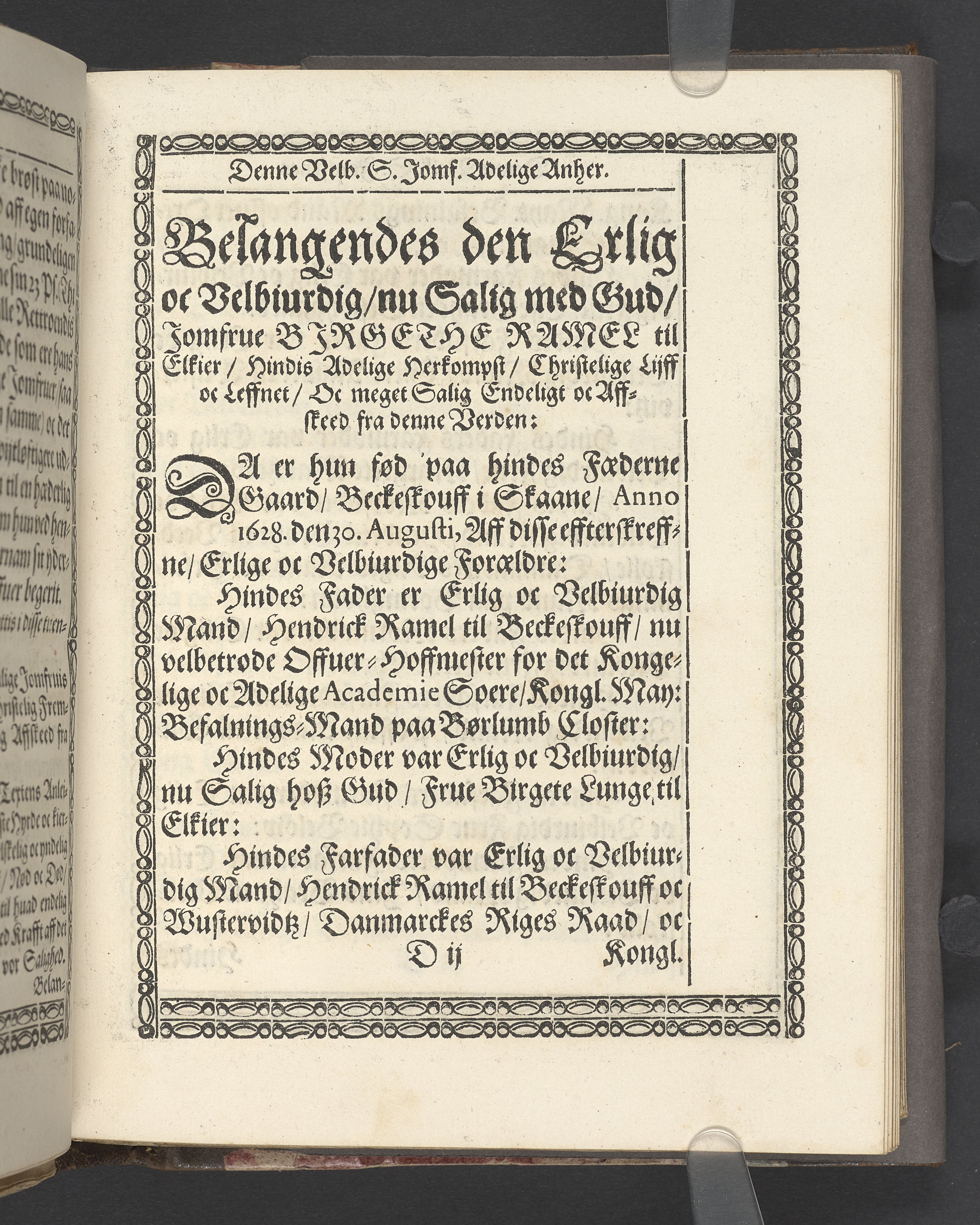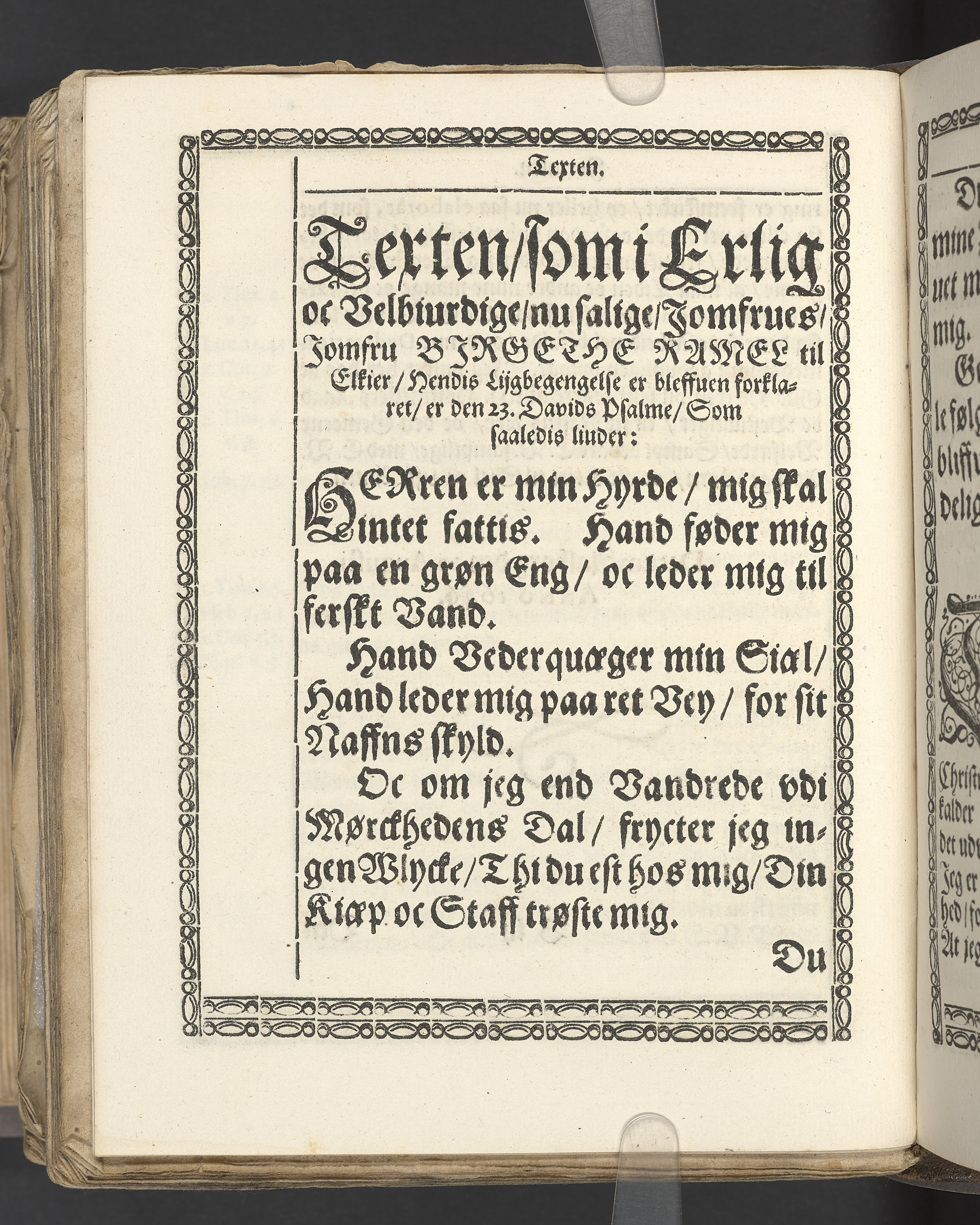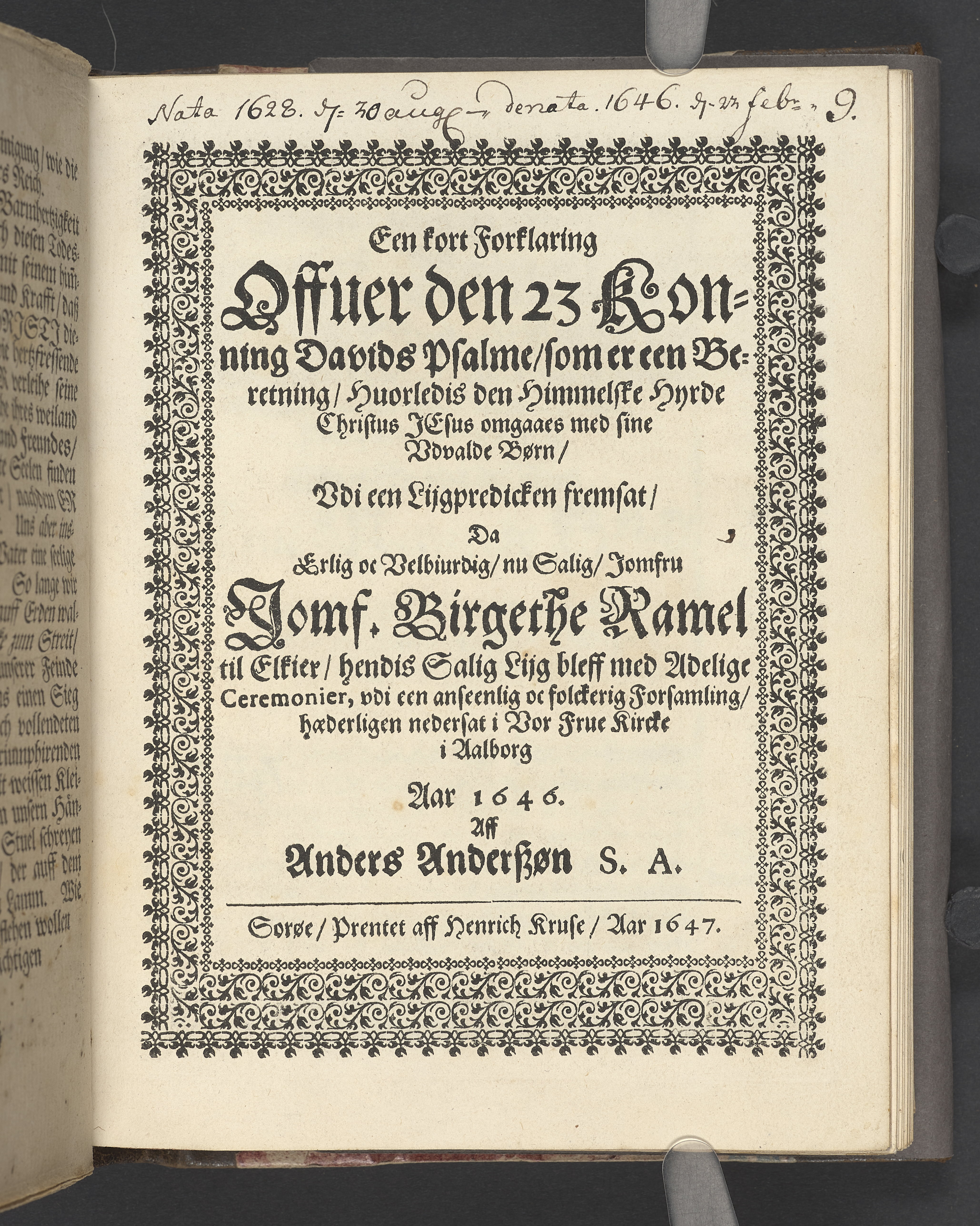 Een kort Forklaring Offuer den 23 Konung Davids Psalme/ som er een Beretning/ Huorledis den Himmelske Hyrde Christus Jesus omgaaes med sine Udvolde Børn/ Udi een Lijgpredicken fremsat/ Da Erlig oc Velbiurdig/ nu Salig/ Jomfru Jomf. Birgethe Ramel til Elkier/ hendis Salig Lijg bleff med Adelige Ceremonier, udi een anseenlig och folckerig Forsamling/ haederliugen nedersat i Vor Frue Kircke i Aalborg Aar 1646. Aff Anders Anderßøn S.A. Sorøe/ Prentet aff Henrich Kruse/ Aar 1647.