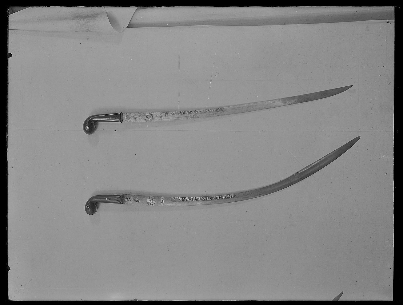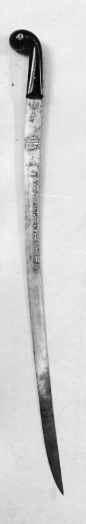 Fäste av polerat trä med rundad böjd ytterände och skenor av silver med fräcklad dekor. Genom ytteränden en bössning av silver. Eneggad klinga av stål med plan rygg, något böjd ytterände. Klingans utsida har påslagen dekor av guld i form av cirkel med orientaliska skrivtecken och en rad med skrivtecken längs ryggen. Carl Robert Lamms samling nr 1154. Inköpt för 360:-, deposition genom intendent friherre Rudolf Cederström, 1922-00-00. Såld till Lamm av Fredrik Robert Martin 1901-04-22.