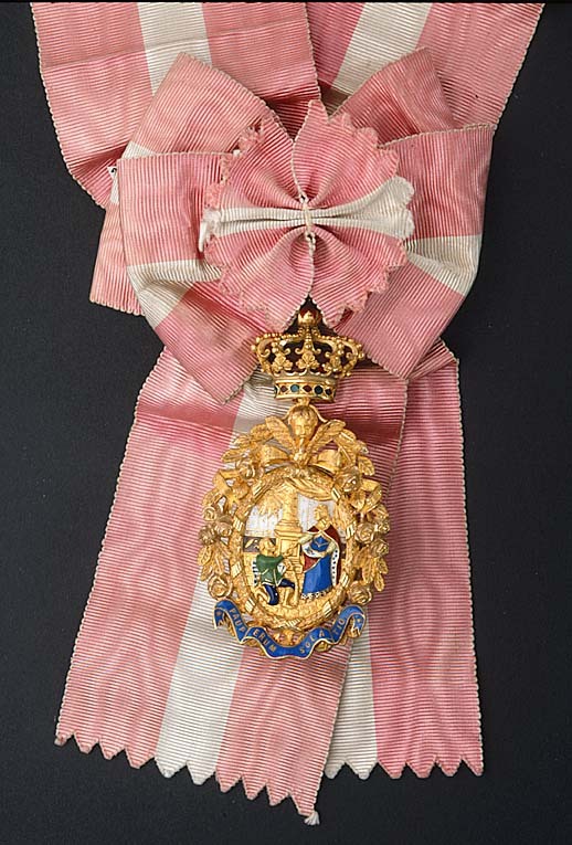 Polykrom, oval medaljong med i hög relief S:ta Isabella i blå klänning och hermelinsfodrad, röd mantel, krona på huvudet, överräckande en allmosa till en framför henne knäböjande tiggare, blå knäbyxor, grön rock, vit-svart band över axeln. I bakgrunden en brunemaljerad balustrad, pelare med draperi, upptill till v. Guds allseende öga omgivet av strålkrans. Bakgrunden vit med mönster i guld. Medaljongen omgiven av en lagerkrans i guld i hög relief, omlindad med blanka, räfflade band, lagda i kors nertill. Därutanför på övre hälften en genombruten krans av två rosenkvistar i hög relief, ihopknuten upptill med en rosett, därovanför en seraf. På kransen nertill ett emaljerat textband, ljusblå emalj, guldtext:"PAUPERUM SOLATIO". Frånsidans medaljongen täckt av vit emalj med ljusblå kantring, i den vita emaljen monogram av guld: C I, därovanför en oval lagerkrans, i den blå emaljen guldtext: "REAL ORDEM DE SANTA IZABEL", nertill över den vita och delvis över den blå ett mörkblått band med guldtext: "MDCCCI". Ovanför serafens huvud en kula, däri fäst med scharner en kunglig krona av guld samt röd och grön emalj, rödemaljerad hätta. Igenom äpplet draget en bandring av guld. Vid kronan fäst en pappersetikett med bläckpåskrift: "Nr 280".