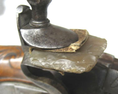 Gulgrå flinta, fyrsidig med sluttande fint tillslagna kanter och rak spets. Enkel mantel av en bit ljust skinn.