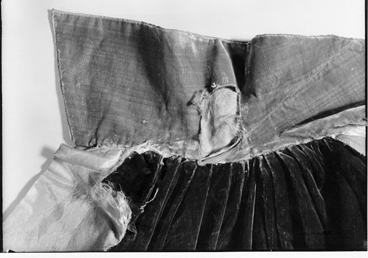 Sydd i mörkt röd sammet med guldtyg på krage och slag. Kappan är sydd med raka våder fram, mot framkanten och baktill mot mitten bak. Sidostyckena, två på varje sida är däremot kilformade och försvinner helt före halsen uppe under kragen. Modellen är vid med lagda veck mot halsen som är ganska flack med två knäpphällor/tampar i sammet som håller kappan på plats. Kappan ska hänga baktill (jfr andra ordenskappor). Överkragen och utsidan på slagen är i guldtyg. Kragen har synlig söm mitt bak. Guldtyget är vävt i kypert, samma guldtyg har använts till kanten nedtill. Guldtygets stad väl synlig men ingen firmastämpel funnen. Underkragen i gul/röd sammet av annan sort än yttertyget. Den är skarvad på flera ställen. Inne i kragen finns mellanfoder i grovt tuskaftsvävt linne. Under kanten på slaget finns en 3,5 cm bred invikning i samma satin som fodret, mitt i slagets veck syns hur sammeten har fästs mot guldtyget. Fodret i sidensatin skuret som yttertyget. Innerfickor med liggande stolpar och stora fickpåsar i rosa taft.