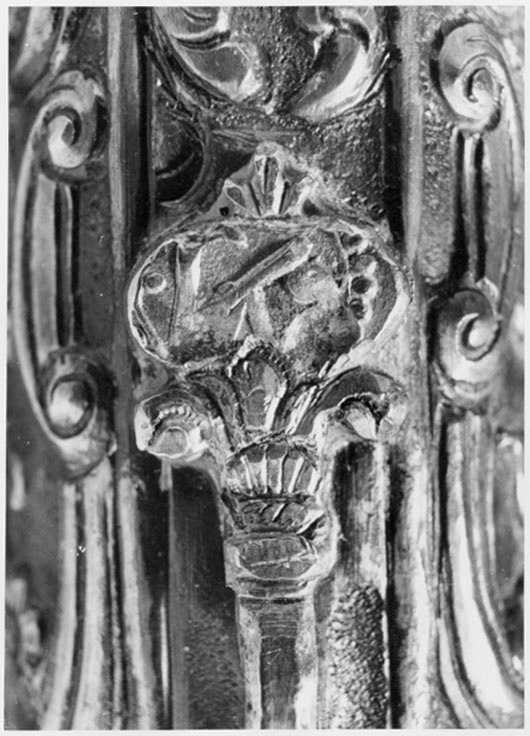 Fäste av graverat silver med dekor i form av blad. Kavel bestående av två plattor av röd agat med mot eggen böjd ytterände i två avsatser. På kavelsidorna är tre smaragder infattade i silver. Plattorna sammanbinds med ett band av silver med flätbandsdekor, graverad mot punsad bakgrund. Holken övergår i triangulära beslag av silver, på klingbasen med graverad dekor i form av voluter och bandornamentik. Klinga av damaskerat stål med hålkäl längs större delen av ryggen, på klingryggen tre åsar längs mitten. Klingans rygg något konvex och framåtböjd, eggen utdraget s-formad.