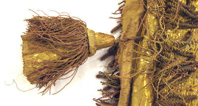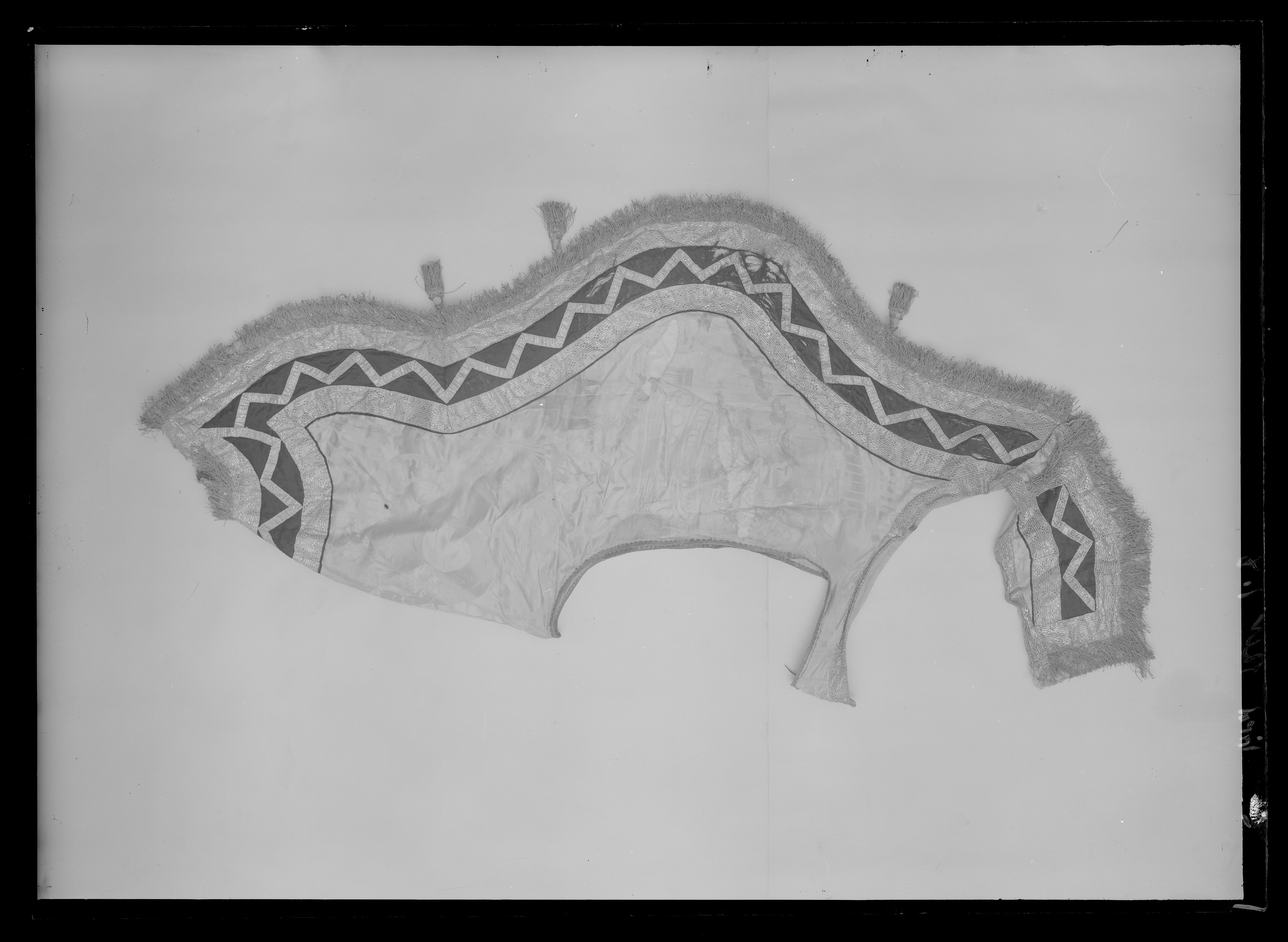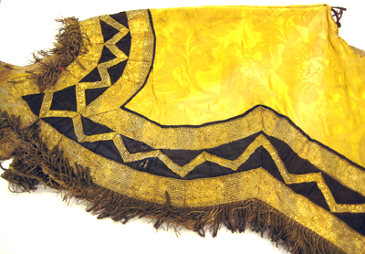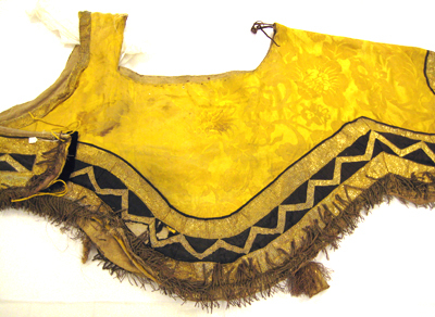 Schabrak av gul sidendamast nedtill vågformigt skuret och en öppning för sadeln upptill, en rund öppning för svans bak samt med ett smalt stycke vid manken. På vardera sida fram är påsytt ett rektangulärt stycke att fästas runt bogen. Vid det smala stycket vid manken sitter två söndriga, bruna läderband och vid de båda påsydda framstyckena är påsytt fyra gula linneband. Upptill i övre kanten runtom öppningen för sadeln är sytt med grova stygn. Schabraket kantas nedtill av svart siden garnerat med två breda guldgaloner, b. 45-50 mm, och däremellan av en smalare galon, b. 20 mm, påsydd i ett viggmönster. En galon kantar även det smala stycket framme vid manken. Galonerna är av förgyllda silverlan och av gul silkestråd. Nederst kantas schabraket av en frans, l. 60 mm, av tvinnad förgylld silvertråd och av rödaktig koppartråd samt med buljoner av rödaktig koppartråd. Under fransen är påsytt en kappa av förgyllda silverlan. Vid fransen, vid schabrakets mitt, sitter påsytt två tofsar, l. 110 mm, med frans av rödaktig, tvinnad koppartråd och med en underliggande kappa som stöd, av rödaktig koppartråd och förgyllda lan. Schabraket är fodrat med grov beige säckväv.
