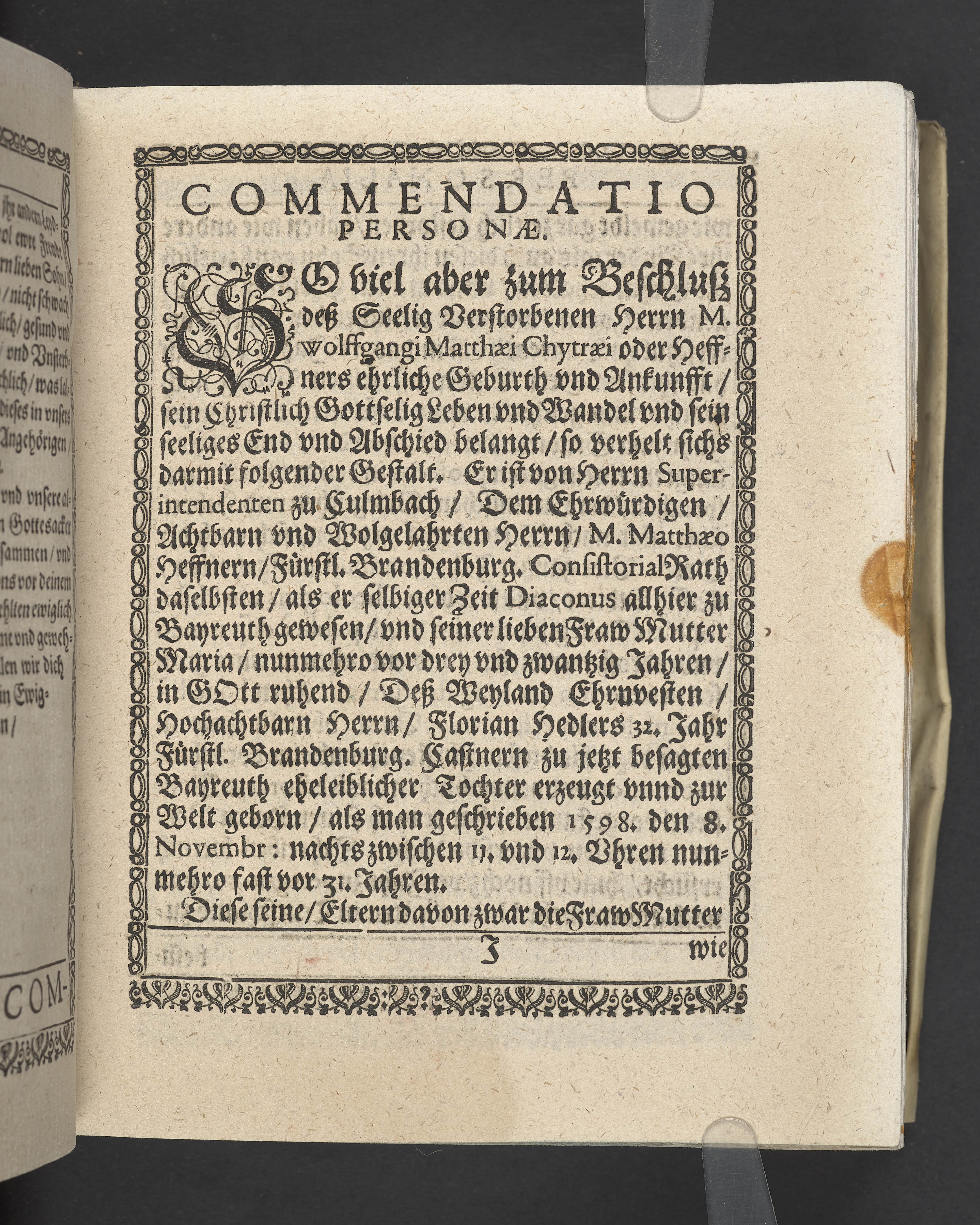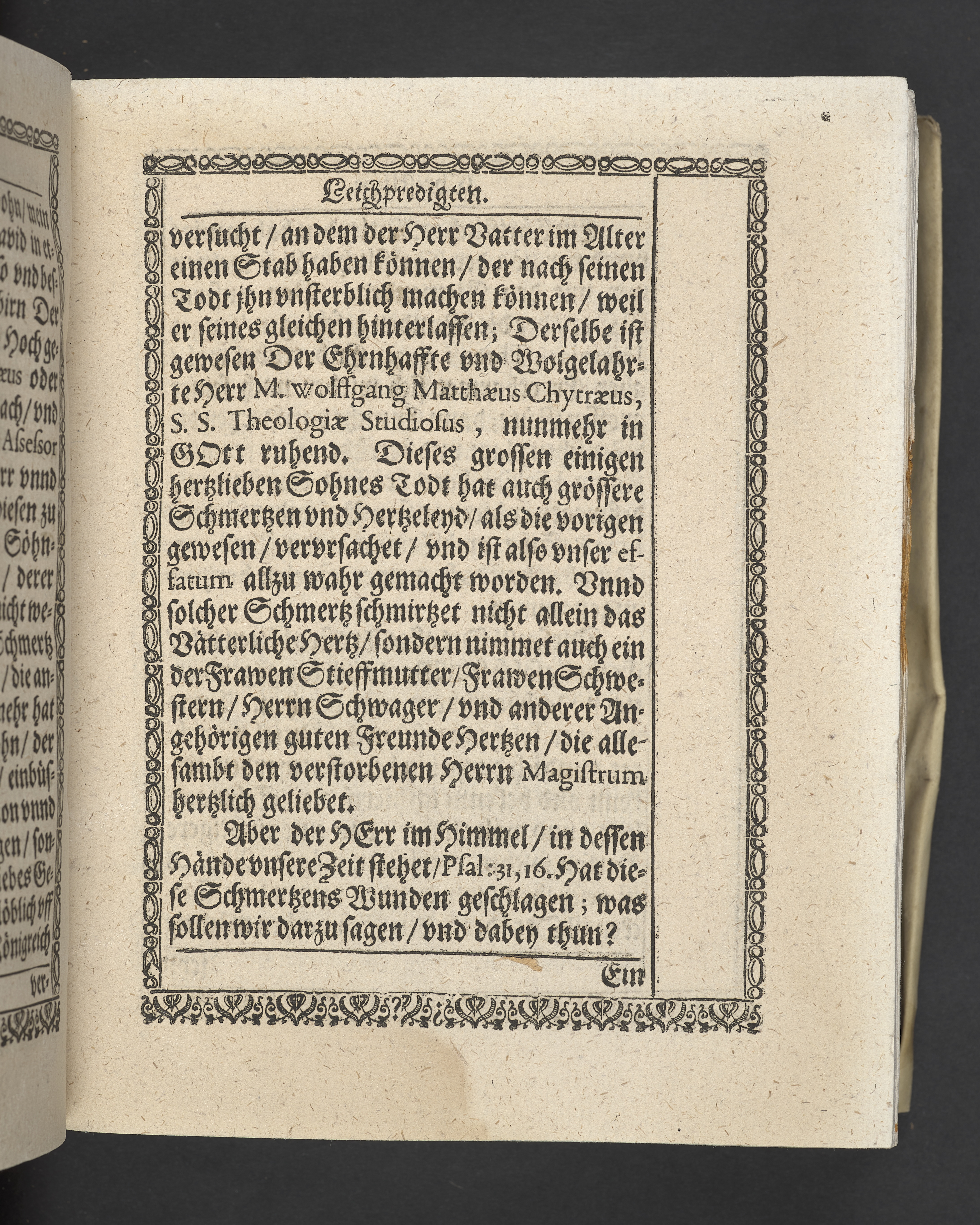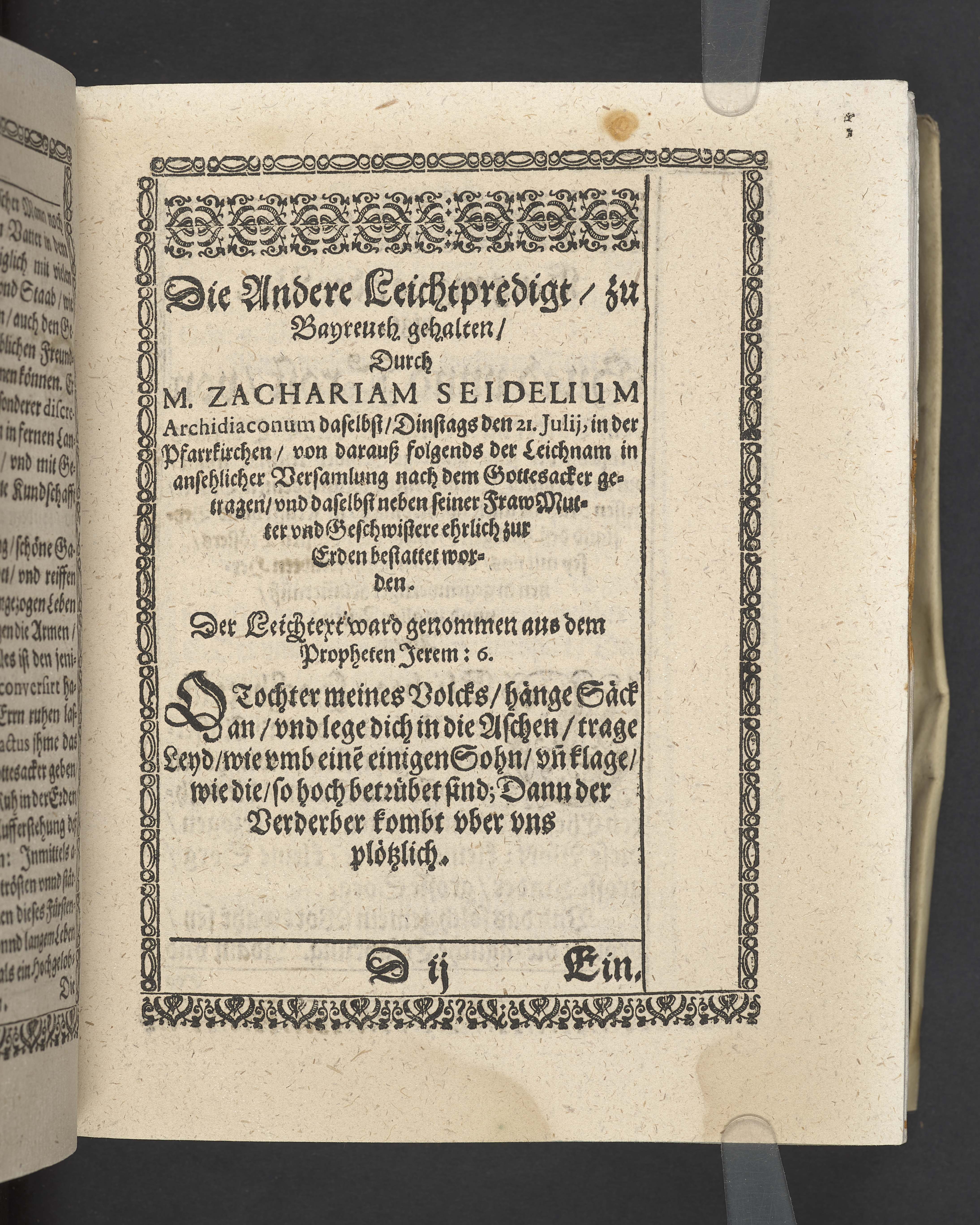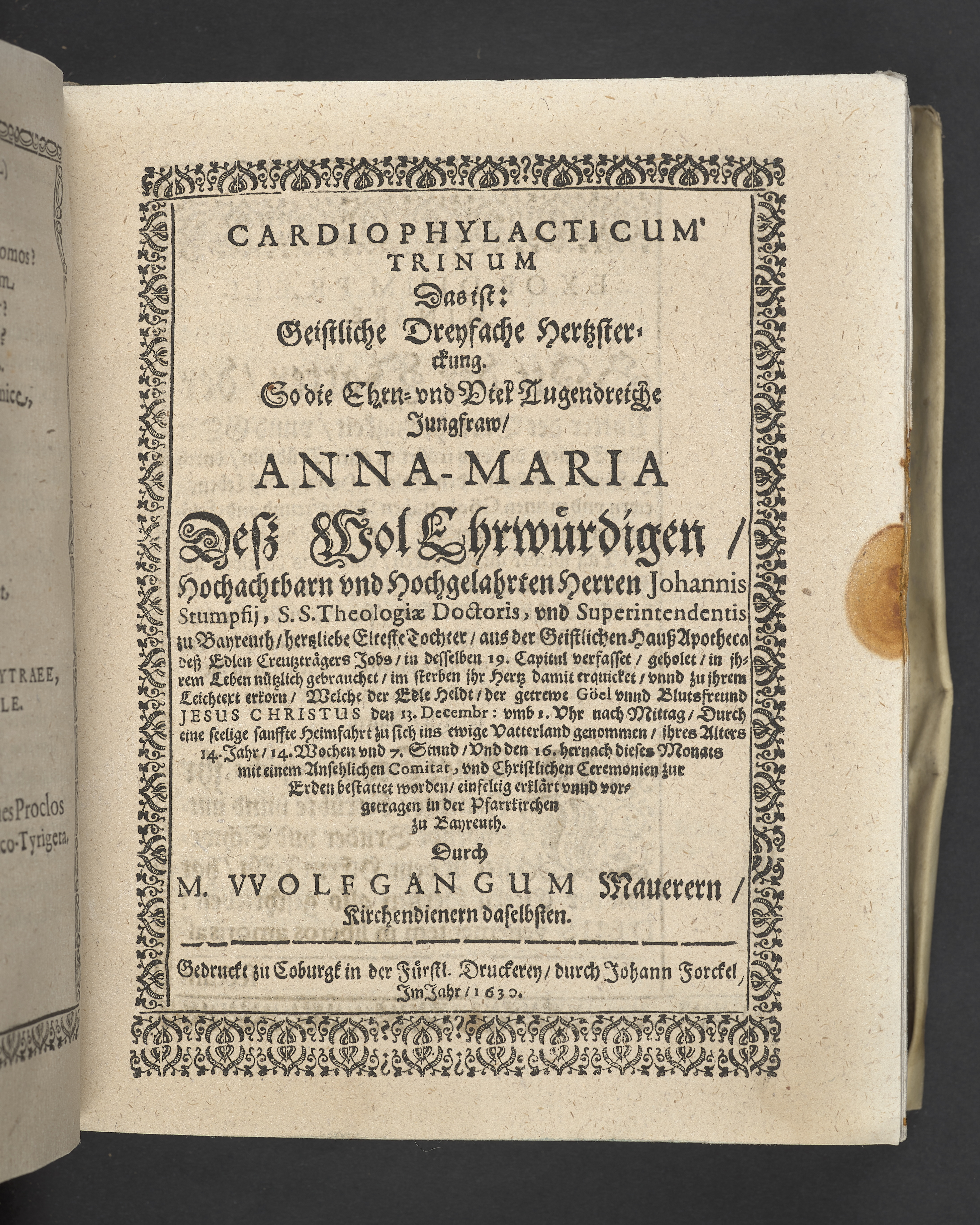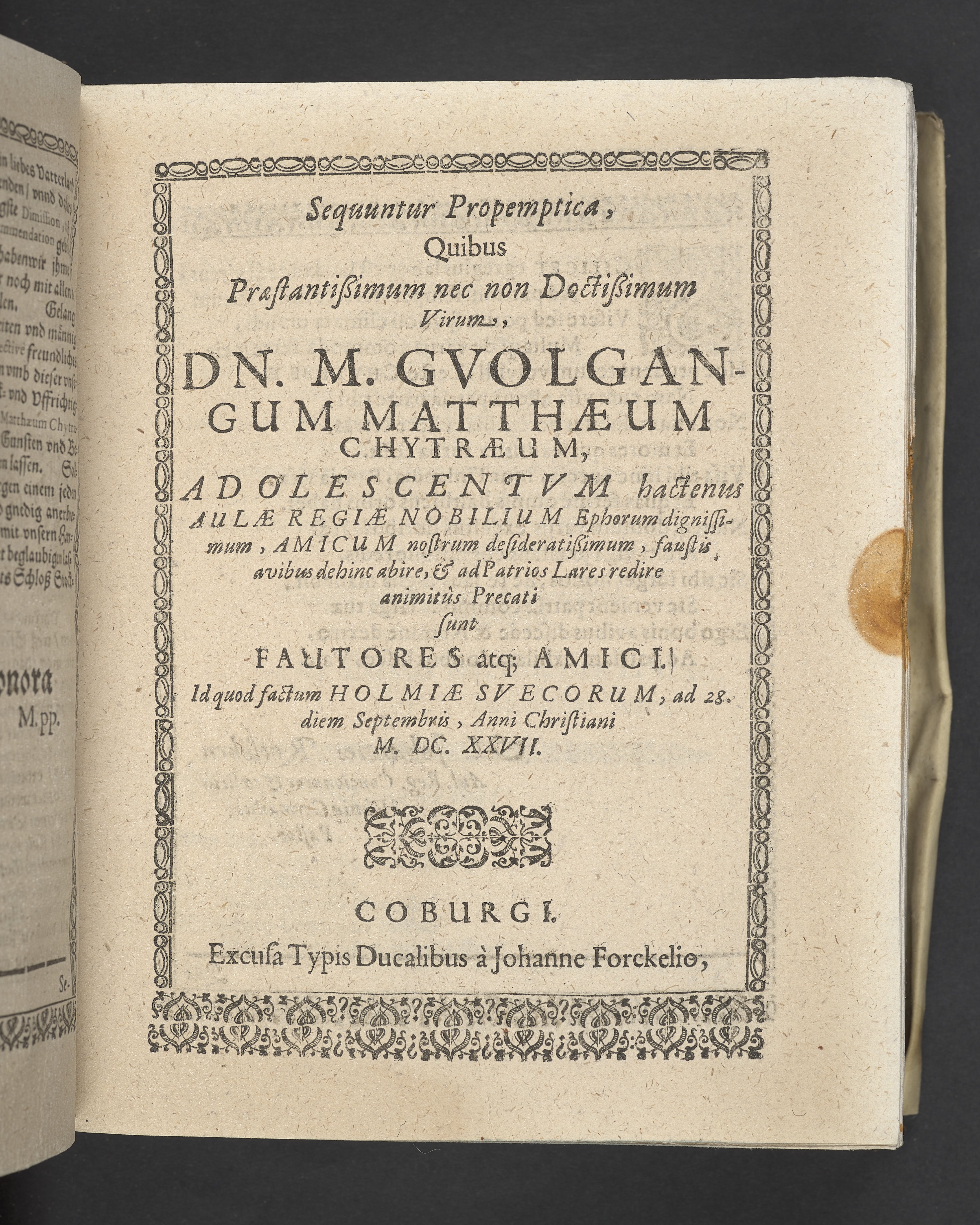 Triga concionum funebrium Drey christliche Leichpredigten, dern die zwo ersten gehalten uber dem... Todt... M. Guolfgangi Matthæi Chytræi... Die dritte... der... Jungfrawen Annæ Marien, dess... Herrn... Johann Stumpfii... Tochter... Durch Vitum Albinum... M. Zachariam Seidelium... und M. Guolfgangum Mauerern... Gedruckt zu Coburgk in der fürstl. Druckerey, durch Joh. Forckel... 1630.