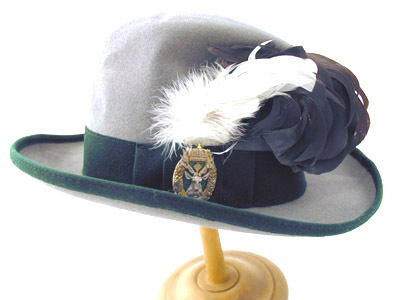 Grå jakthatt av filt. Mörkgrön rand runt brättet och ett likadant band runt kullen. Flera vita och mörka fjädrar fastsatta innanför bandets rosett. Brosch fastsatt i rosetten. En krans krönt med en sluten krona och på undersidan 50. I kransen en ren på grön bakrund. På insidans foder finns en 50 mm lång firmastämpel i svart. I ovansidan av en cirkel står HOFLIEFERANT SM DES KAISERS u. KÖNIGS. På undersidan: 157. Friedrichstrasse. 157. I mitten står: C.W. BORCHERT. Cirkeln är krönt med den tyska kejsarkronan och under cirkels står: BERLIN. W. I svettbandet finns en identisk stämpel, men i guld.