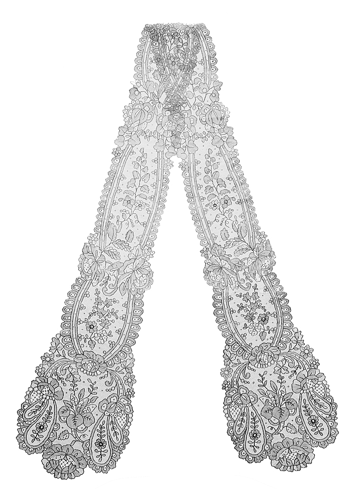 BARB, point d´Angleterre Gråvit. Knypplad och sydd. Avlång, med vidgade ändar. Mönstret bestående av sex ovala fält, vari olika blommor, kvistar med blad samt bärklasar och klängen, kring kanterna två smala band och mellan fälten två stora rosliknande blommor. På vardera änden i mitten en stor mångbladig blomma samt olikformade blad, däromkring en bandornering, avslutad i två öglor med blomma och blad; på vardera sidan och nedtill en stor mångbladig blomma. I ytterkanten tätt sittande tungliknande uddar. Mått: Längd: omkring 95 cm.; bredd: omkring 11 cm. Inköpt av Johanna Kempe hos en spetshandlande i Frankfurt a/M, Wiesbaden eller Mûnchen, mitten av Augusti - mitten av Oktober sannolikt under 1860-talets senare hälft.