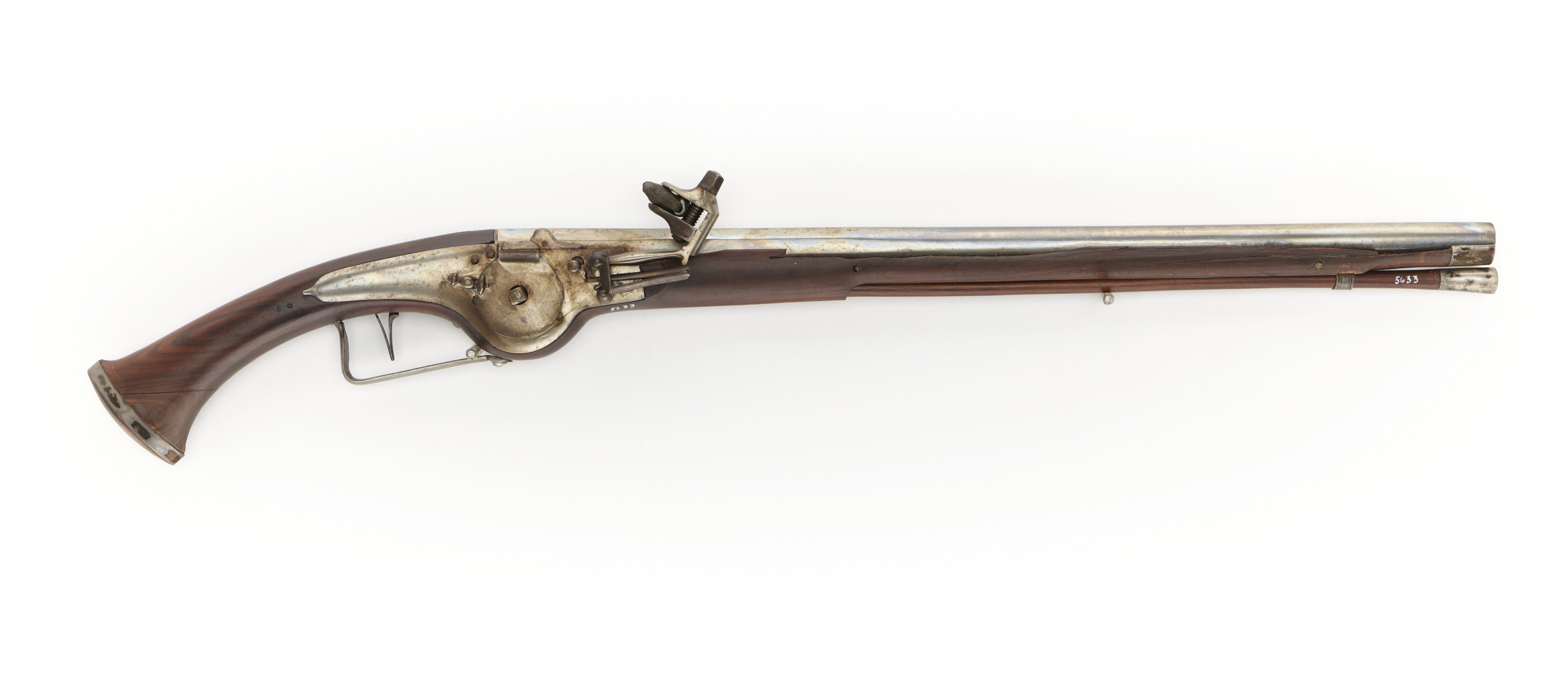 Rund, över kammaren åttkantig, slätborrad pipa. På kammaren stämpel med "IIC" under kungahuvud (Stöckel nr 3383, Holland (?) ca 1630). Två piphäften. Hjullås. Kullrigt låsbleck, bakåt avsmalnande i tungförsedd spets. Utsvängt för hjulet. Hjulet fasthållet medelst krampa kl. 9. Mycket låg, vertikal krutskärm. Hane med lös underkäke, (blånerad). Hanfjäder och fängpanna likaså blånerade. Vertikalhjulstudel. Hel stock av jakaranda . Kolv med spetsovalt tvärsnitt, runt bakre delen ett slätt silverband. Kolven utsvängd för hjulet. Två låsskruvar. Pipstiften ej ursprungliga. Näsband och rörka av silver. Enkel varbygel. Fjäderbelastad avtryckare. Tillbehör: Laddstock av jakaranda, doppsko av silver. Svavelkis i blymantel. Märkt: 80 bakom låsblecket, stanstyp 5376. 9 ristat vid låsskruvarna.