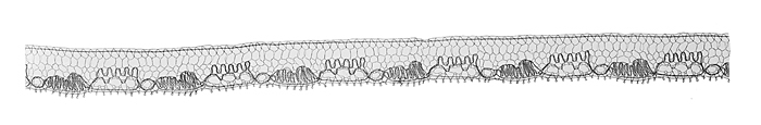 SPETS, blond Blåvit. Knypplad. Mönstret bestående av en smal kantbård med tvåflikiga bladkanter, omväxlande med fyra hål med en vågranka. Nedre kanten nästan rak, med pikotavslutning, den övre genomdragen med en vit fin silkestråd. Mått: Längd: omkring 95 cm.; bredd: omkring 1,4 cm. Inköpta av Johanna Kempe på 1860- eller 1870-talet hos en handlande i Stockholm.
