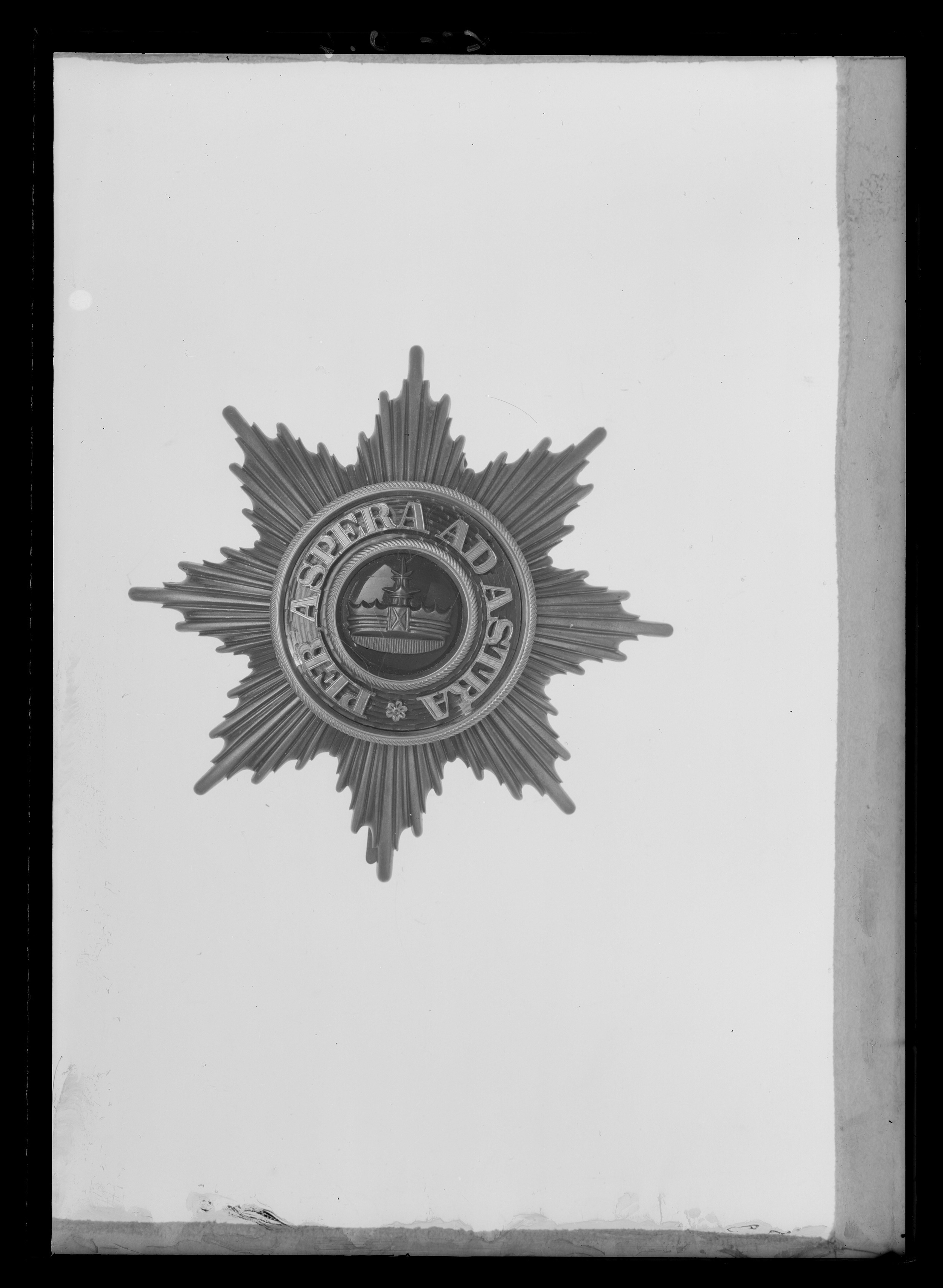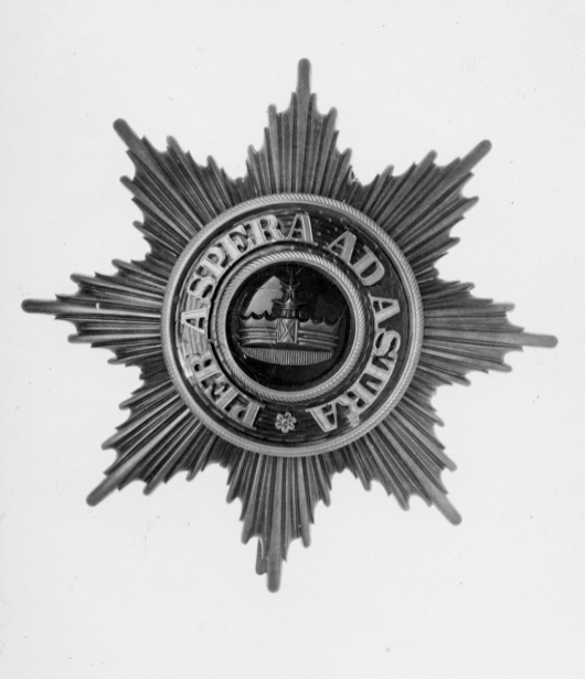 Åttauddig strålstjärna av silver, varannan stråle välvd, varannan skålad. Välvd medaljong täckt med blå emalj, därpå den grönemaljerade Wendiska kronan i relief. Däromkringen guldkantad ring, täckt med röd, genomsynlig emalj med påsatt guldtext: "PER ASPERA AD ASTRA". Baksidan slät, på medaljongens baksida stämplat: "H. ROSE // SCHWERIN". Vertikalt placeradsäkerhetsnål.