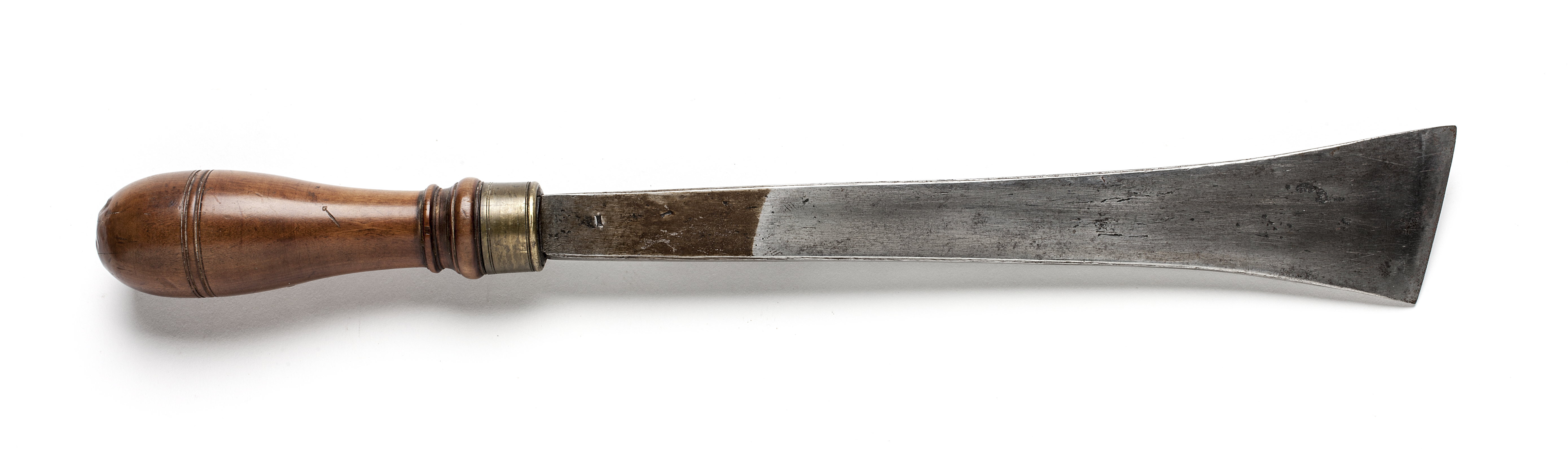 Klinga med rektangulär genomskärning, avfasade kanter. Stämplat på klingan: "1" med stans nr 5375. Sned egg. Svarvat skaft av päronträ, med två vulster nedtill ("skoklostertyp"). Mässingsring.
