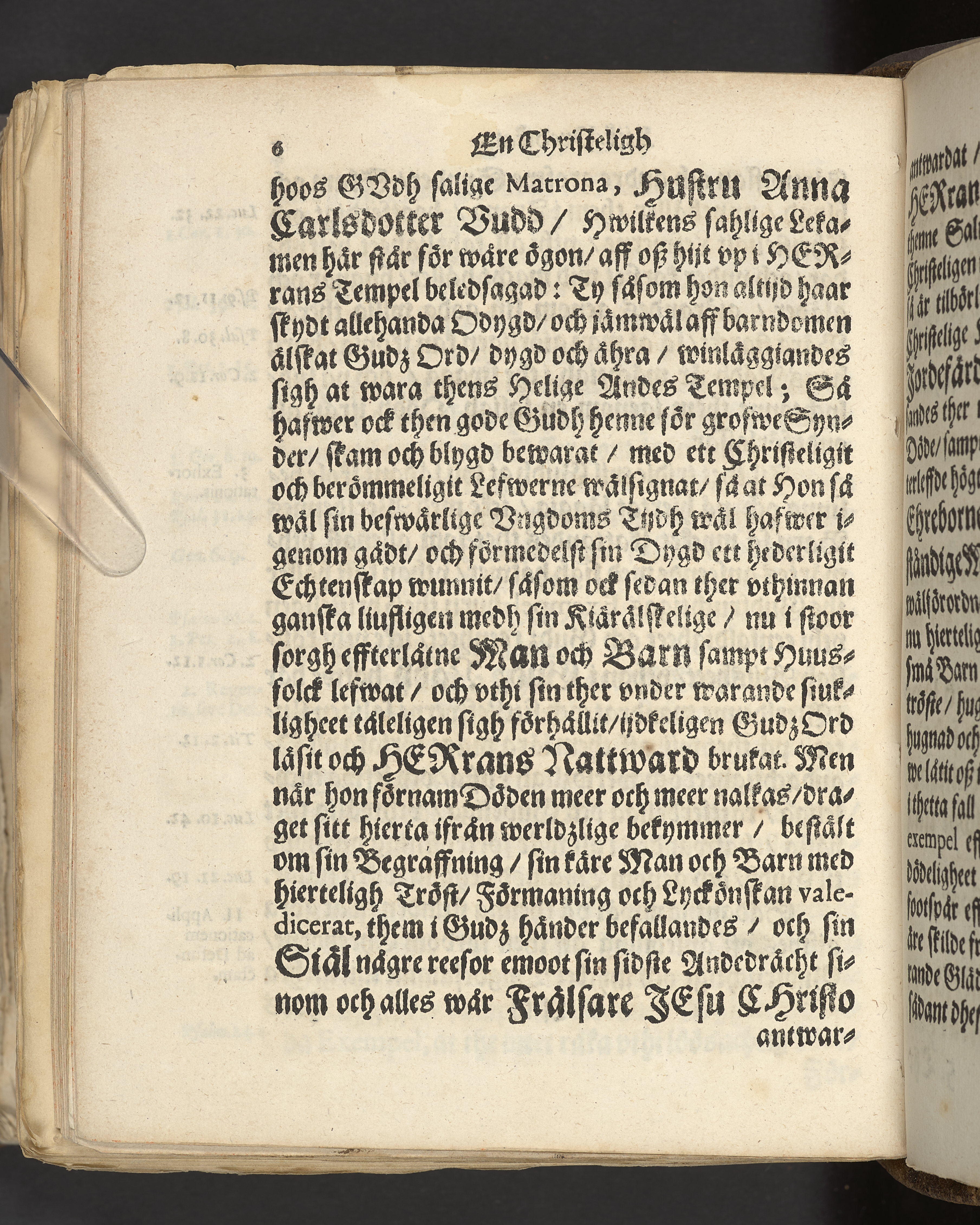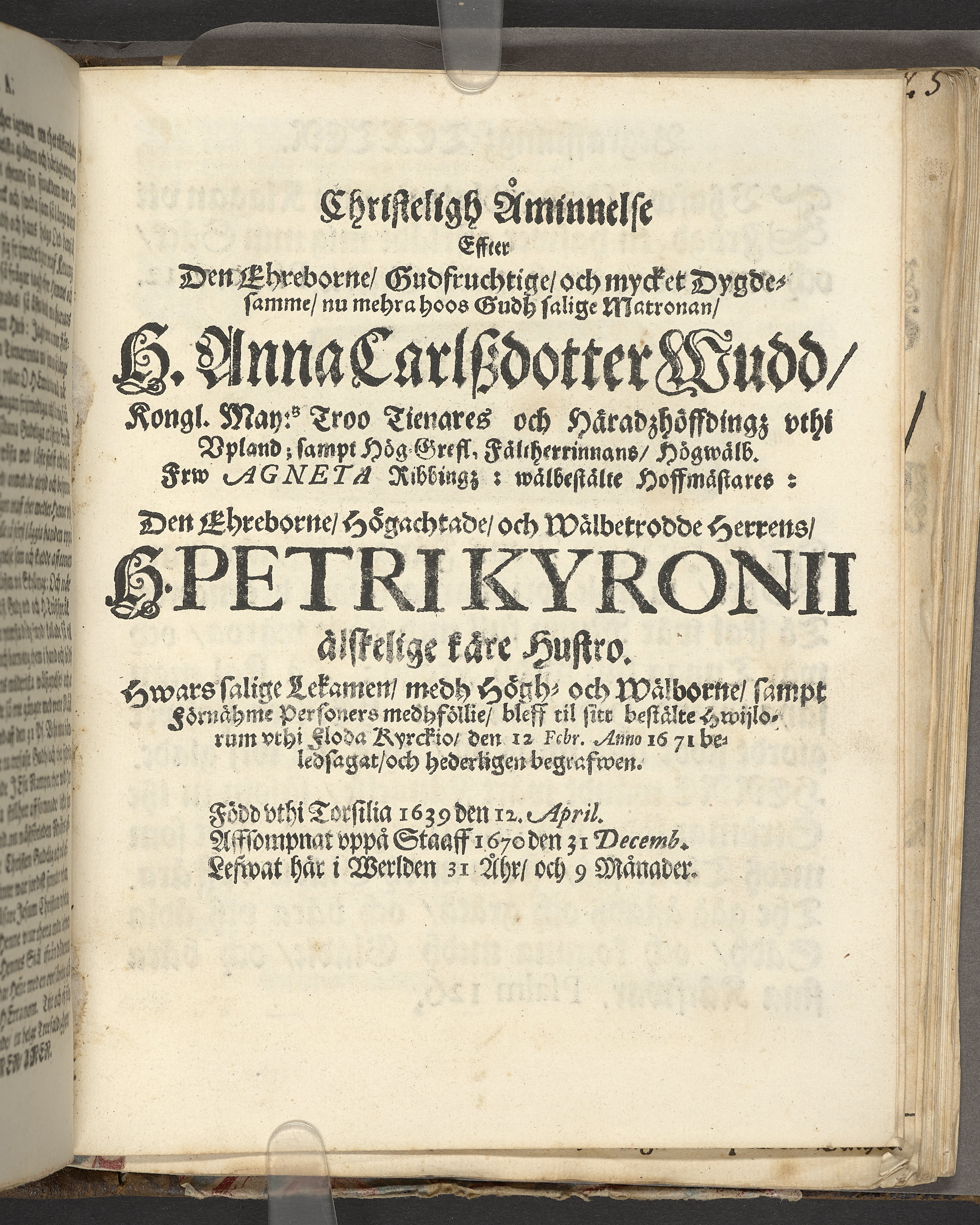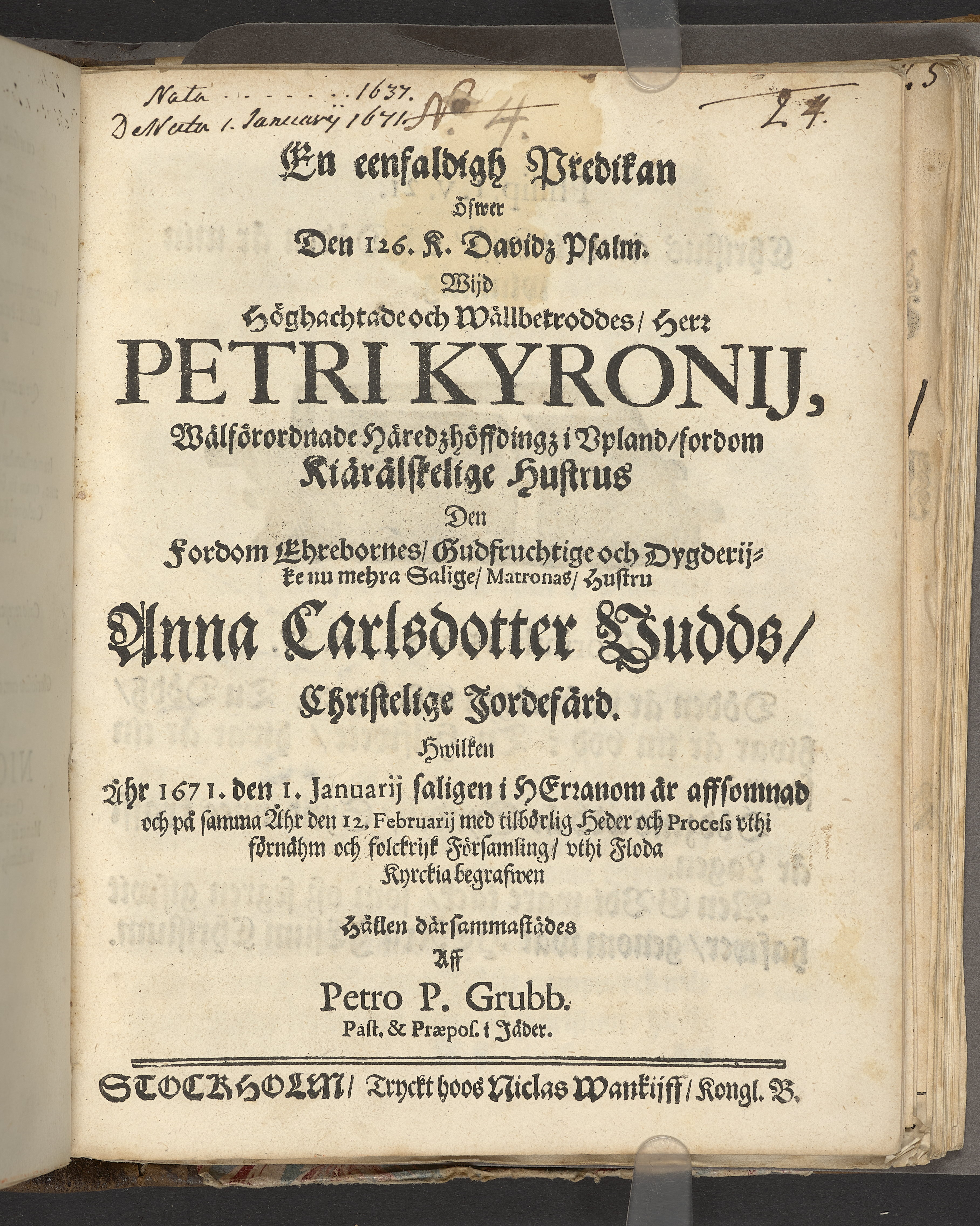 En eenfaldigh Predikan ... wijd höghachtade och wälbetroddes, herr Petri Kyronij, wälförordnade häredzhöffdingz i Vpland, fordom kiärälskelige hustrus den fordom ehrebornes, gudhfruchtige och dygderijke nu mehra salige, matronas, hustru Anna Carlsdotter Vudds, christelige jordefärd. Hwilken åhr 1671. den 1. januarij saligen i herranom är affsomnad och på samma åhr den 12. februarij med tilbörlig heder och process vthi förnähm och folckrijk församling, vthi Floda kyrckia begrafwen hållen därsammastädes aff Petro P. Grubb .