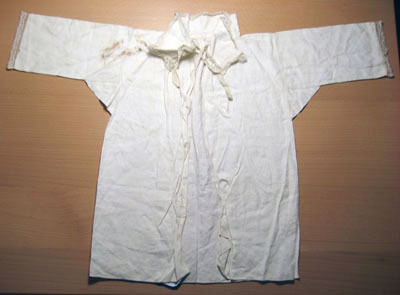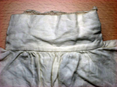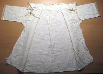 Barnskjorta i fint vävt linne. Skjortan har en rak skärning med raka ärmar sydda i ett stycke. Det går en Spetskant runt kragen och på varje ärm som är 12 mm bred. Kragen som är 48 mm hög och 350 mm lång, knyts framtill med två stycken band som är 7 mm långa och sju mm breda. På ryggen samt på framsidan är det rynkat vid kragen. Halsen har ingen rundning.