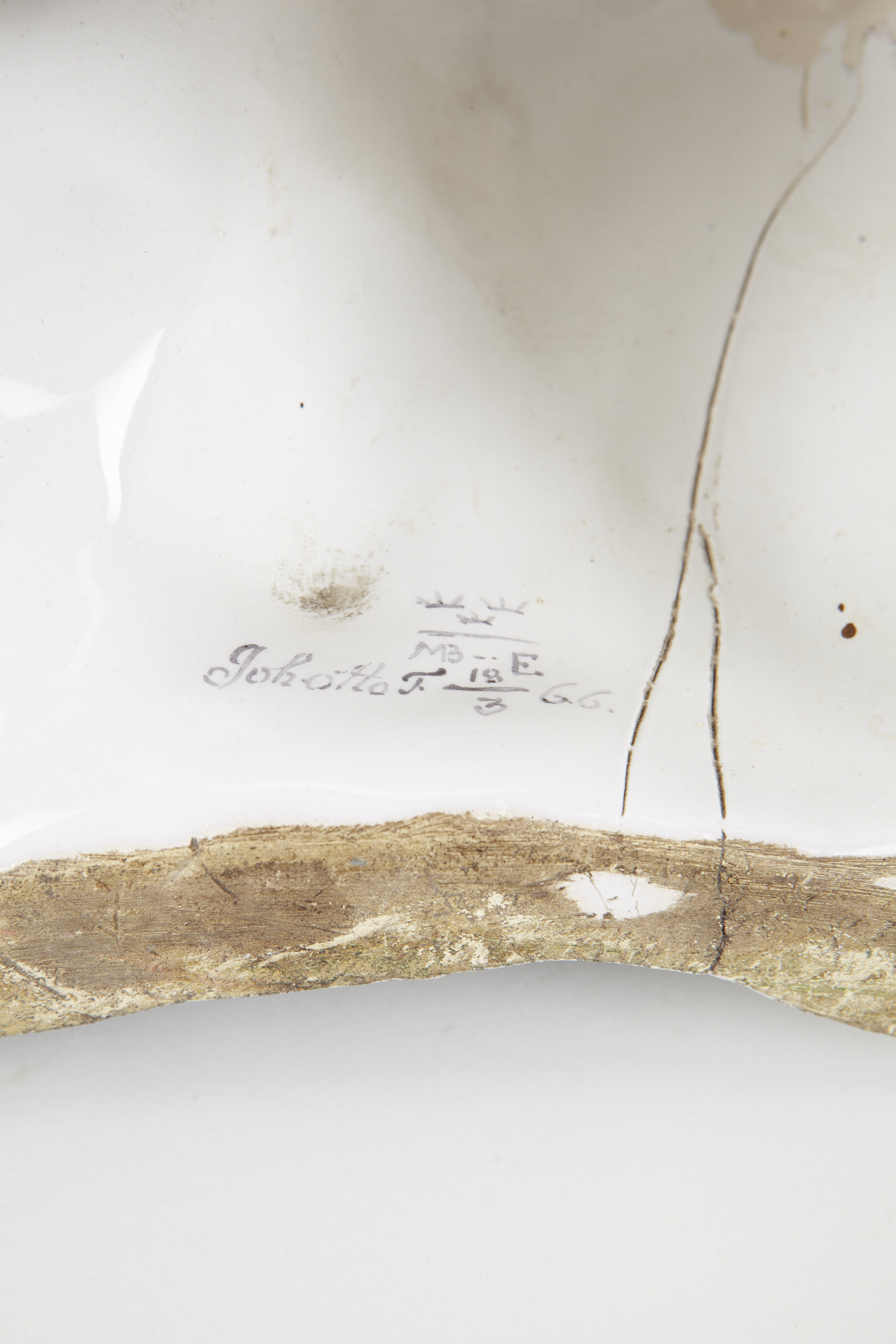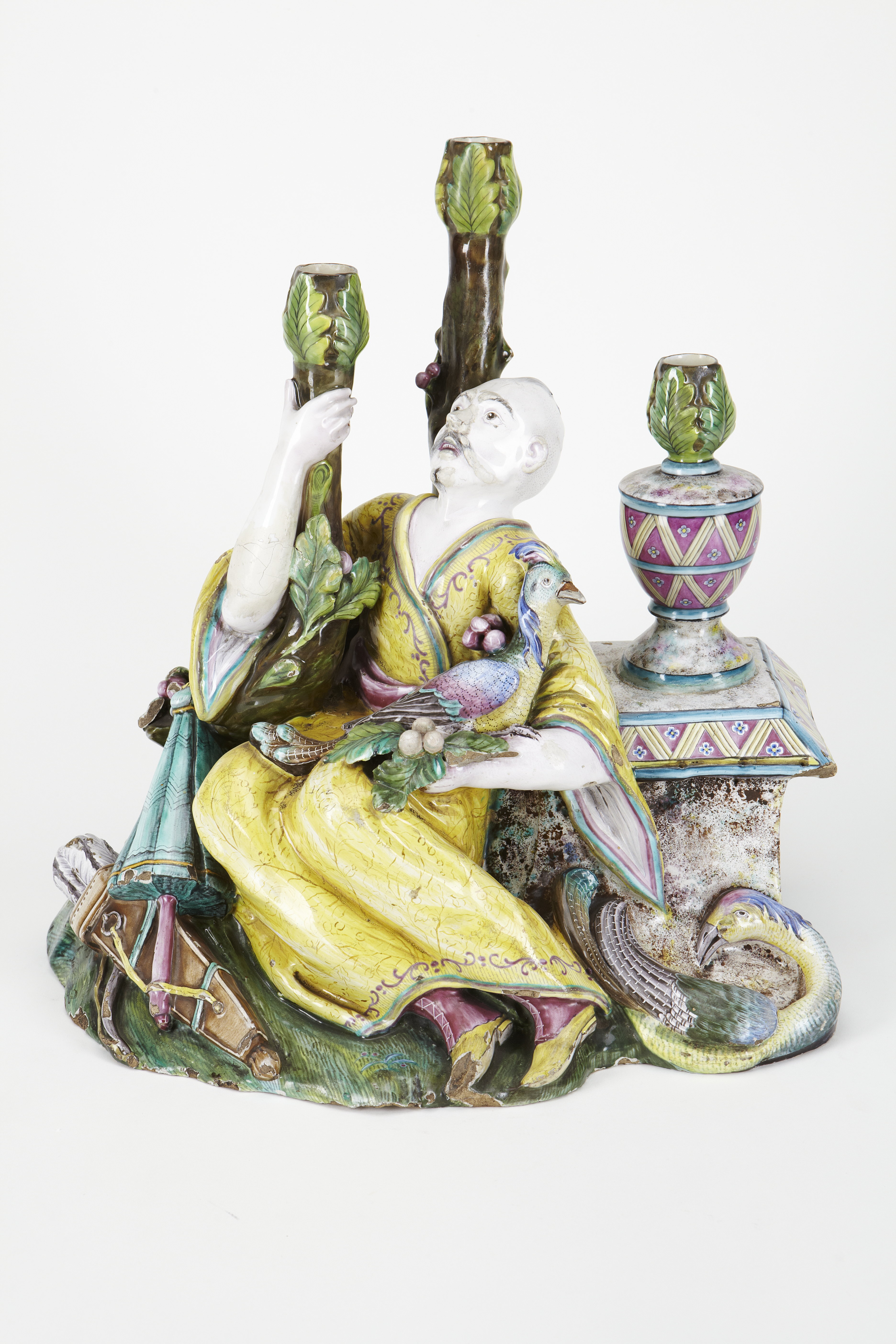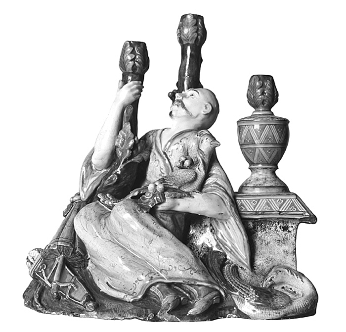 - I form af en sittande kines, lutande sig bakåt mot ett postament och ett träd, hvars stam delar sig i två grenar, den bortre längst, hvardera afslutad i en ljuspipa, å en urna å postamentet dessutom en dylik; på kinesens vänstra lår och arm en fågel (fasan), på marken vid ena sidan ett pilkoger, en båge och en parasoll, vid den andra en död fågel (fasan). Det hela på urholkad fotplatta af oregelbunden långsträckt form. Stödytan endast delvis glaserad. Dekor: I muffelfarger på tennglasyr. Godset blekgult. Kinesen med håret afrakadt utom å en fläck vid främre delen af hjässan, hvarifrån en lock faller bakåt, långa mustascher samt pipskägg, allt i grått. Framtill spetsigt urringad fotsid rock i gult med halflånga vida ärmar, rocken med ett otydligt mönster af rankornament i brunt samt en kantbård af gredelina bladslingor innanför en rand i grönt mellan två i gredelint, ärmarna med foder i grågredelint samt foderkant i grönt och gredelint, kring lifvet en gördel i gredelint; gula skor med framtill snörda damasker i rödgredelint. Trädet med roten vid postamentet samt svängdt i en kraftig båge mot kinesens högra sida och uppåt, där delande sig; kinesen med högra handen upplyft samt hållande om öfre delen af främre trädgrenen. Barken mörkt brungrön, löfven par-flikiga, i grönt och gulgrönt med nerver i mörkbrunt; vid fyra löfgrupper fruktlik-nande bildningar i gredelint, kring samtliga ljuspipor en krans af fyra uppstående löf. Fågeln vänd åt höger, med lång nacktofs i blått, gult och rödgredelint, grönt hufvud, lång gul hals, gult bröst, grön rygg, vingar i blått, rödgredelint, grönt och mörkbrunt, stjärtfjädrar långa, med ljusgröna ändar. Mellan öfre delen af fågelns rygg och kinesens vänstra armhåla en fruktklase som de å trädet; i kinesens vänstra hand en kvist med löf och tre runda frukter i grått (ej original). Pilkogret brunt med ljusare kanter och gul bärrem samt liggande med pilstjärtarna bortåt vänster, dessa senare i grått. Bågen i grågredelint, liggande under kogret, strängen gul. Parasollen grön med rödgredelin käpp samt mönstrad med smala svarta sicksack-linjer, upptill och nedtill en rand i gult. Den döda fågeln liggande i en båge utåt höger; hufvudet jämte halsens undersida och kroppen i gult, nacktofsen i rödgredelint och blått, halsens utsida och främre delen af vingarna i grönt, dessas framkant dock i blått, vingarna i öfrigt jämte stjärten i ljusare och mörkare brunt, den senares spets dock i grönt. Postamentet med fyrsidigt tvärsnitt och tjock öfverskifva, utspringande å de två framtill synliga kanterna samt där snedt utåtfallande; färgen ljust grågredelin, småfläckig i brunt och grönt, utmed samtliga kanter (utom den främre vertikala) en rand i grönblått, å de utåtfallande af skifvans kanter ett mönster af ett tredubbelt sicksackband i gult mot botten i rödgredelint, i hvarje vinkel en blomma med gul midt samt fyra blad i blått med hvit kant. Längs nedre kanten sju runda hål (framtill tre, å utsidan fyra), i hvilka ursprungligen hängt klockor. Urnan svagt bukig, å utsvängd fot, rundt hvars öfverdel en spetsryggig list, denna liksom fotens nederdel i grönblått; kring urnans midt och öfverdel en bård i samma färg. Urnan med dekor som den å skifvans utåtfallande kant, sicksackbandet dock smalare; foten och skuldran med dekor som den å postamentet. Rundt ljuspipans nedre del en ring som den å fotens öfverdel. Fotplattan med målning i grönt, föreställande gräs, vid kinesens högra fot en liten målad blomma med tre böjda smala blad samt tre små runda blommor i rödt. Å fotplattans insida i grågredelint signering: 0 -AU-E (M B = Marieberg, E = Ehrenreich, Joh. Otto F = Johan Otto Franzén, en af fabrikens mest framstående målare, verksam från 1760-talets förra hälft till sin död 1772. Dateringen, 18/8 66, anger, att föremålet var färdigmåladt denna dag.) Höjds 33.2 cm. Fotplatta, längd: 34 cm.; bredd: 25 cm. Anm. Näsan och ögonbrynen lagade, högra underarmen afslagen och lagad; å högra fotspetsen, den lefvande fågelns näbb samt delvis å löfven flisor urslagna. Från 1766. —¦ Fabriken grundlagd med privilegium 1759 af hoftandläkaren Johan Eberhard Ludvig Ehrenreich, hvilken innehade ledningen till någon gång under år 1766 (enligt signeringen å denna pjäs var Ehrenreich ännu kvar den 18 Mars), då han efterträddes af Pierre Berthevin, som innehade chefskapet till nyåret 1769, då ledningen öfvergick till Henrik Sten. Afsikten var från början att framställa äkta porslin, hvilket endast delvis lyckades. Fabriken såldes 1782 till ägaren af Rörstrand, majoren Elias Magnus Nordenstolpe; verksamheten upphörde 1788. Liknande föremål afbildadt och beskrifvet i G. H. Stråle: »Mariebergs historia och tillverkningar 1758—1788», Stockholm 1880, sid. 55 och i samma verks »Förteckning å Rörstrands samling af Mariaebergs tillverkningar» som n:r 96 å sid. 36. Inköpt af Wilhelmina von Hallwyl, f. Kempe, å auktion hos Aktiebolaget H. Bukowskis Konsthandel, Arsenalsgatan 2, Stockholm, 24 och 25 September 1923. Katalog 242 n:r 270, se räkning 26 September 1923. Betald sistnämnda dag, se Hufvudbok (hushållskonto). Pris: Kr. 2925, se räkning. Känd tidigare ägare, se auktionskatalog 242: Ingeniören och godsägaren Carl Robert Lamm, Näsby, Täby socken, Uppland, f. 4 Augusti 1856, gift 31 Mars 1900 med Dora Helena Mathilda Upmark, f. 4 Februari 1880; af ingeniör Lamm inköpt 18 Juli 1900 af ambulerande danske konsthandlaren M. Marcus för kr. 400, se bref från ingeniör Lamm 17 April 1930. Af ingeniör Lamm försåld å ofvannämnda auktion.