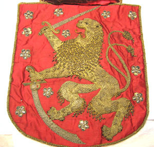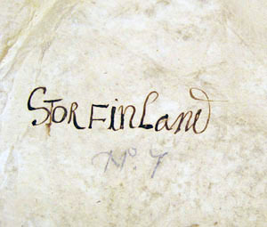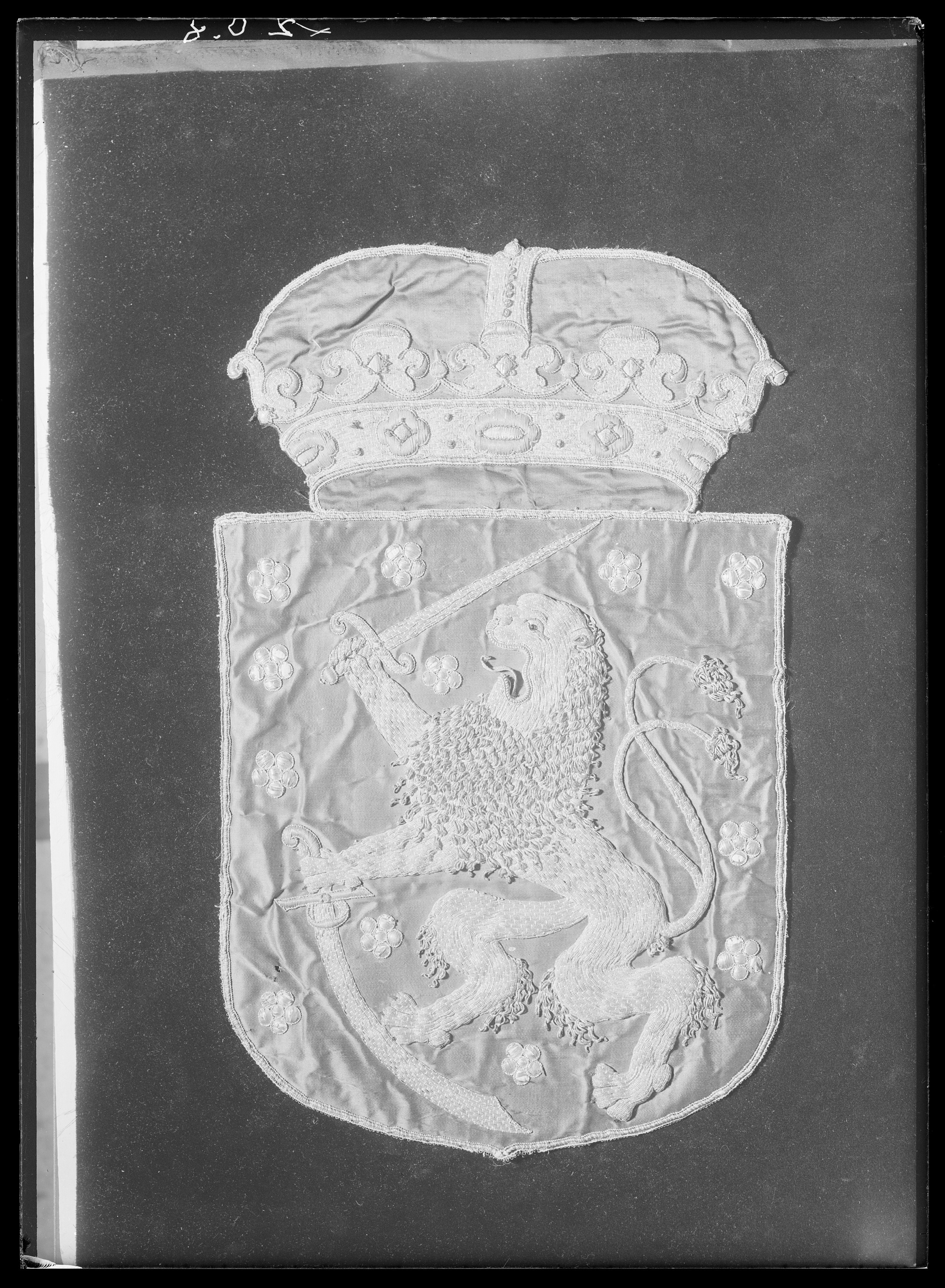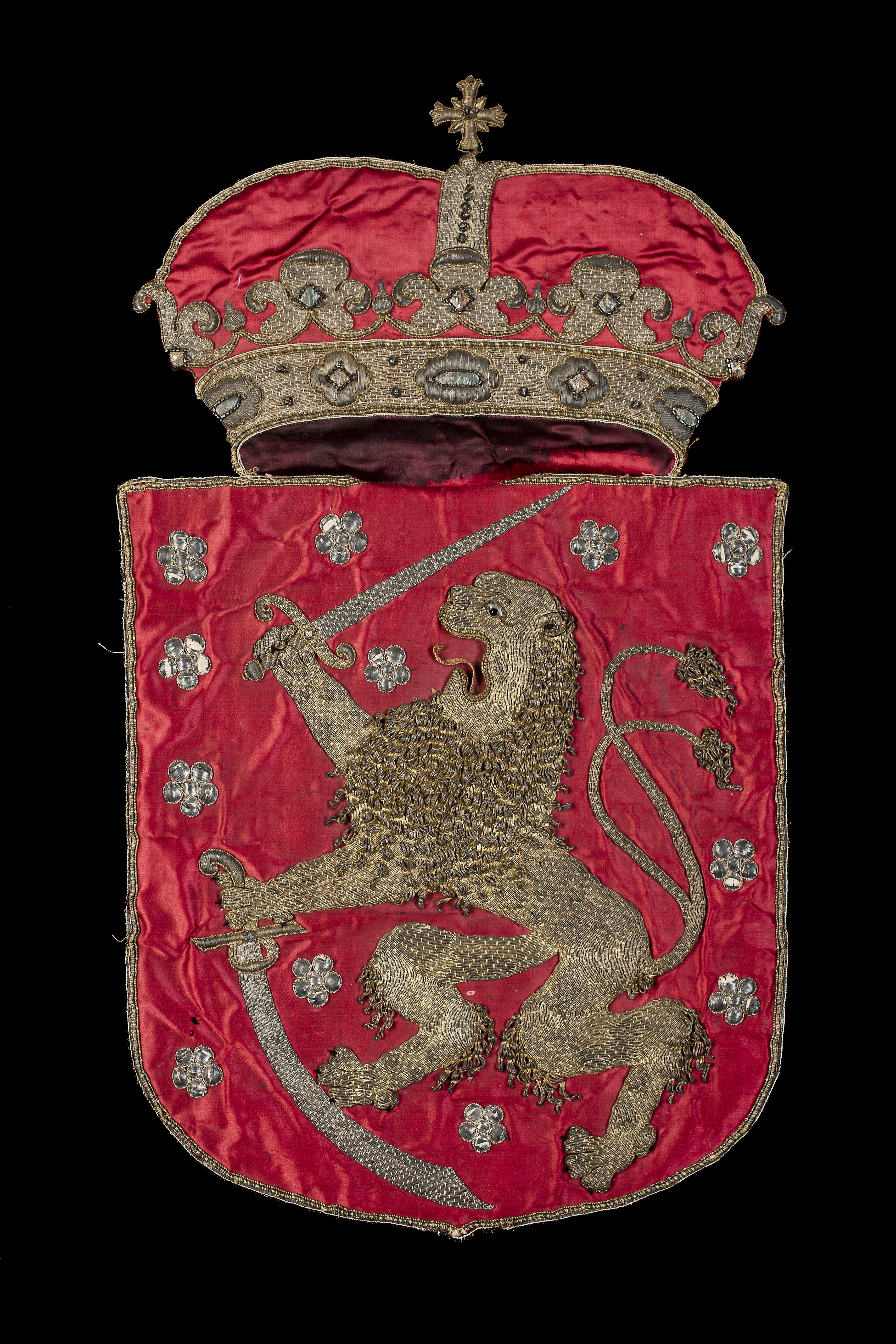 Storfinlands vapensköld av röd sidenatlas med reliefbroderi, krönt av en furstlig krona med tre byglar. Mitt på skölden är broderat ett stående dubbelsvansat lejon med öppet gap, 340 x 264 mm. Lejonet är en applikation, broderat av förgylld silvertråd i relief med en botten av silkestråd. Silvertråden är nedsydd med gula silkesstygn på de delar av broderierna som varit förgyllda. Man samt hårbeklädda partier som svans och ben är av förgylld, krusad silvertråd. Lejonets utsträckta tunga är av gul silkestråd, ursprungligen röd i färgen. Tänderna är av ben och ögat är av silverlan samt en svart glaspärla. Klorna är av svart silkestråd. I höger tass håller lejonet i ett svärd vars klinga är av silvertråd medan fästet är av förgylld silvertråd. I vänster tass håller lejonet en böjd värja av silvertråd med fäste av förgylld silvertråd. Tolv rosor av silverlan i relief är broderade över skölden, runtom lejonet. Skölden kantas av en 6 mm bred bård av en tjockare och en smalare snodd av virat silverlan, ytterst kantat av ett silverlan. På bården förekommer silvertråd utdragen i uddar. Skölden kröns av en sluten krona med ett bottentyg av röd sidenatlas samt svartmålad sidenatlas för att markera öppningen. Kronan har en 40 mm bred kronring av förgylld silvertråd. Kronringen pryds av fem juvelliknande broderier av silvertråd och silverlan och nio små juvelliknande broderier av kantiljer av silvertråd. Kronan har en mittbygel, b. 30 mm, av förgylld silvertråd, kantad av en snodd av silverlan, samt med sex små prickar av kantiljer av silvertråd mitt på. Kronan har fem spetsar broderade i ett stiliserat organiskt mönster med voluter av förgylld silvertråd. Kronan kantas ytterst av samma bård som skölden dvs av silverlan och två snoddar av virad silverlan. Till kronan hör ett löst kors, 40 x 40 mm, i relief av förgylld silvertråd samt silverlan mellan korsarmarna, kantat av gul silkestråd och silvertråd. Skölden har ett mellanfoder av beige lärft, klätt med gulnad makulatur, skarvad av tre stycken. Mitt på makulaturen en påskrift med svart sepia: "STORFinland" "No 7". Kronan har ett foder av beige linnelärft.